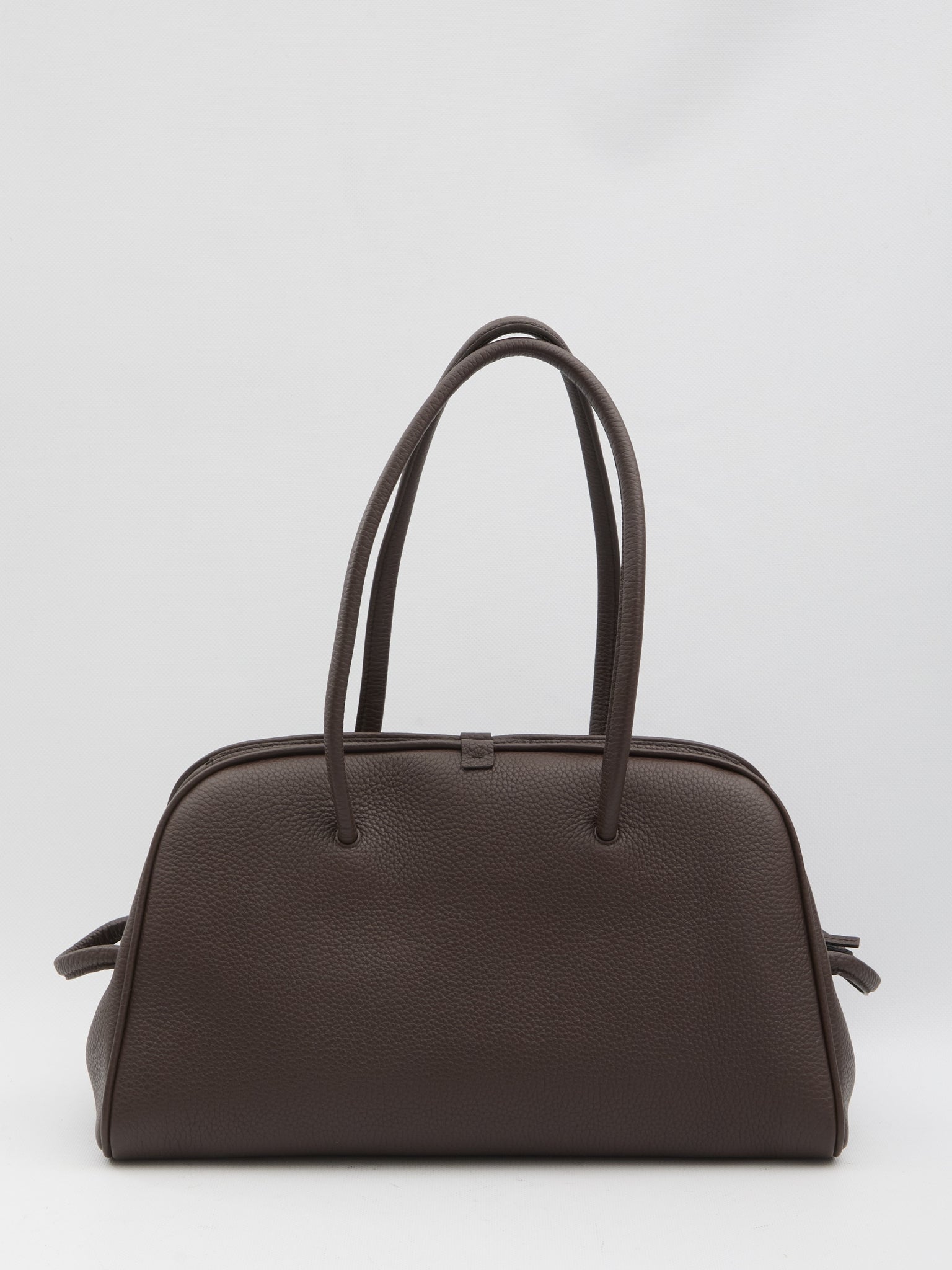 Dark brown grained leather bowling bag. It features two fixed handles with a bow detail, side loops, a magnetic closure with a double-slider zipper, one main compartment, an internal zip pocket, and a cotton lining. Dustbag included. Any imperfections in the leather should not be considered manufacturing defects but rather a characteristic of the material.