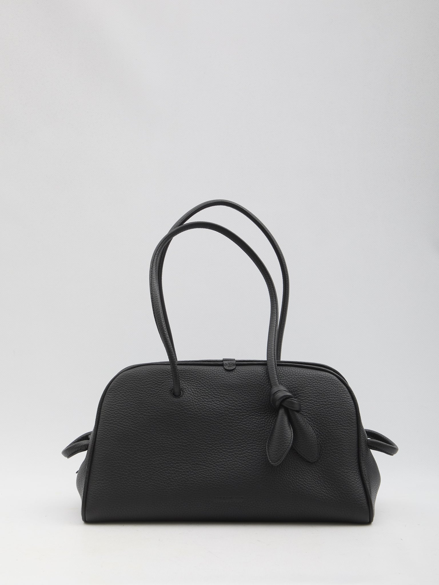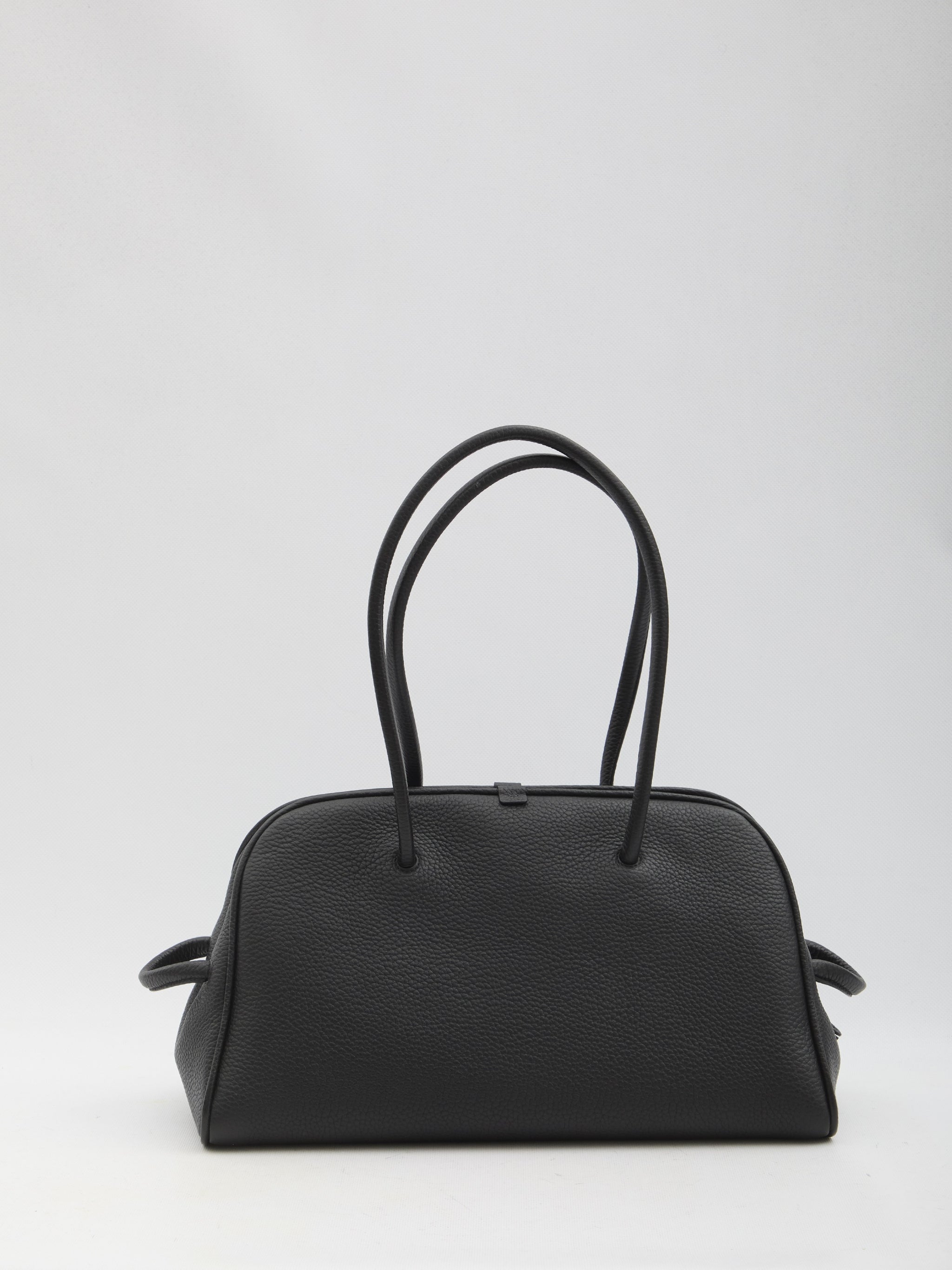 Black grained leather bowling bag. It features two fixed handles with a bow detail, side loops, a magnetic closure with a double-slider zipper, one main compartment, an internal zip pocket, and a cotton lining. Dustbag included. Any imperfections in the leather should not be considered manufacturing defects but rather a characteristic of the material.