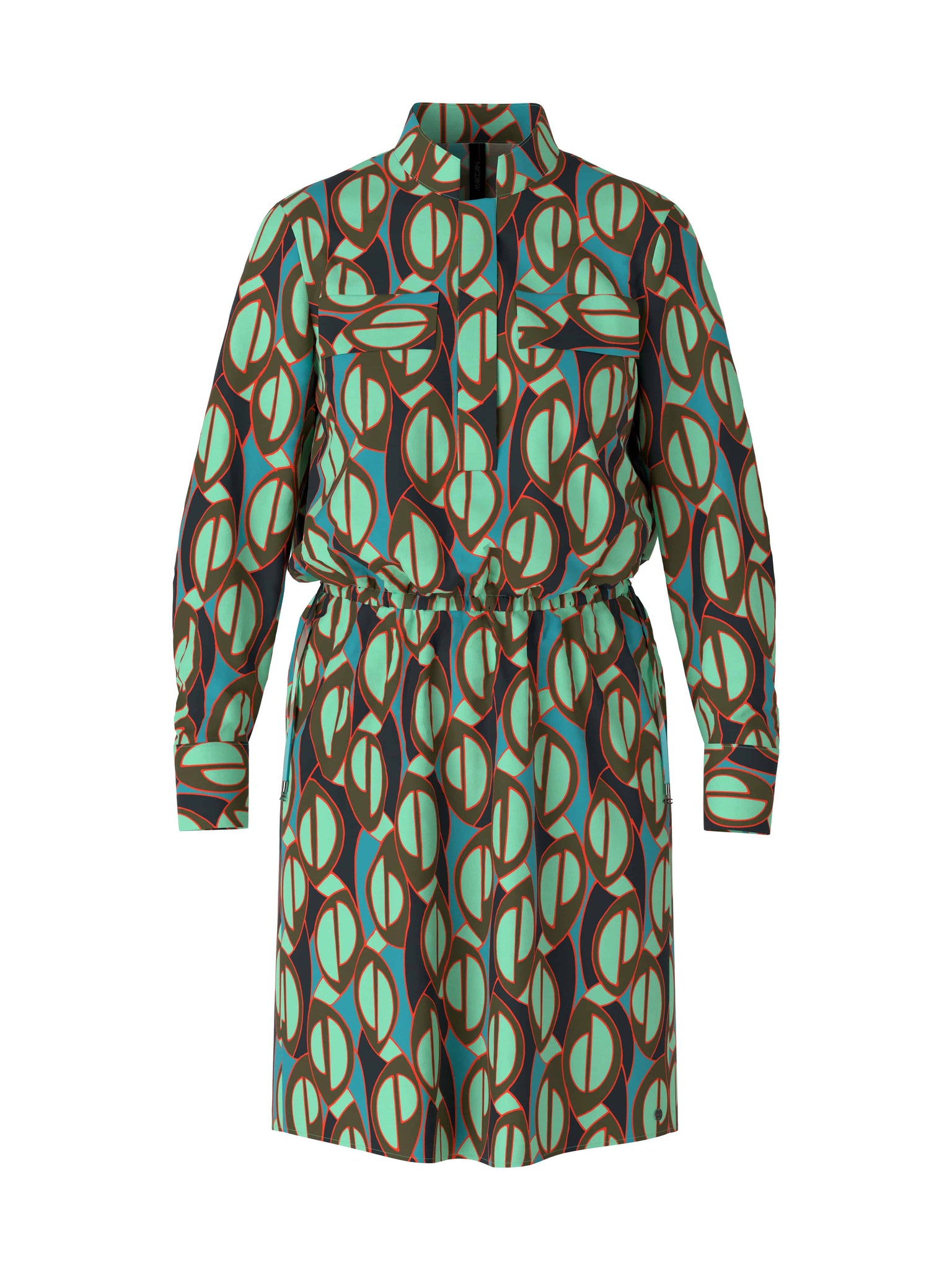 Ein farbenfrohes Dessin kennzeichnet allover den Look dieses Minikleides. Es kommt mit halber Knopfleiste und Stehkragen. Brustpattentaschen und Manschettenärmel bringen einen aktuellen Business-Stil. Das Kleid ist aus weich fließender Viskose in lockerer Silhouette mit elastischer Taillierung gefertigt.
