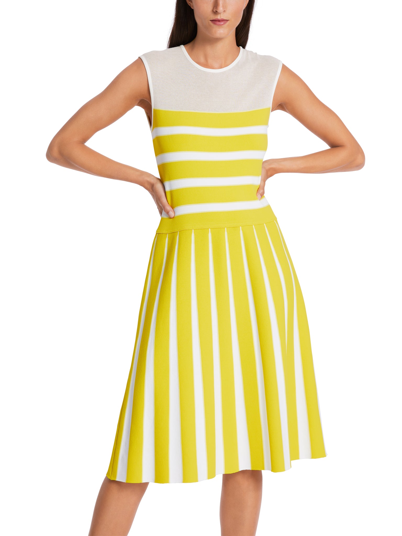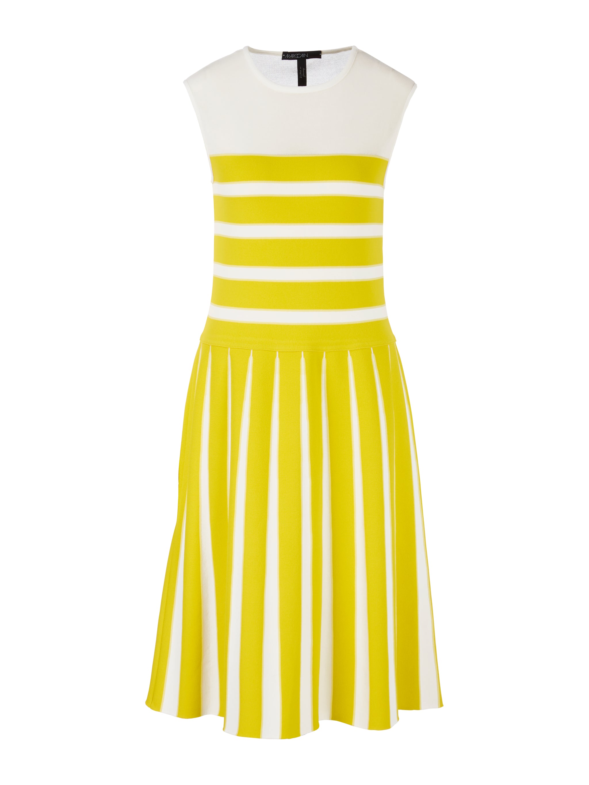 Quer- und Längsstreifen charakterisieren das Dessin dieses Sommerkleides. Der Rumpf präsentiert sich figurnah, während der Rock eine ausgestellte Silhouette mit Falten zeigt. Das Kleid wird in einer Materialmischung mit Viskose und Baumwolle am Standort Deutschland gestrickt und auch veredelt. Die Weiterverarbeitung der einzelnen Teile erfolgt in europäischen Partnerbetrieben. Damit ist das Modell „Knitted in Germany“.