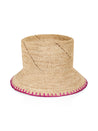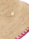 Hut aus 100% Naturstroh. Das Modell ist – ausgehend von der Mitte des Kopfteils – spiralenförmig gehäkelt. Wobei das Kopfteil eine leicht konkave Form hat. Die Krempe hat Glockenform und schließt mit einem kontrastfarbenen Häkelrand ab. Für einen perfekten Sitz sorgt ein Ripsband im Hutinneren.