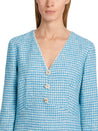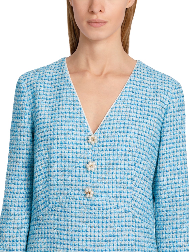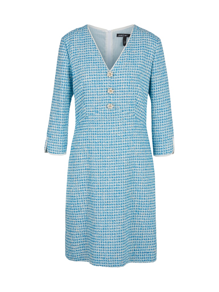Einen Hauch von Nostalgie versprüht dieses Kleid im strukturierten Karo mit seinen Perlenzierknöpfen. Ergänzt wird der elegante Retrostil durch dreiviertellange, rund geschlitzte Ärmel sowie einen V-Ausschnitt. In die feste Materialmischung mit Baumwolle und Viskose ist Lurex eingewebt. Das knielange Kleid hat eine taillierte Silhouette und kommt mit Rückenreißverschluss.