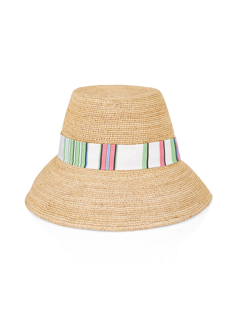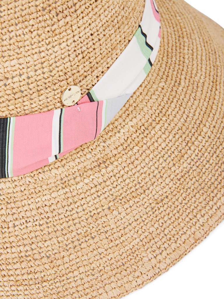 Hut aus 100% Naturstroh. Das Kopfteil ist abflacht und die Krempe kann variiert werden. Sie kann sowohl aufgeschlagen als auch nach unten geklappt werden. Nach unten geklappt erhält der Hut Glockenform. Im Hutinneren sorgt ein Ripsband für einen perfekten Sitz.