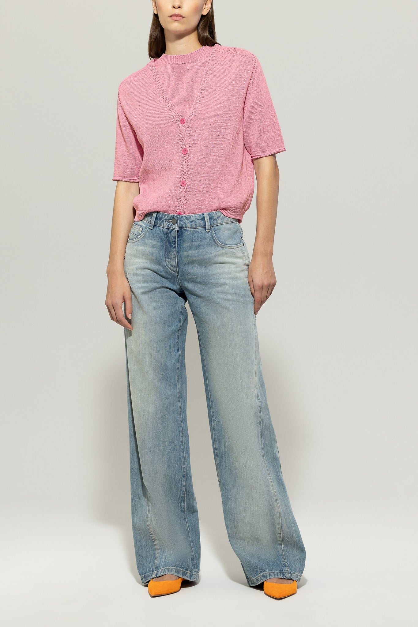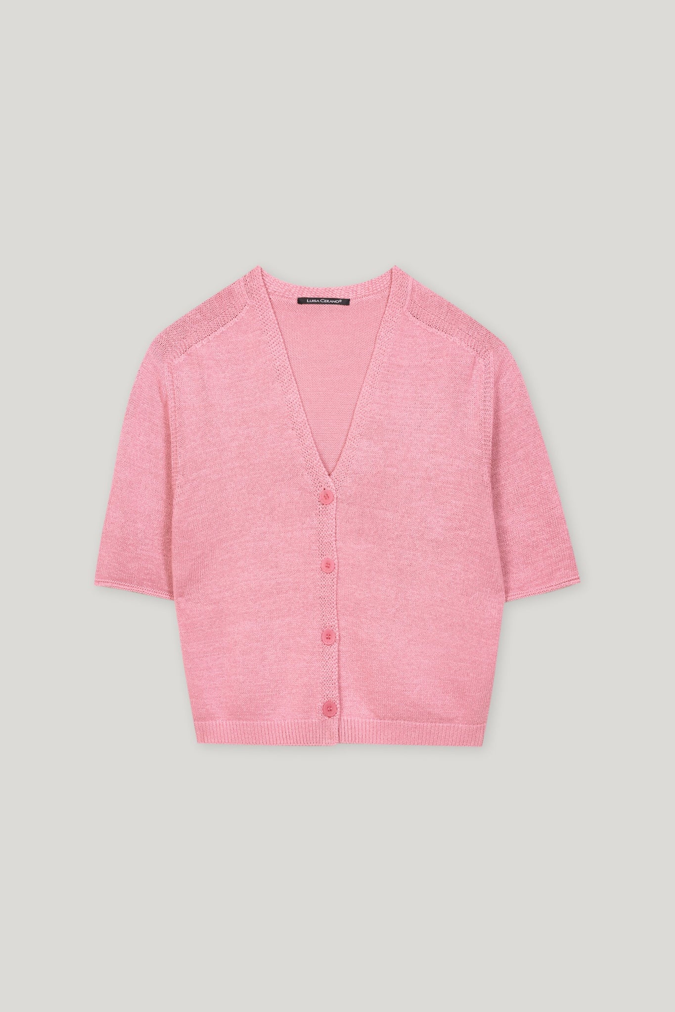 Kurzer Cardigan aus sommerlichem Tape-Garn mit kurzen Ärmeln. Auf der Vorderseite lässt sich die Jacke mit einer Knopfleiste schließen und die Saumkanten sind durch kontrastierende Strickmuster hervorgehoben.