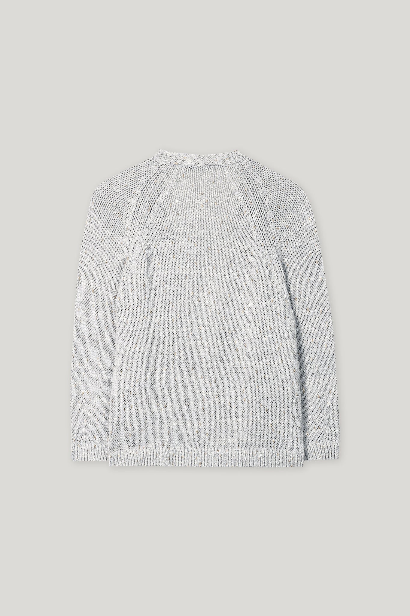 Offene Strickjacke aus glamourös schimmerndem Fancy-Garn auf Baumwoll-Basis mit eingearbeiteten Pailletten. Die verkürzten Ärmel schließen mit elastischen Rippstrickbündchen ab.