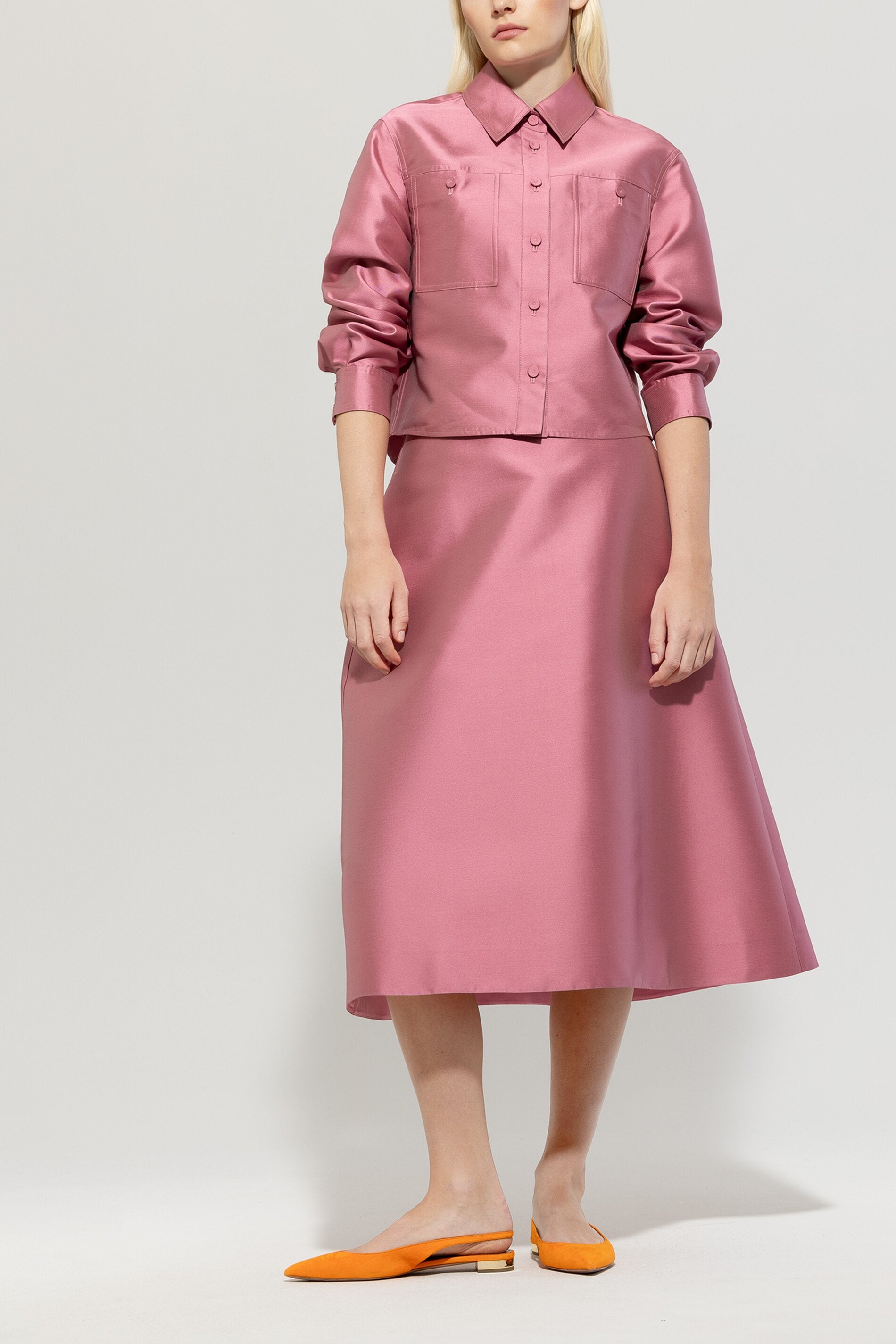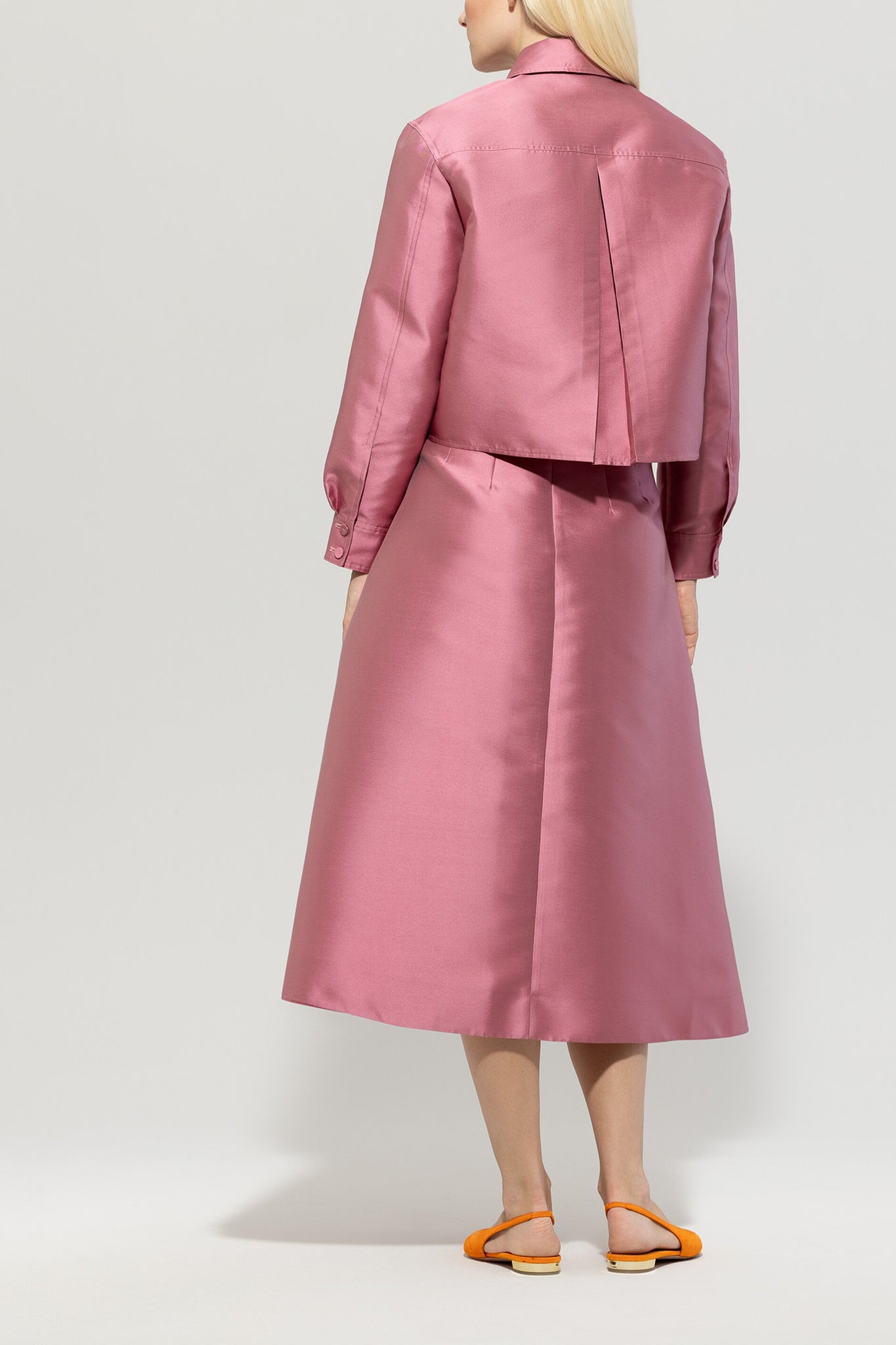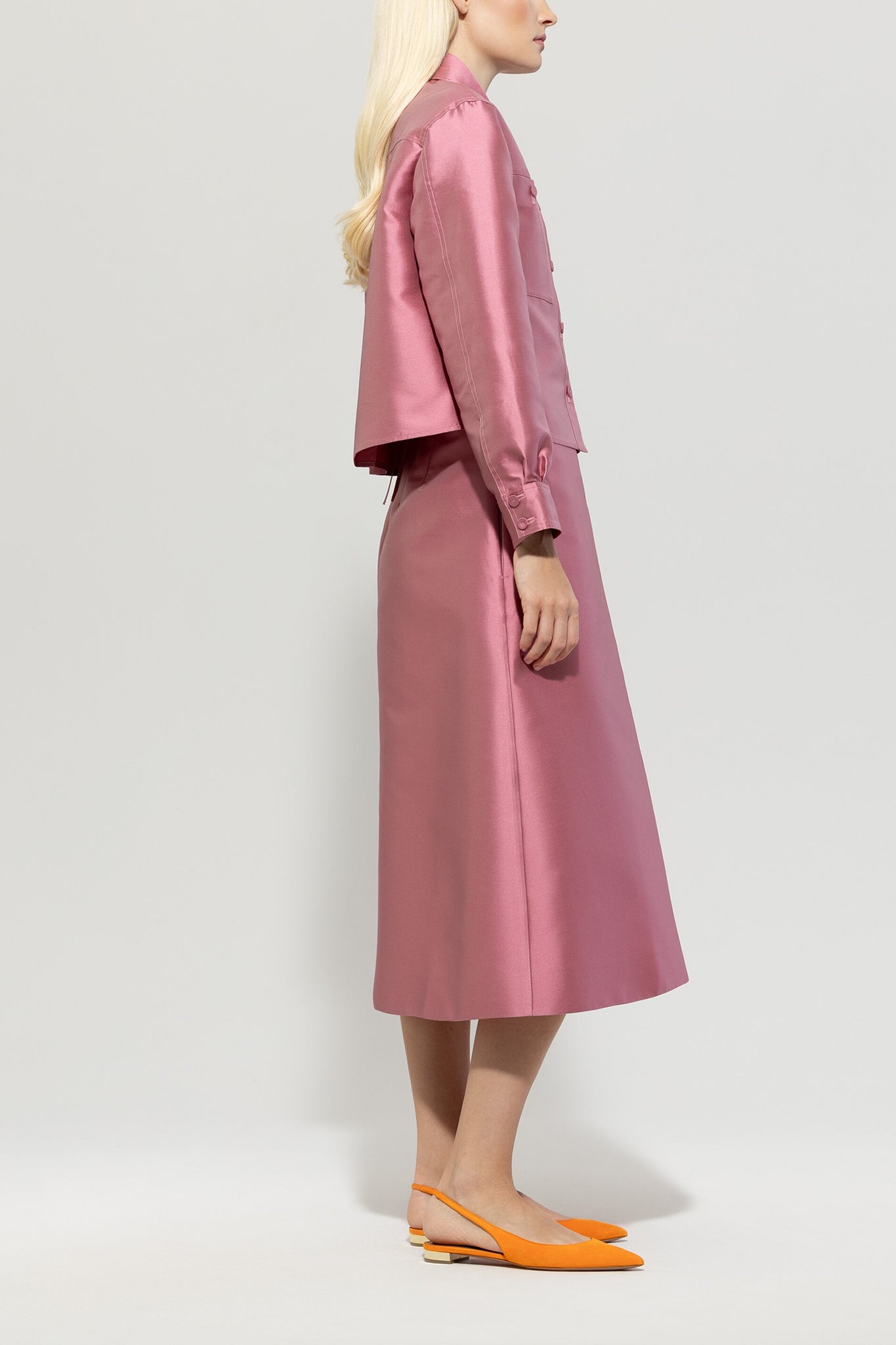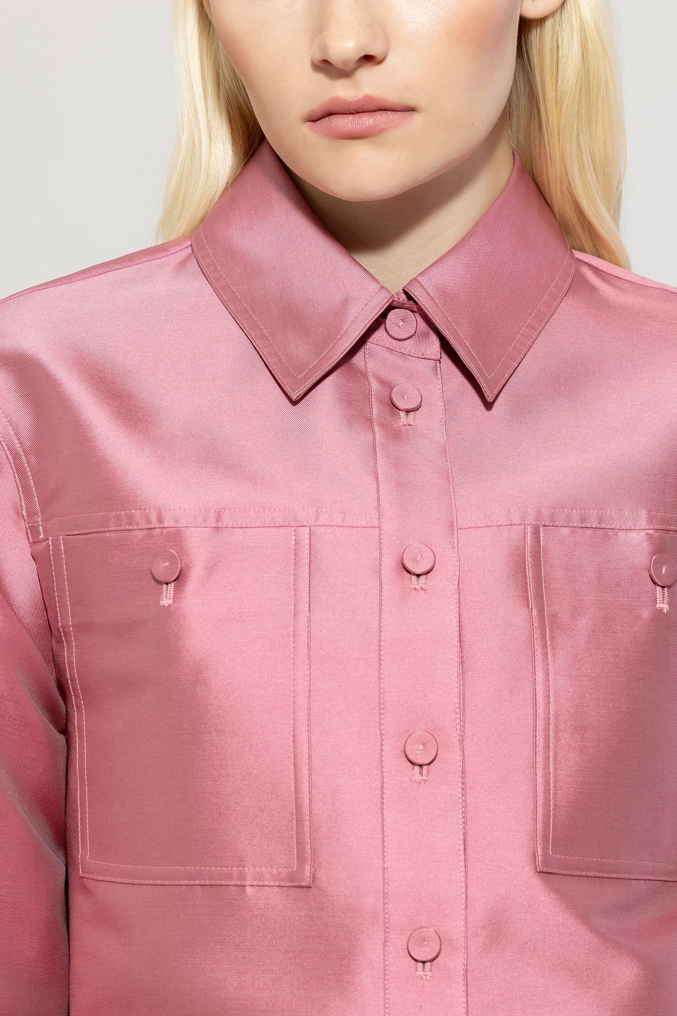 Kurze, kastig geschnittene Blusenjacke aus edlem Seidentwill mit mattem Glanz. Die Knopfleiste und die aufgesetzten Taschen sind mit Stoff überzogenen Knöpfen ausgestattet.