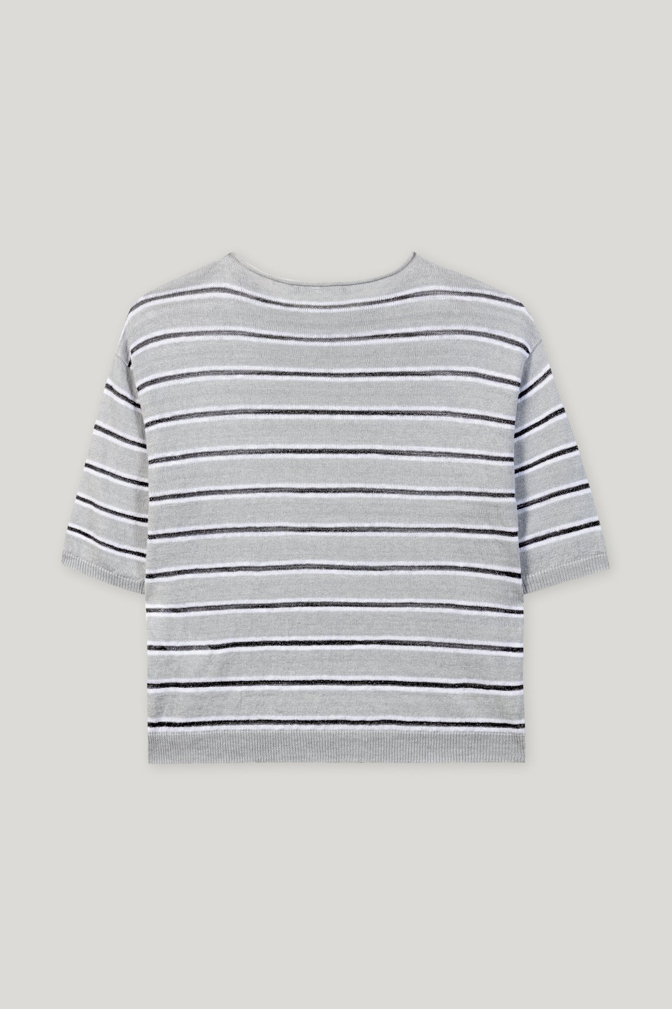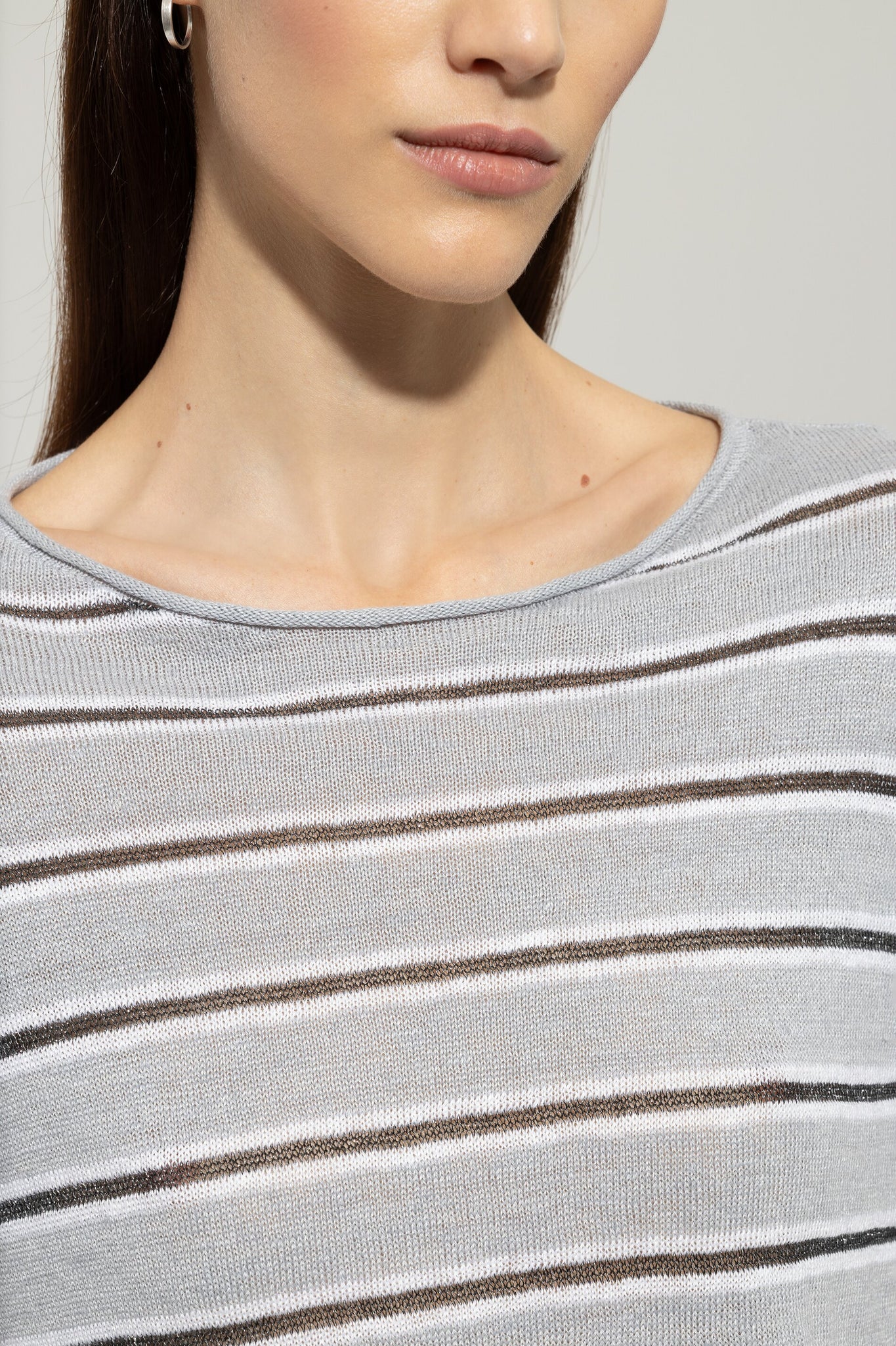 Kurzarm-Pullover aus edlem, italienischem Leinen-Garn mit feinem Streifen-Dessin und dezent eingearbeitetem Glanzgarn. Der Rundhalsausschnitt zeigt einen Rollsaum. Ärmel und Saum schließen mit Rippstrickbündchen ab.