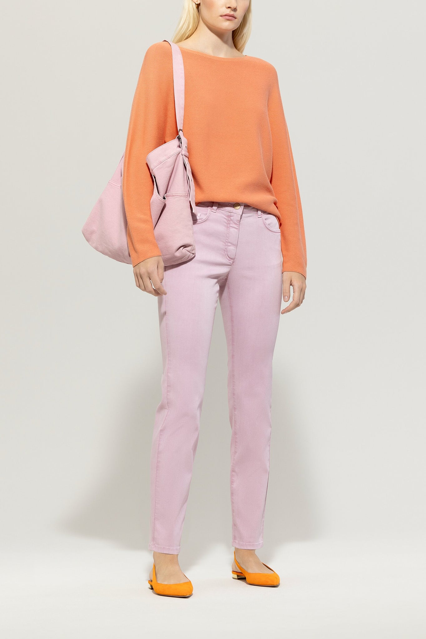 Strickpullover in Links-Struktur aus dünnem Baumwollgarn. Minderungsdetails im Schulterbereich betonen die Passform und ein gerippter Rundhalsausschnitt vollendet das Design.