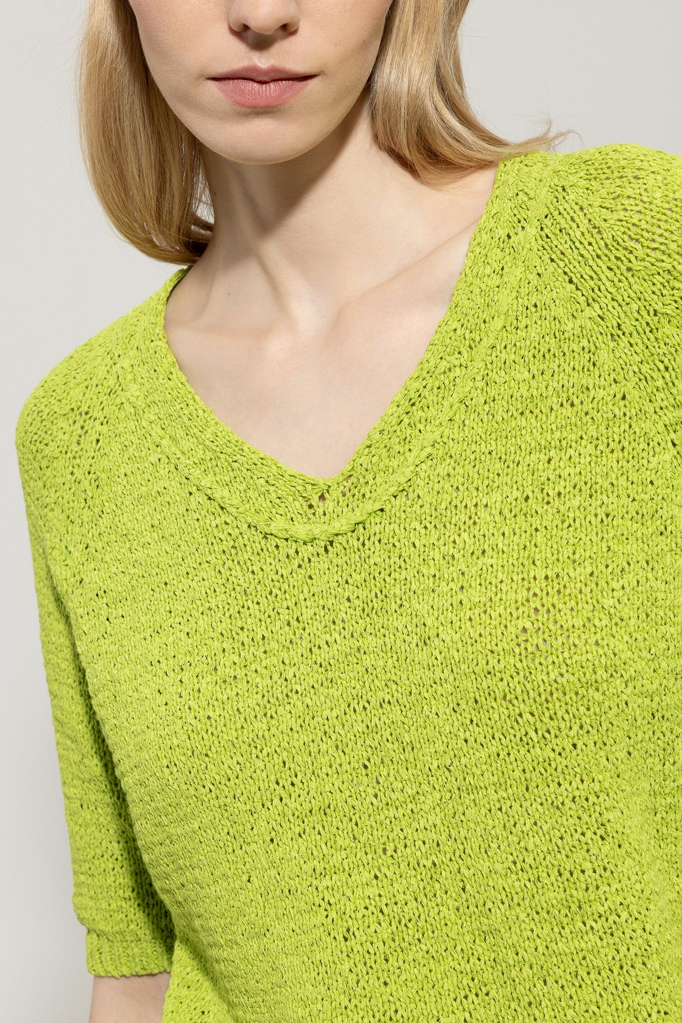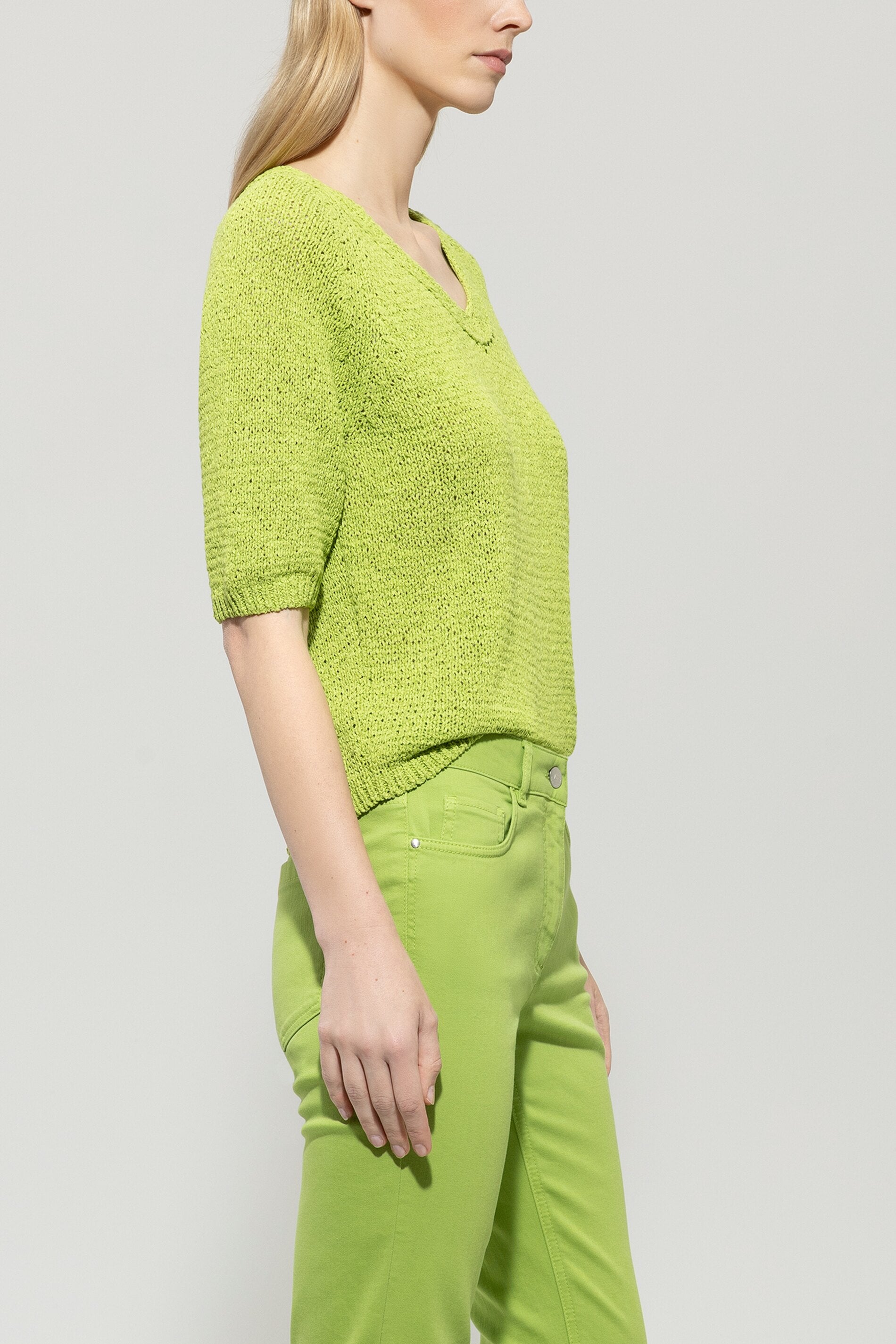 Strickpullover in legerer Passform aus sommerlichem Tape-Garn mit Lace-Struktur. Das Oberteil ist mit einem V-Ausschnitt, halblangen Ärmeln und gerippten Saumabschlüssen ausgestattet.