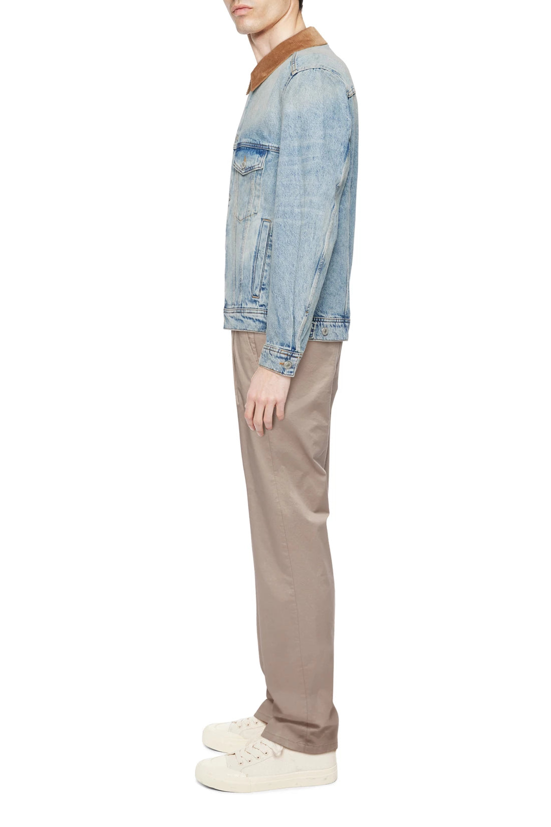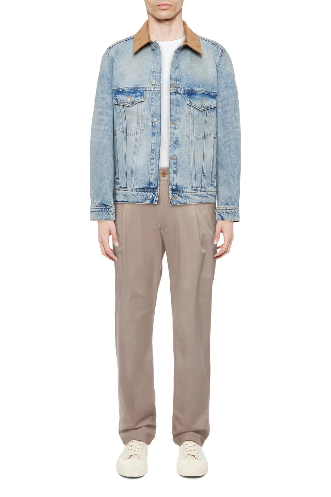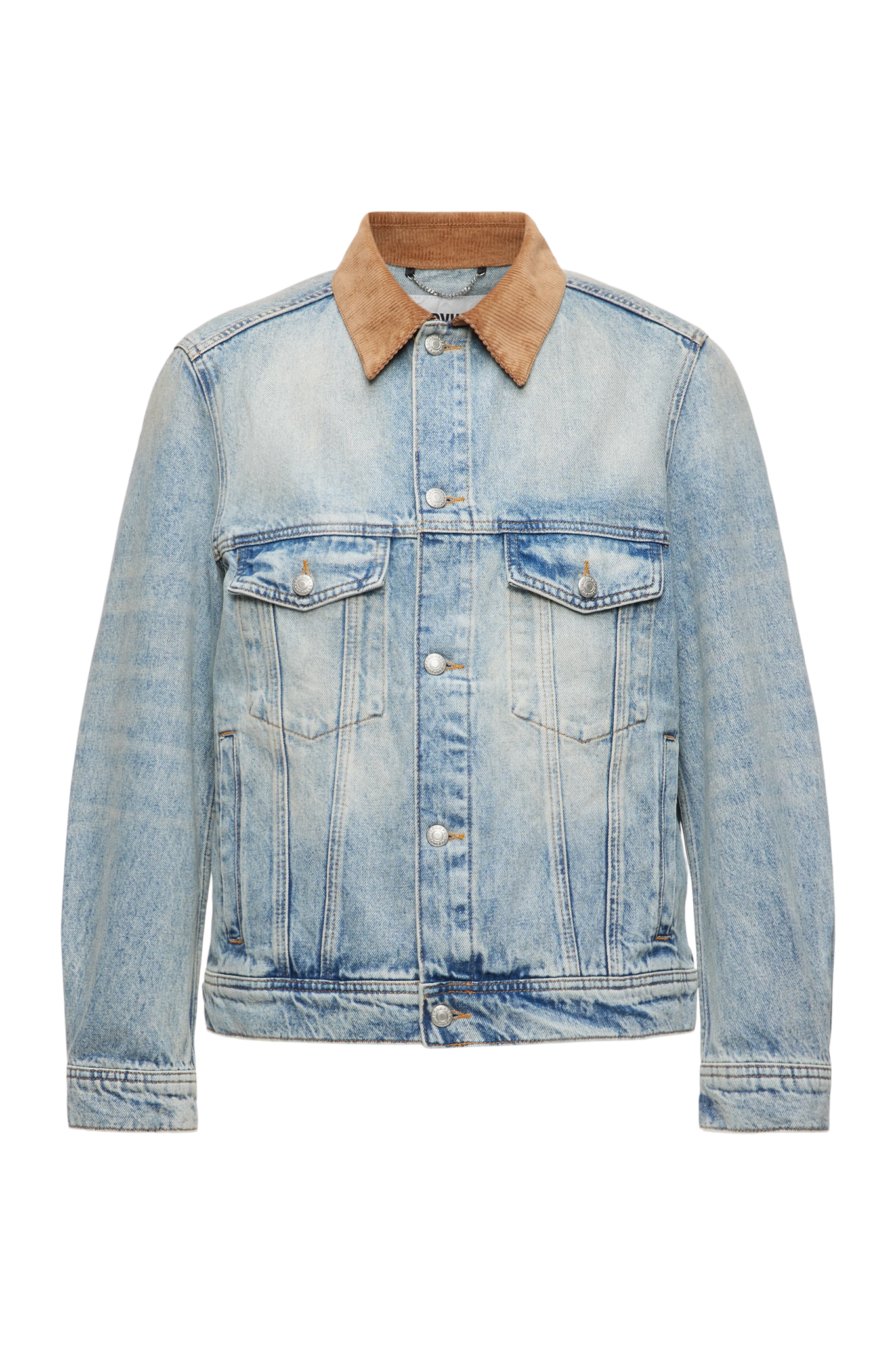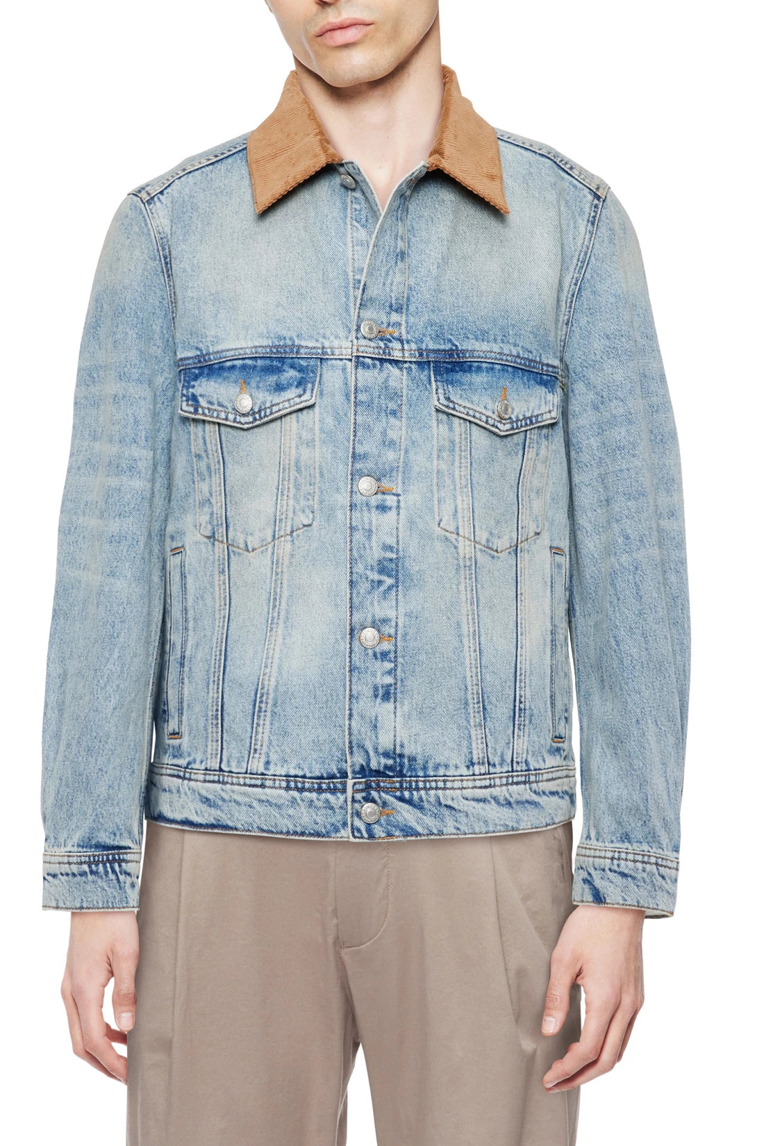 CESCON_K is a trucker jacket with a contrasting corduroy collar. It has two flap pockets on the chest and welt pockets. The tabs on the hem can be adjusted for a casual fit. This jacket is versatile, making it a true everyday essential. The dimensionally stable indigo denim is made of 100% cotton and has an authentic wash for a vintage denim look.