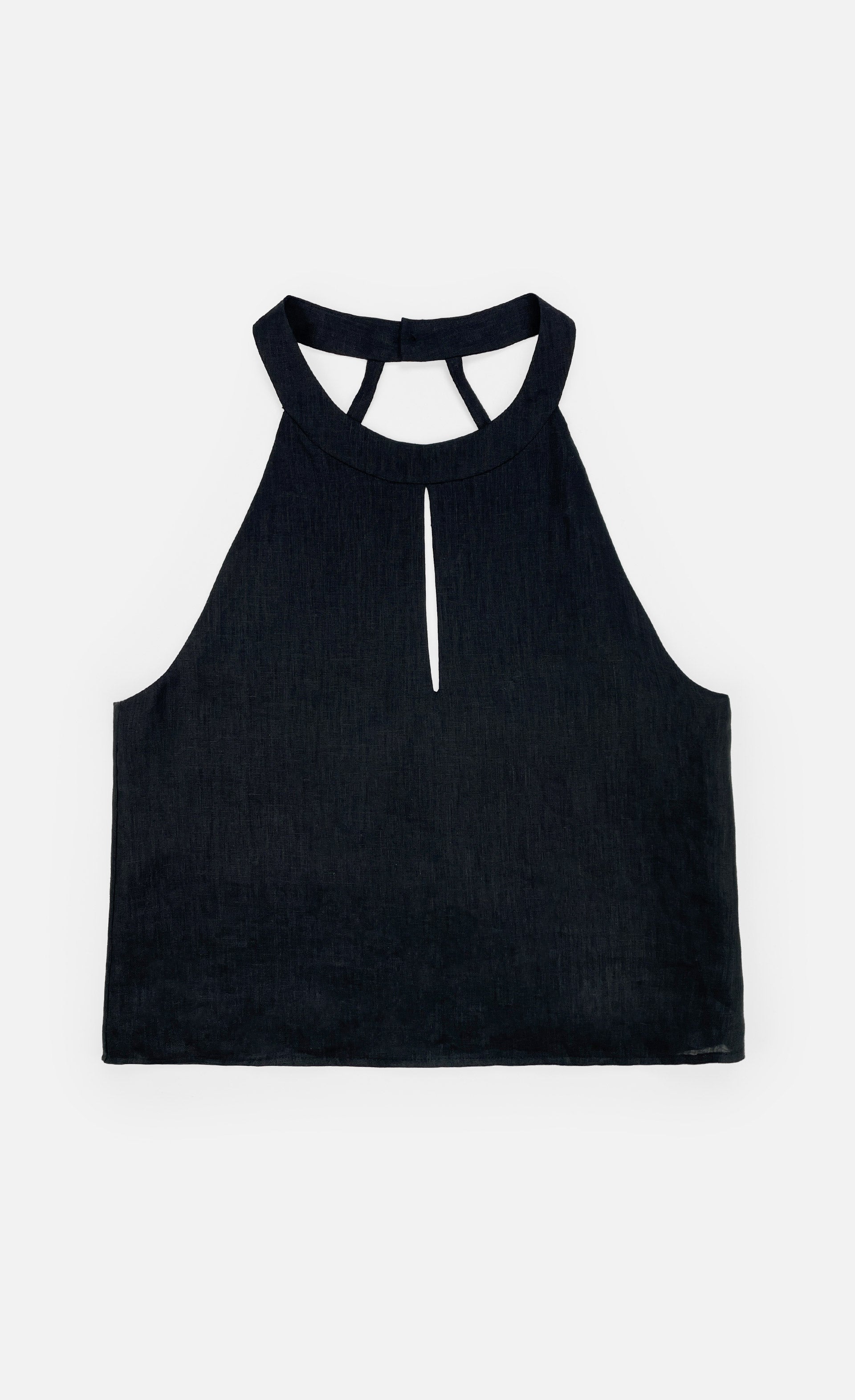 The short-cut top was designed with a halter neck and a deep back cutout and, thanks to the pure linen quality, feels pleasantly light on the skin.