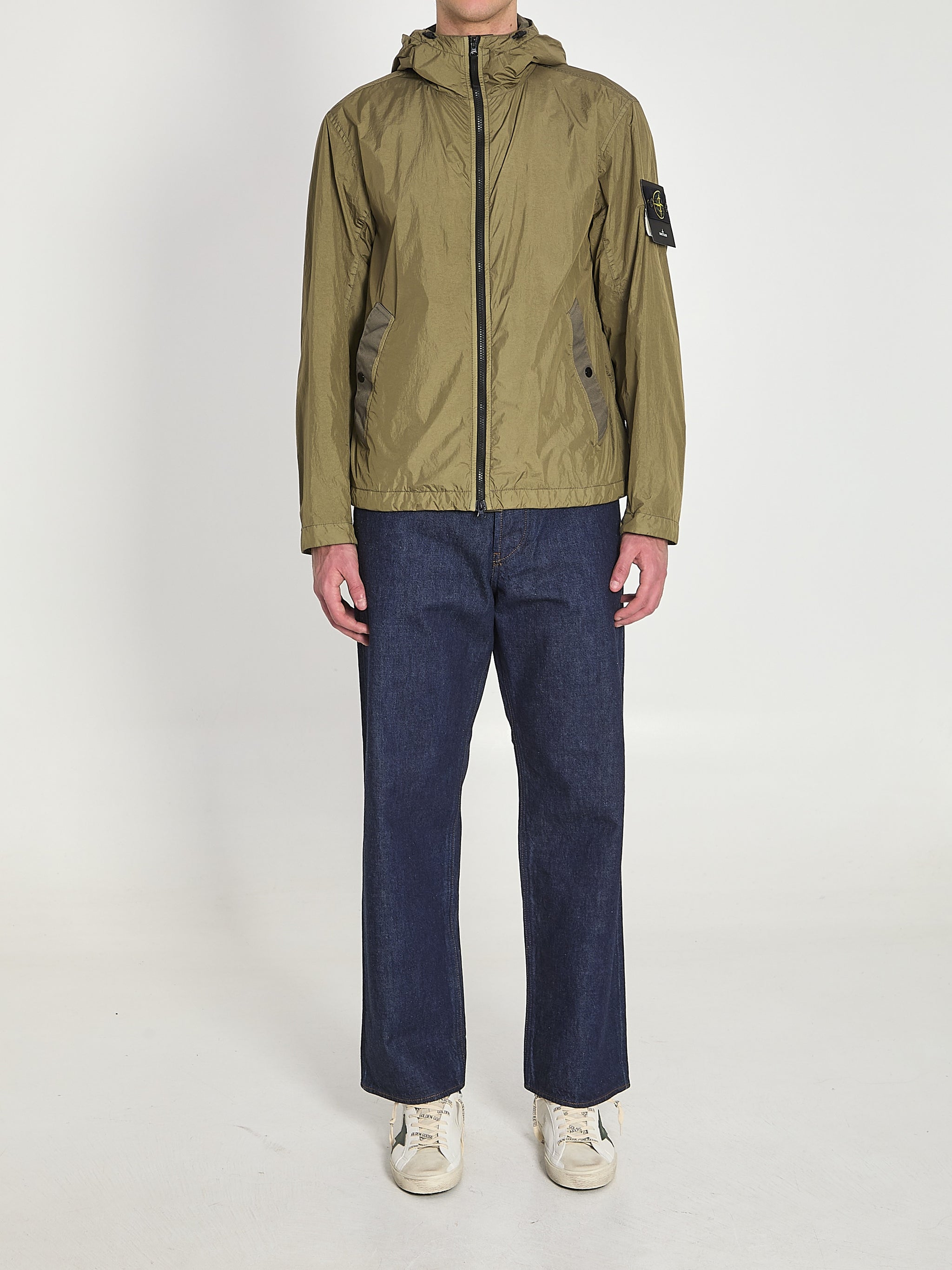Military green nylon jacket. It features an adjustable hood, a zip front closure, two front button pockets, long sleeves, an iconic applied badge on the sleeve, an internal drawstring at the hem, and a nylon lining. Regular fit.