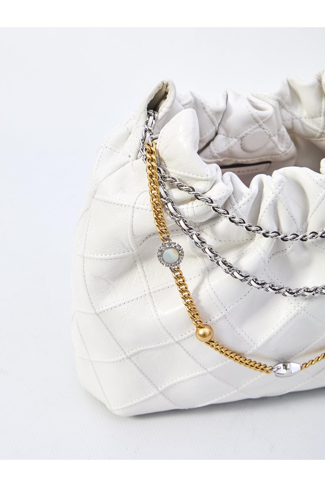 White quilted nappa leather bag. It features a chain shoulder strap, applied charms on the front, drawstring and magnetic button closure, one main compartment, and fabric lining. Dust bag included. Any imperfections in the leather are not considered manufacturing defects, but a characteristic of the material.