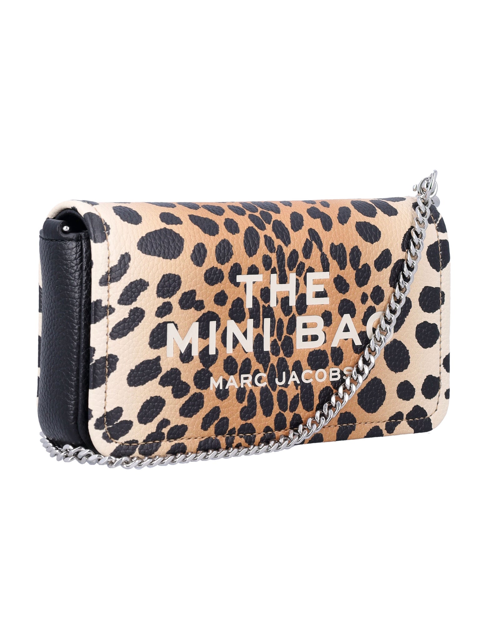 The Marc Jacobs Cheetah chain mini bag combines style and functionality with a pebble leather finish. It features a magnetic closure, removable chain strap, eight card slots, and dimensions of 12 cm height, 21 cm width, and 5 cm depth.