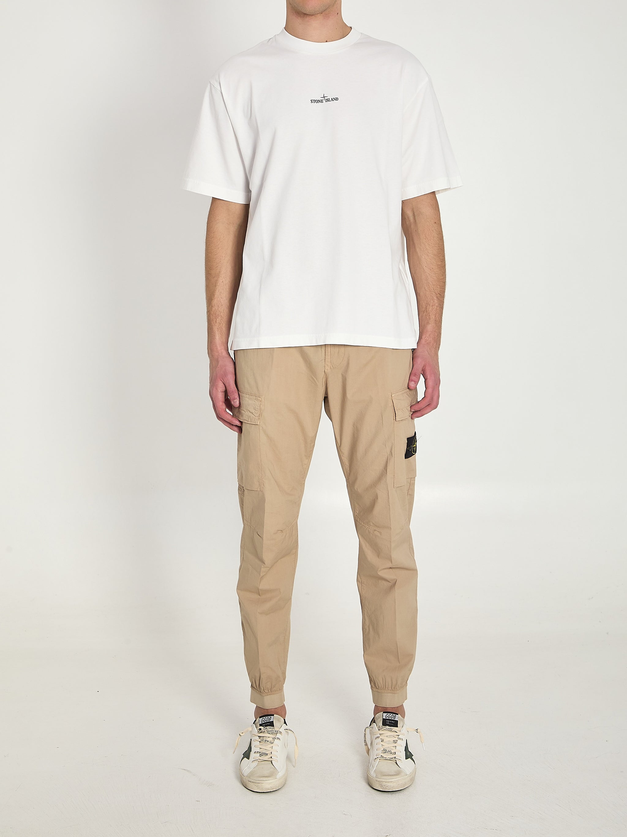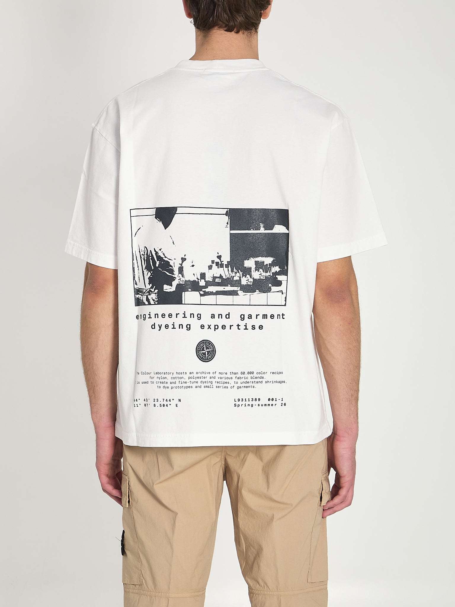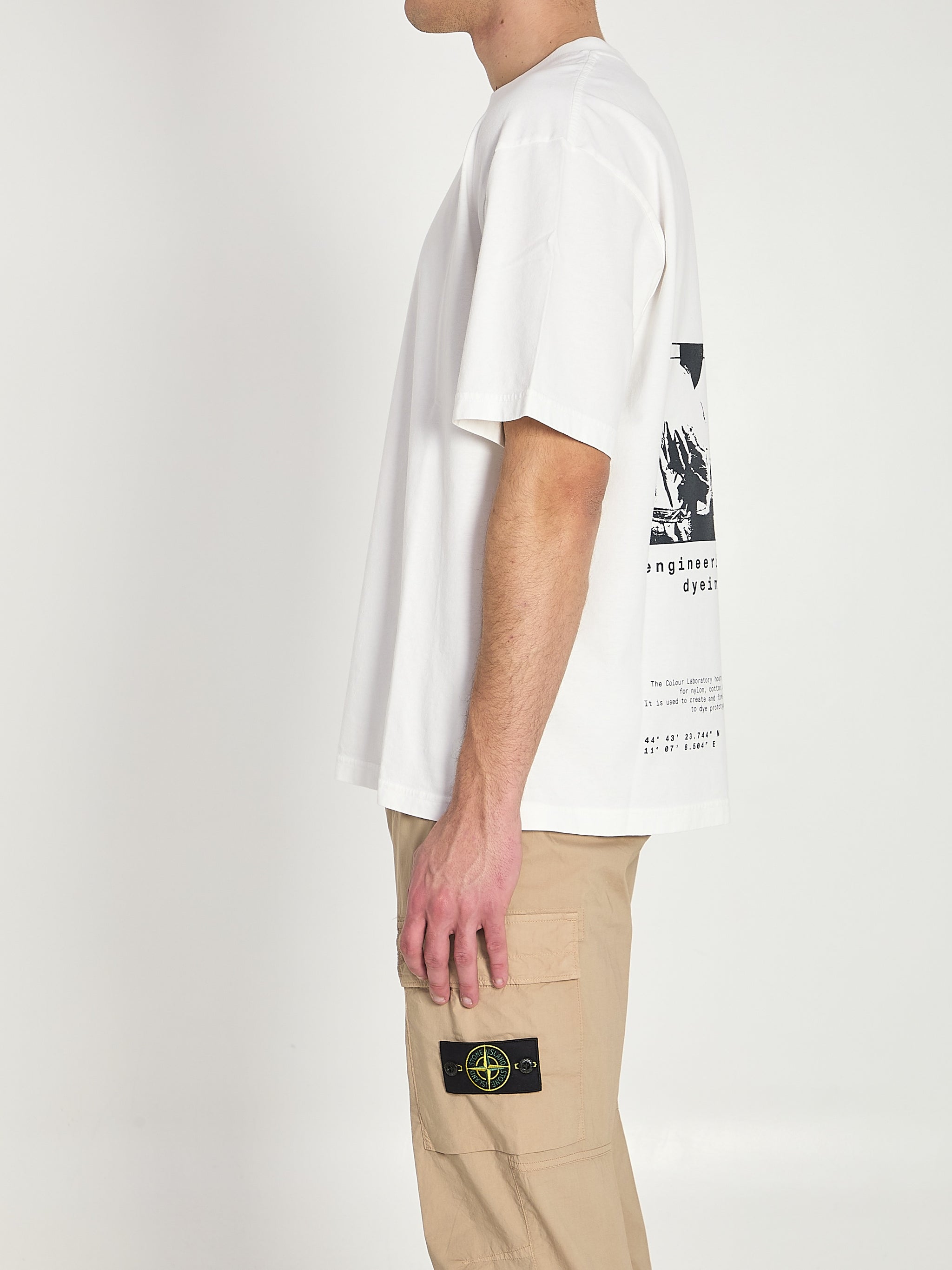 White cotton jersey t-shirt. Features a ribbed crew neck, short sleeves, a signature on the front, and a print on the back. Oversized fit.