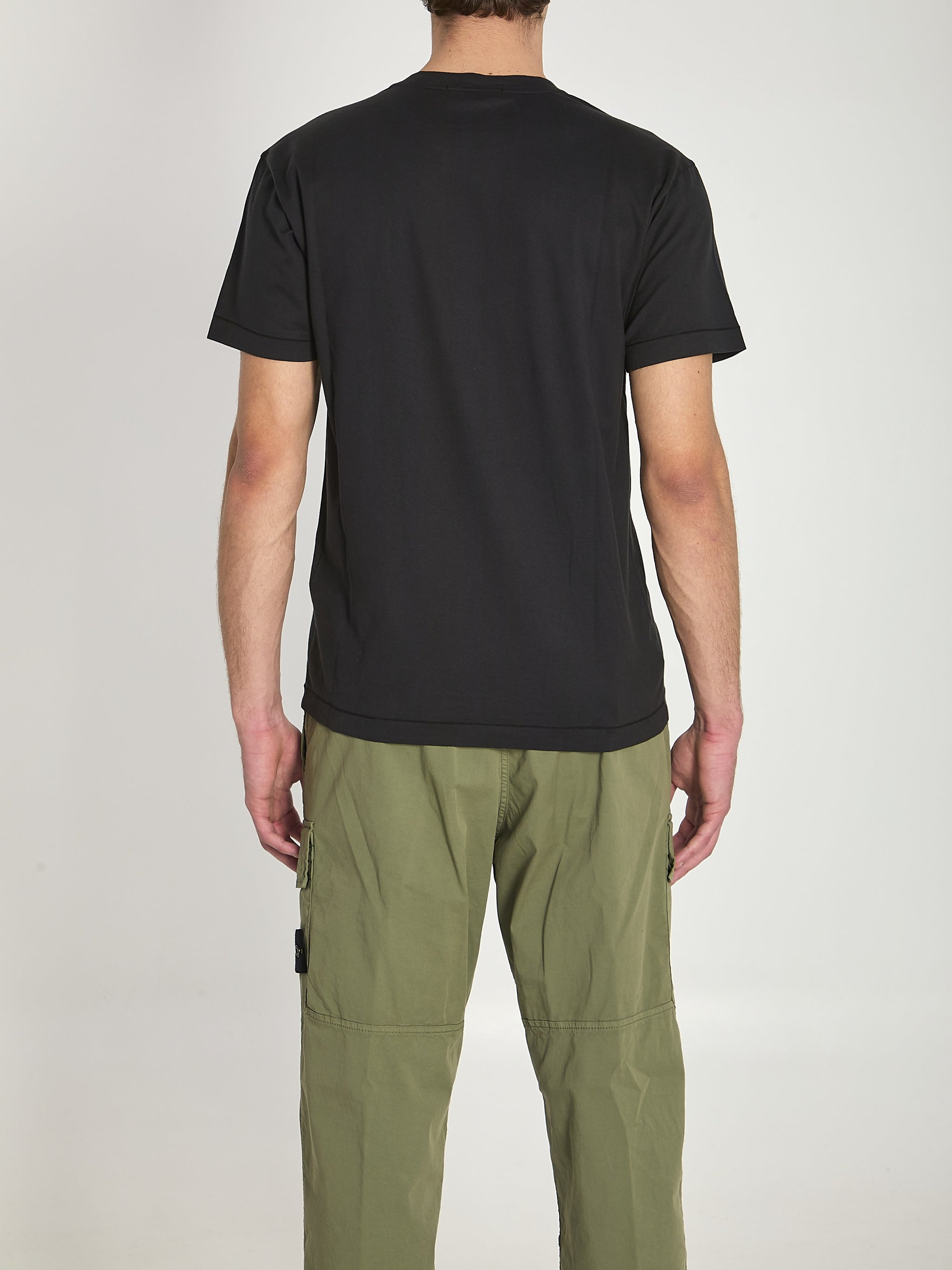Lightweight black cotton t-shirt. Features a ribbed crew neck, short sleeves, and an embroidered logo on the chest. Regular fit.