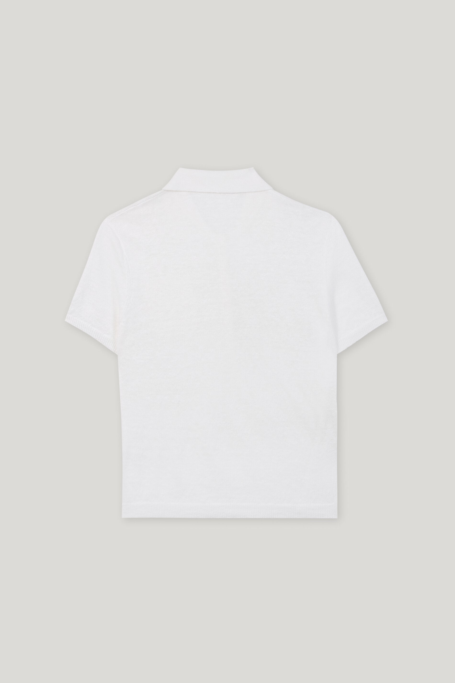 Fein gestrickter, kurzärmliger Pullover aus edlem, italienischem Leinen-Garn mit Polokragen und kurzer Knopfleiste. Auf der Vorderseite ist eine Brusttasche aufgesetzt. Ärmel und Saum schließen mit Rippstrickbündchen ab.