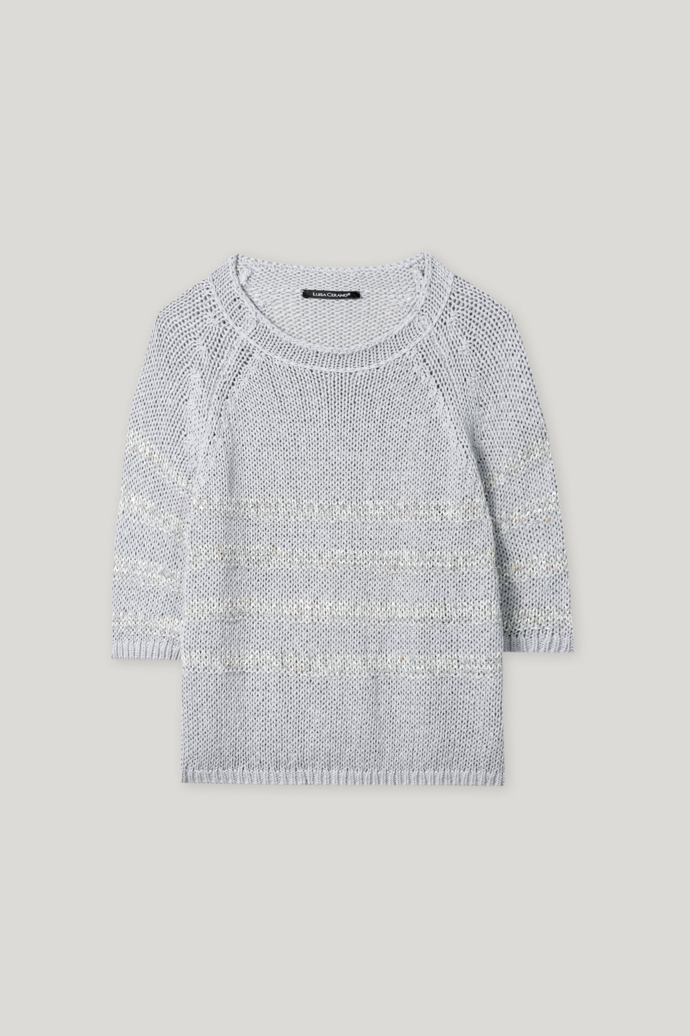 Strickpullover aus leichtem Leinen-Baumwoll-Tape-Garn mit halblangen Ärmeln und rundem Halsausschnitt. Das Streifen-Dessin ist für einen glamourösen Look mit dezenten Pailletten und Glanzgarn gearbeitet und wird mit einem gestrickten 3D-Effekt zusätzlich hervorgehoben.