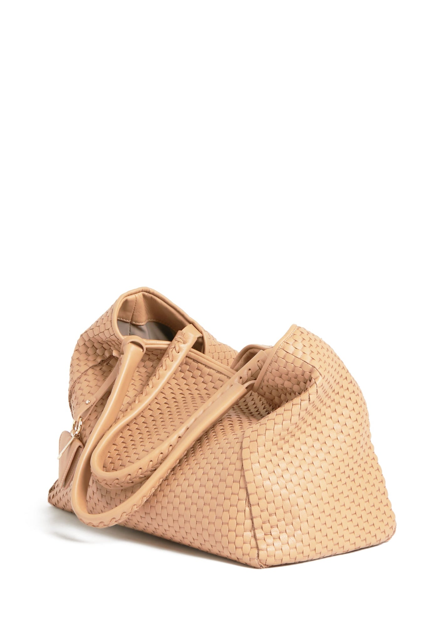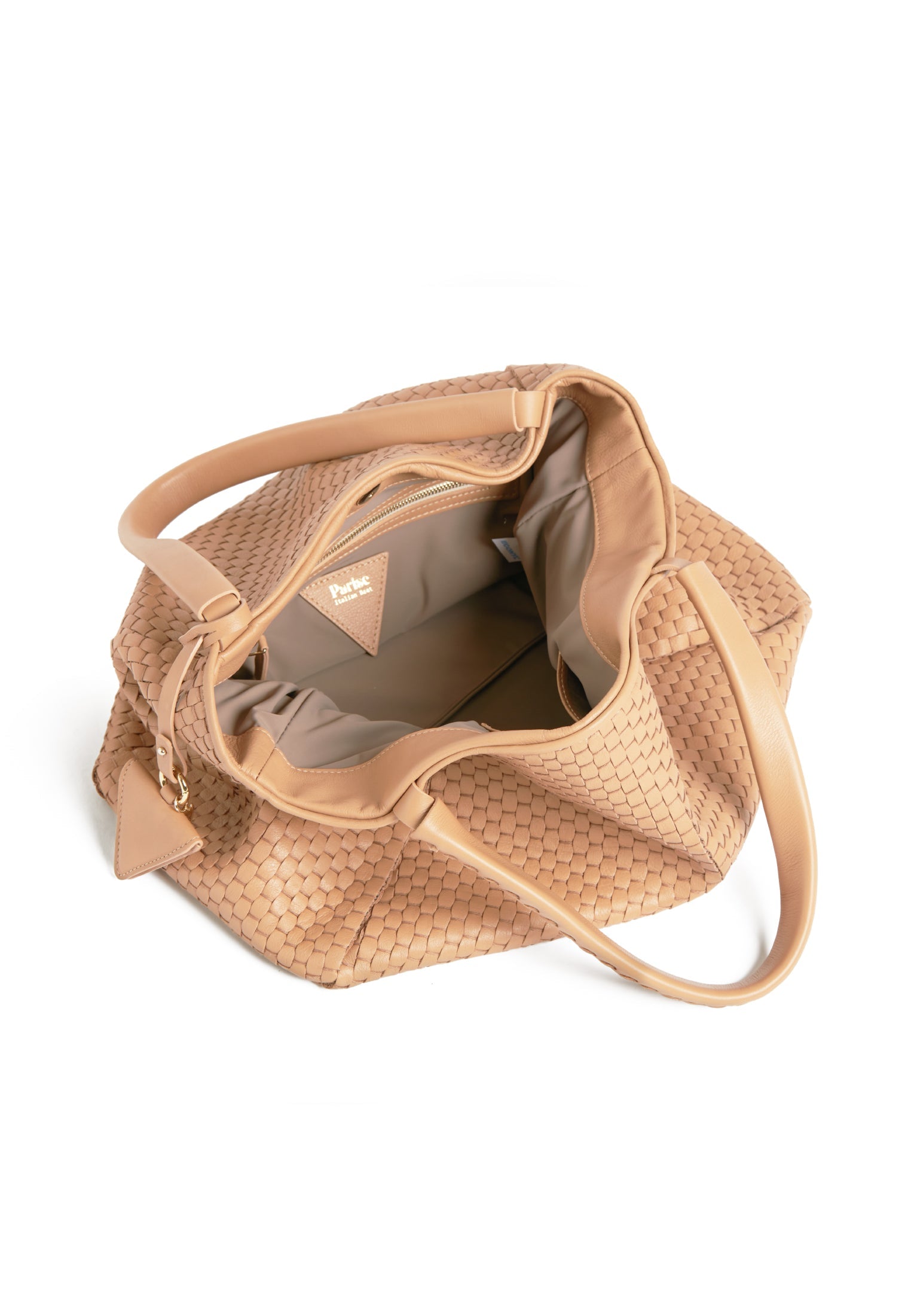 Product: '09' Plain Camel- Edge without fringe for those who prefer more minimalist designs - Double leather handles that fit easily over coats - Magnetic closure for secure and easy access - Internal zipped pocket and two leather compartments to organize your essentials - White gold colored hardware - Soft and durable 100% cotton lining - Exclusive signature Parise pendant included - Protective dust bag included for lasting beauty Made in Italy - Premium 100% bovine leather woven with 100% cotton yarn on 18th century treadle looms