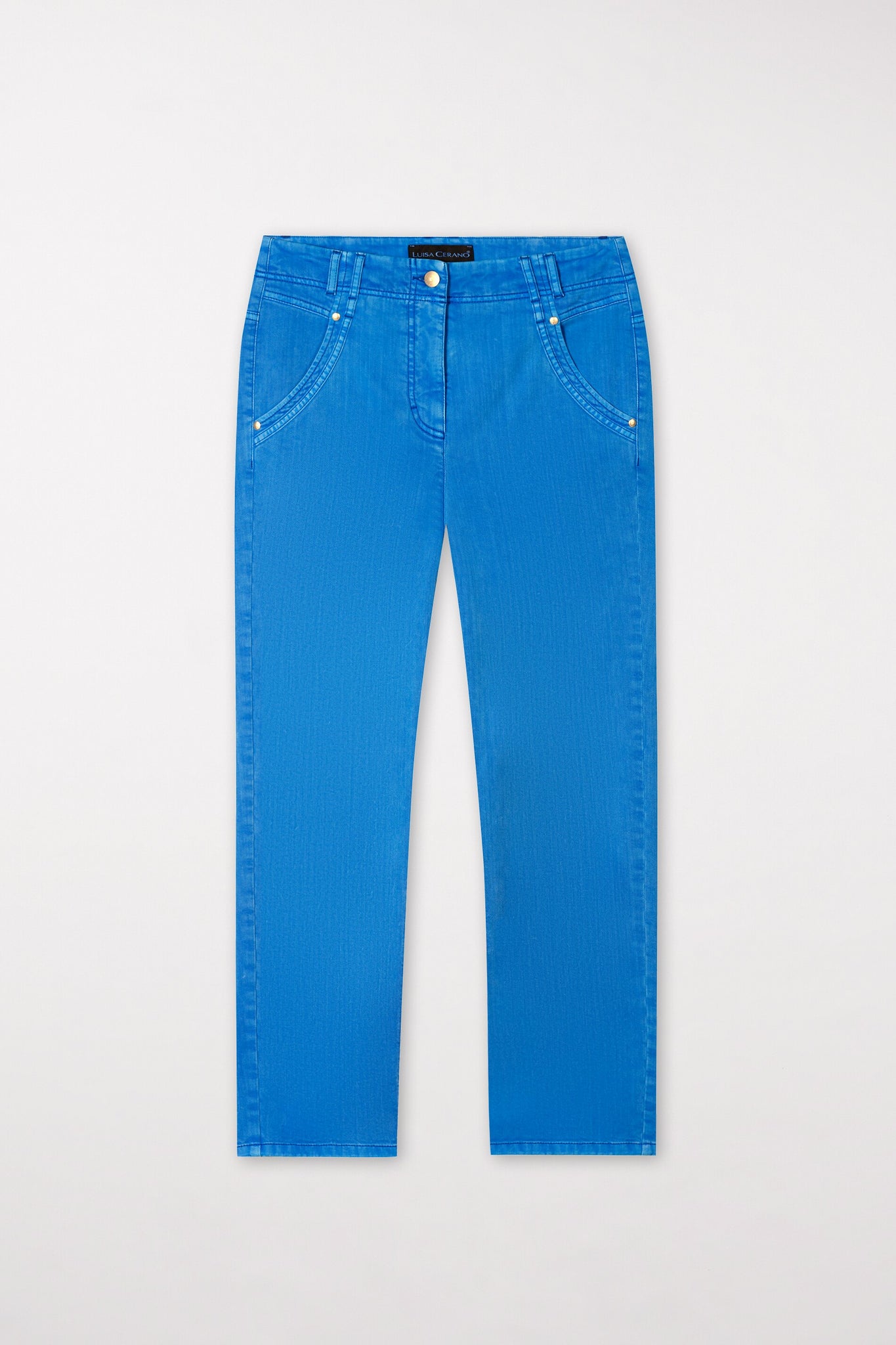 Straight-leg, slightly cropped trousers made from stretch RFD denim. The trousers feature two pockets each on the front and back, as well as belt loops at the waistband.