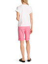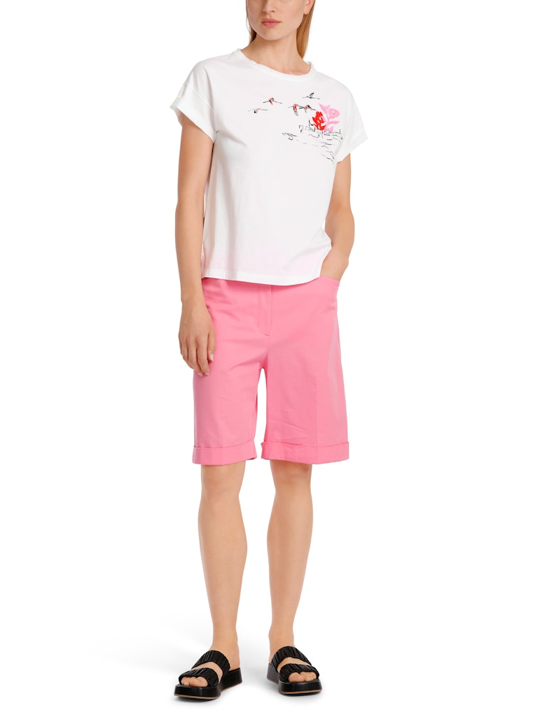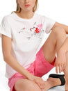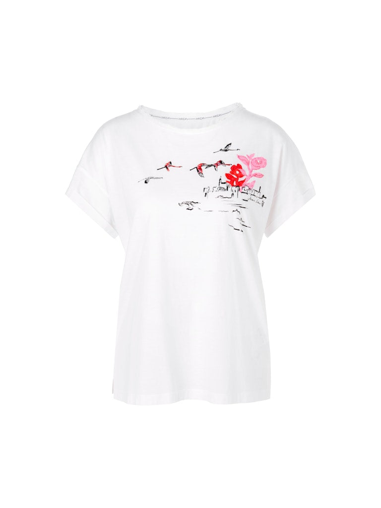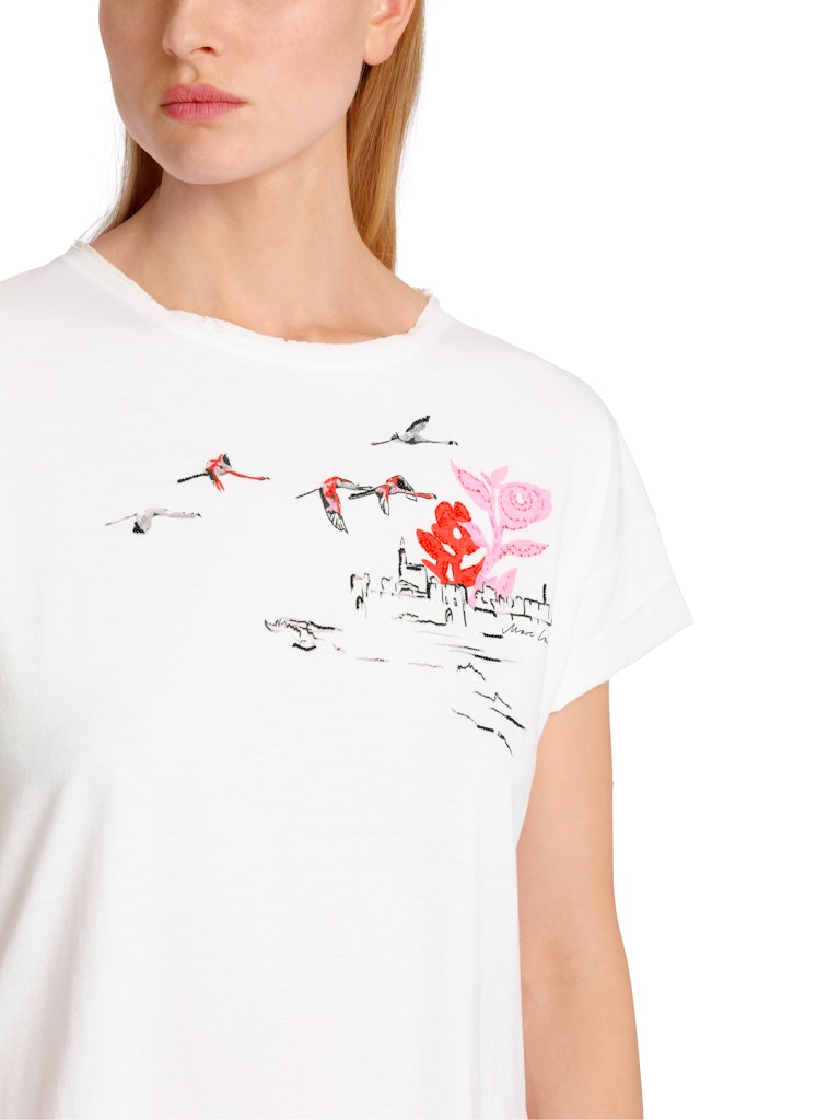 Oversized T-shirt with a straight fit and dropped shoulders. The sleeves are super short and feature cuffs. A delicate, double-layered flounce adorns the neckline. The front design is asymmetrically placed and combines a print with a pearl appliqué. The T-shirt is made of pure cotton.