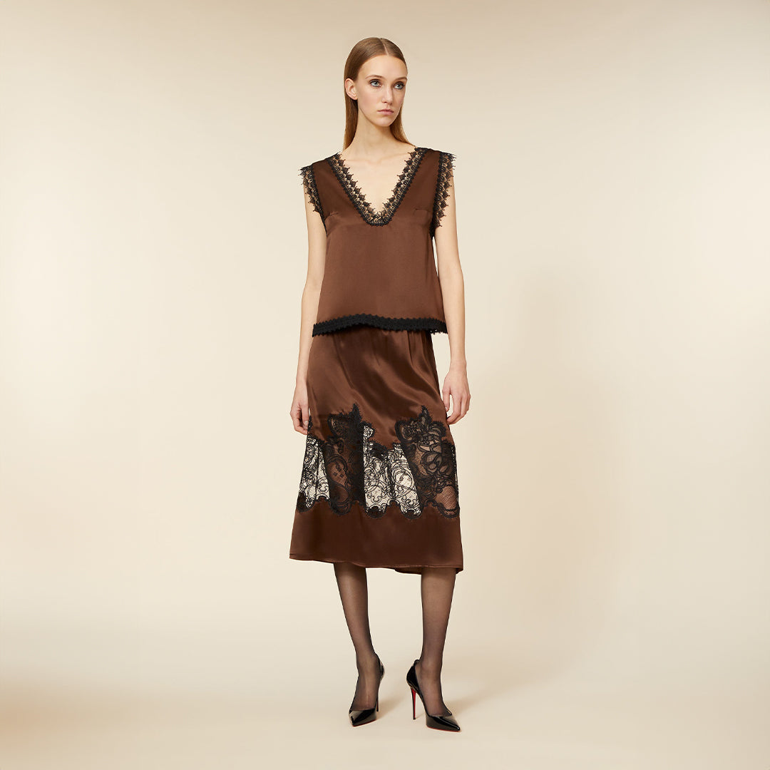 - Silk satin fabrication in brown with lace fabrication in black