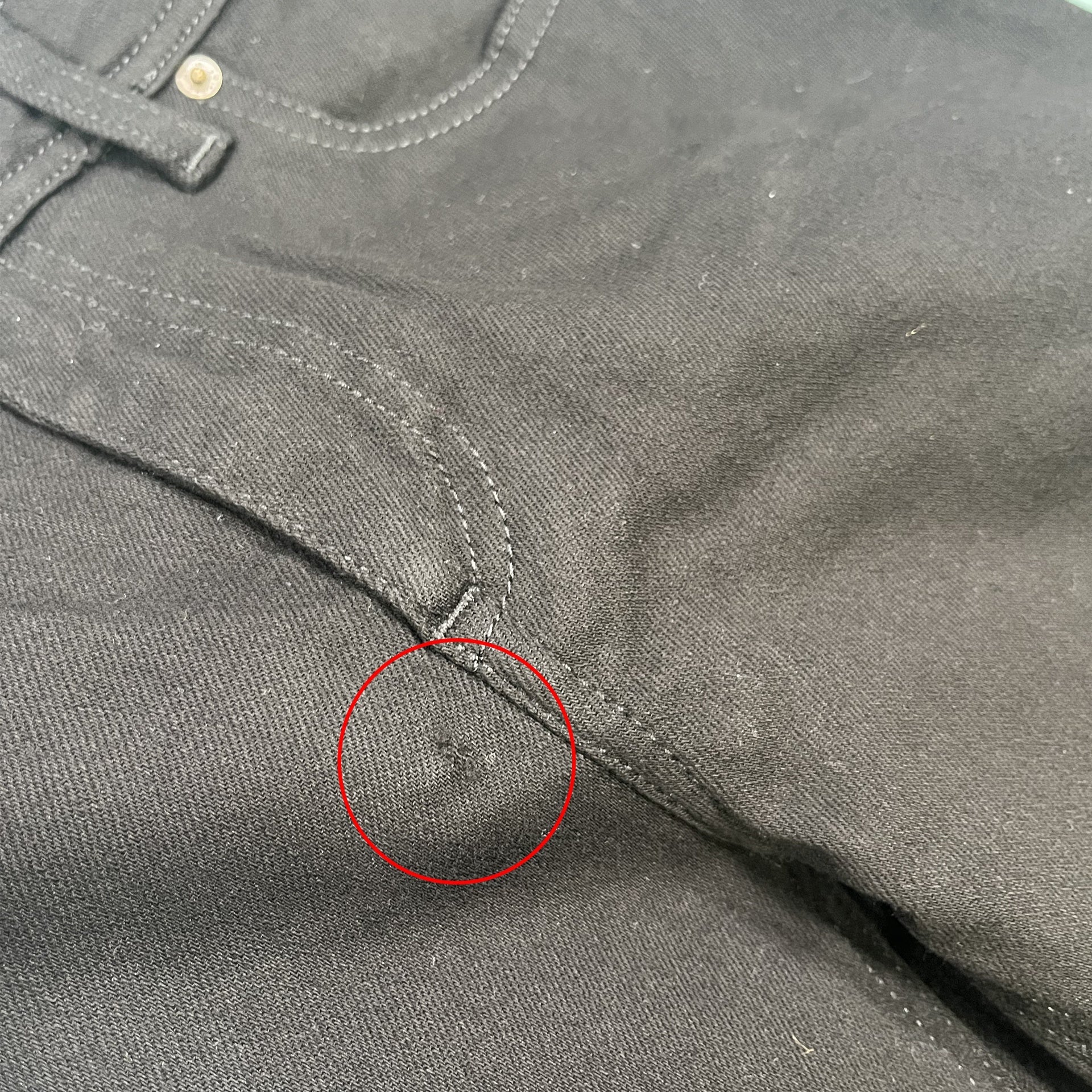 - Imperfections: missing composition label, missing back patch, small hole on right leg