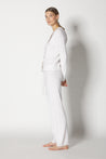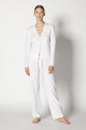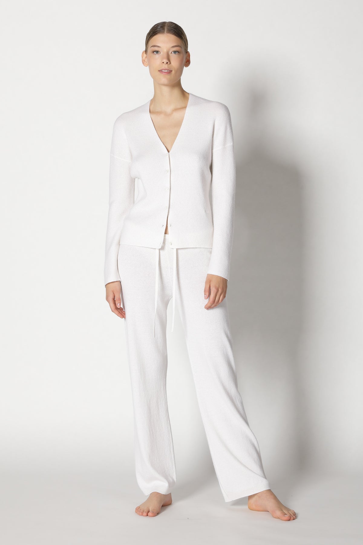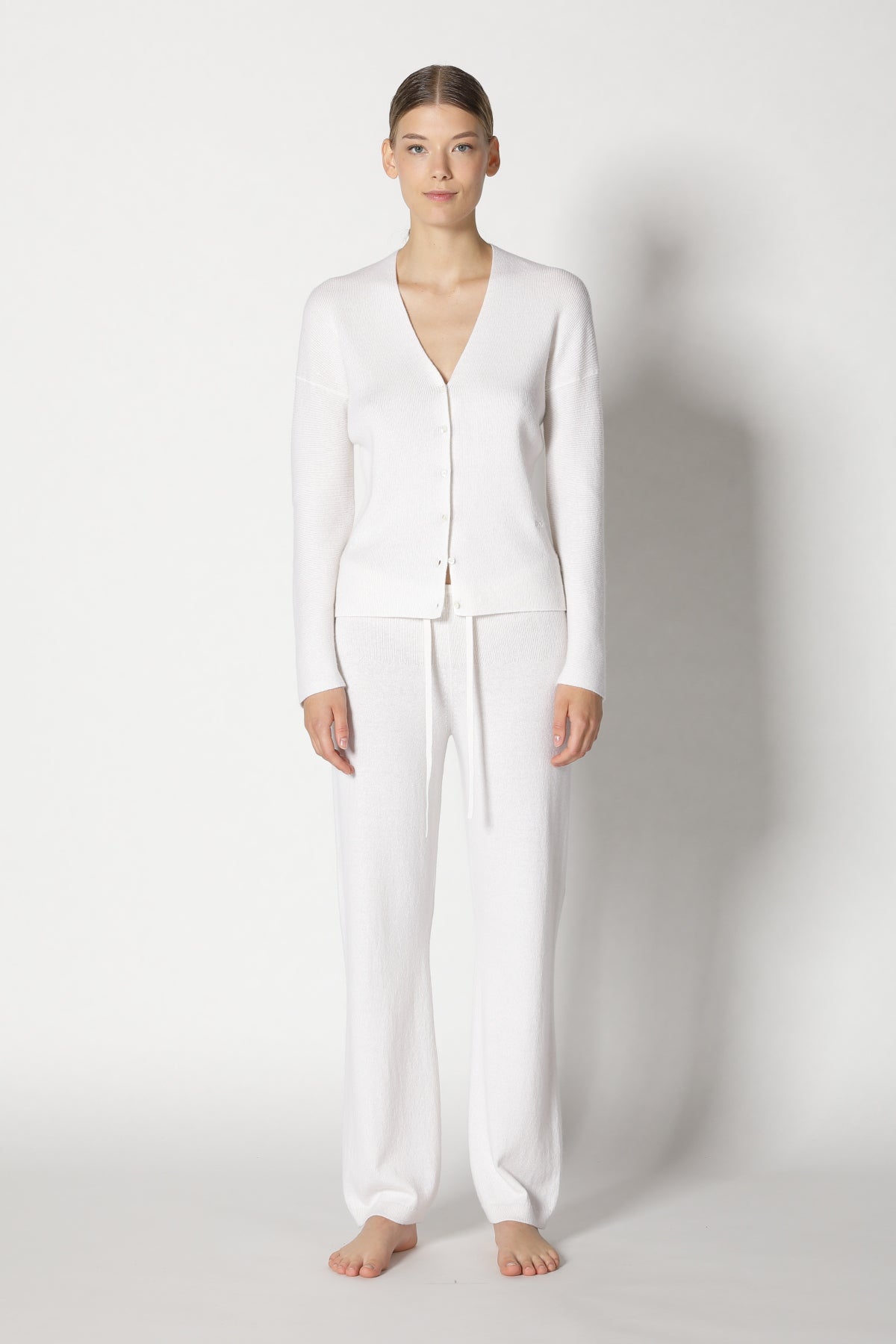 Fitted cardigan in full needle stitch with clean placket selfedge and small MOP buttons, sleeves in vertical knit direction