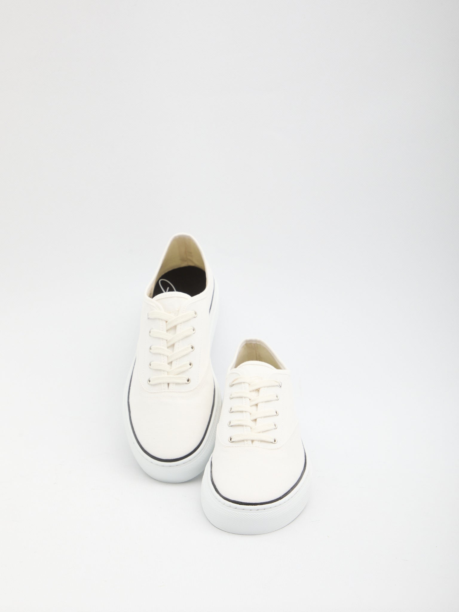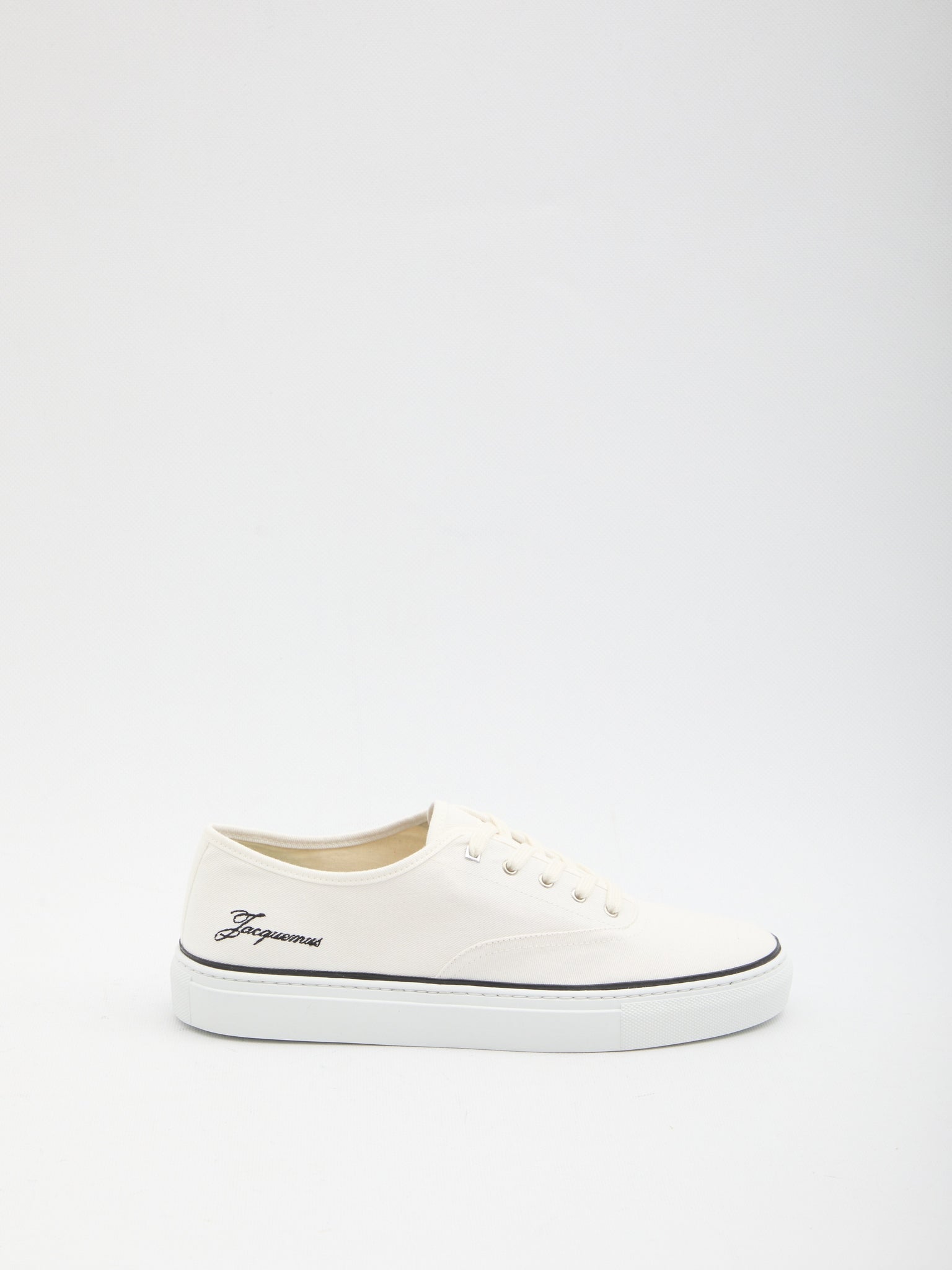 White cotton canvas sneakers. Feature a round toe, lace-up closure, tongue with tone-on-tone embroidered logo, black embroidered Jacquemus signature on the side, fabric lining, rubber sole. Dustbag included.
