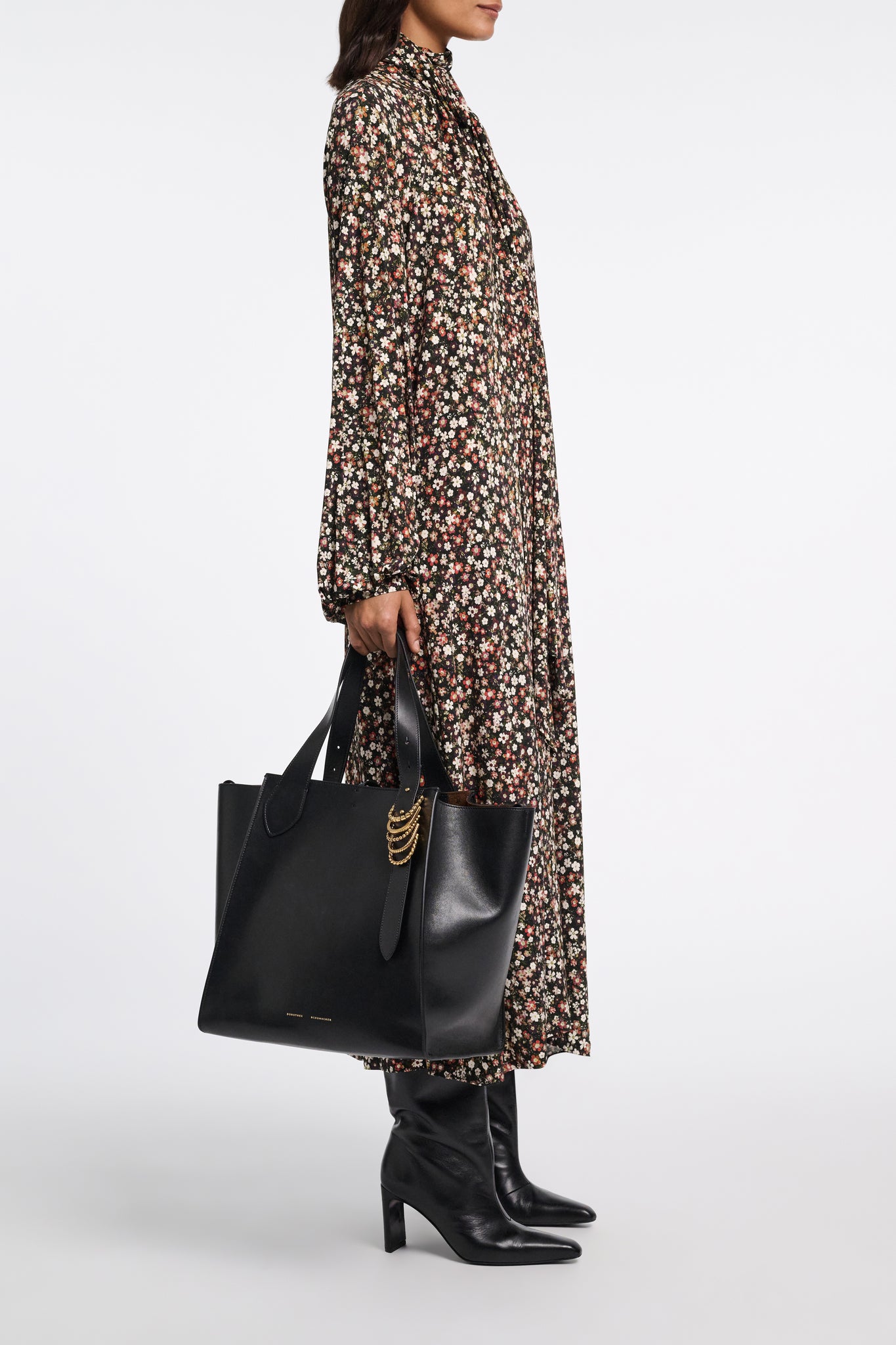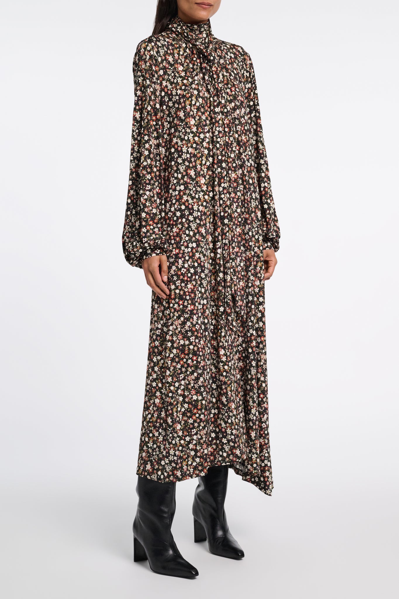 More power to the flower: The all-over millefleur print meets flowing jersey. The dress has an asymmetrical silhouette. The scarf allows for different ways to wear it.