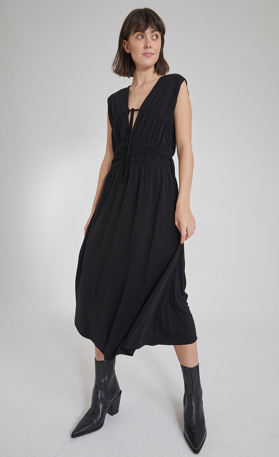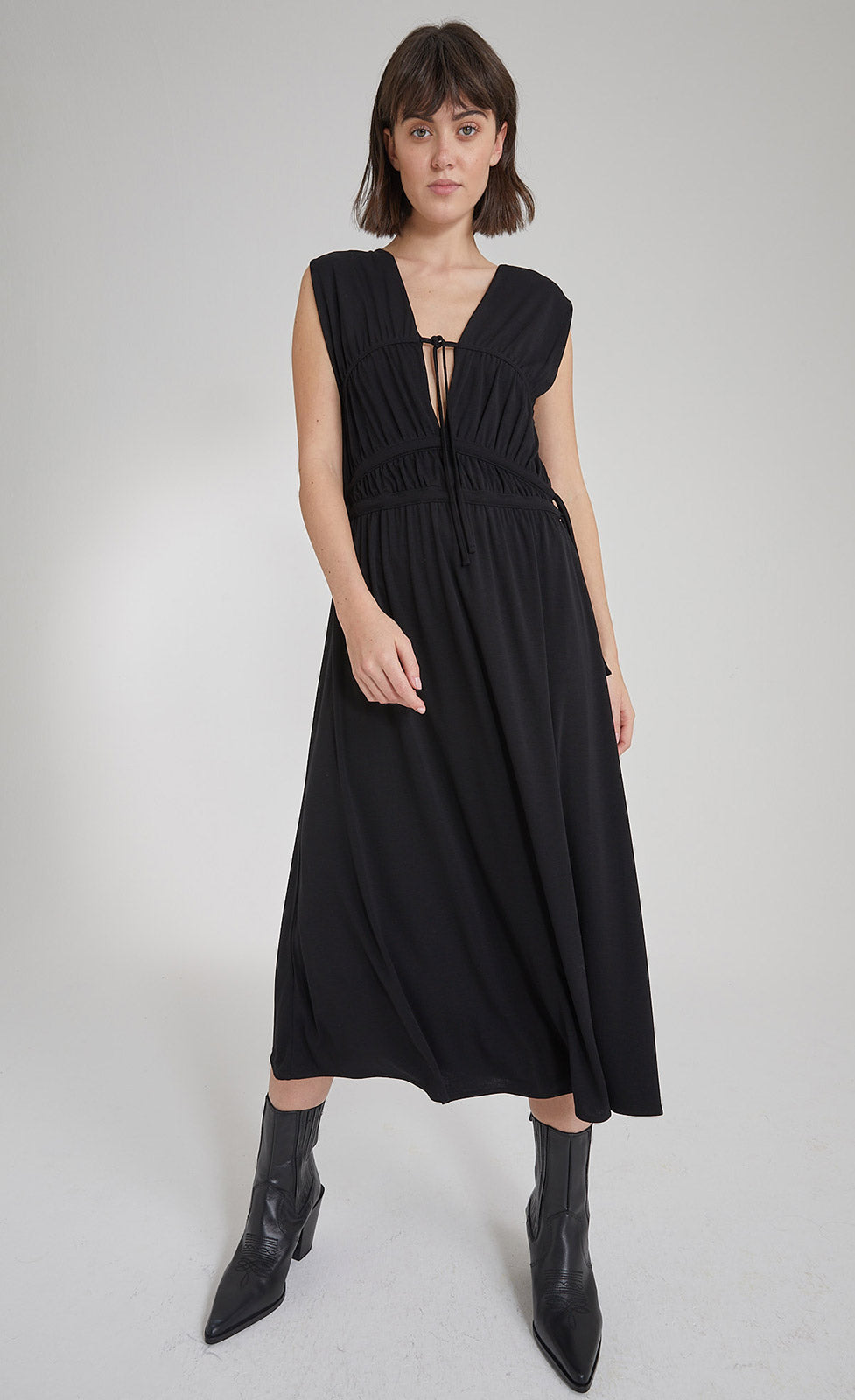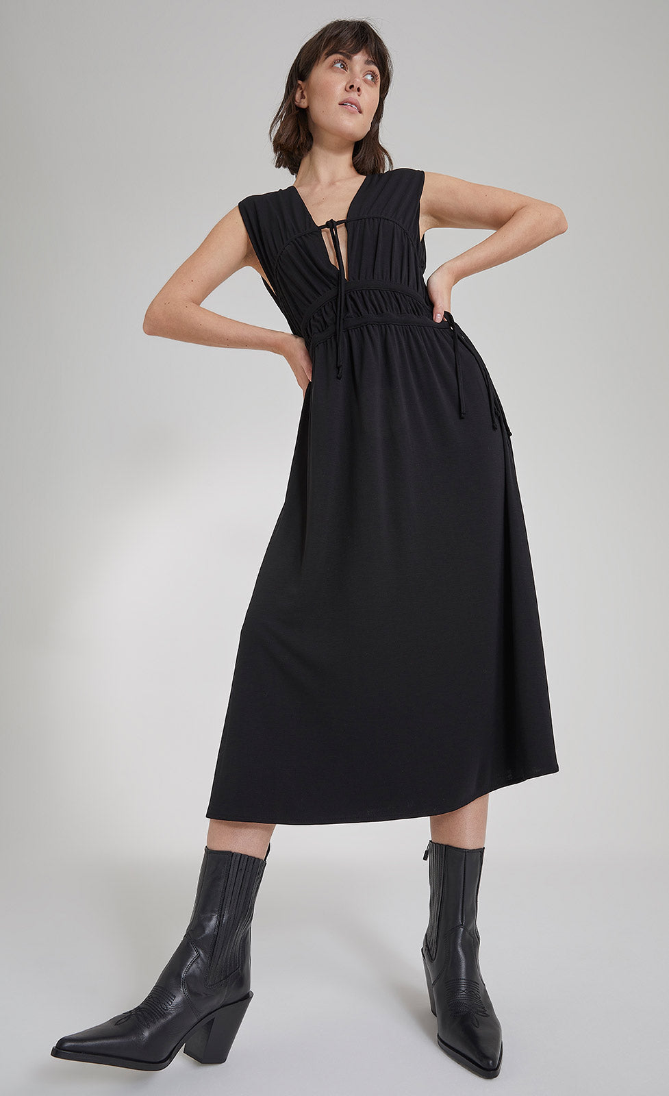 - Drawstring below the bust and at the waist