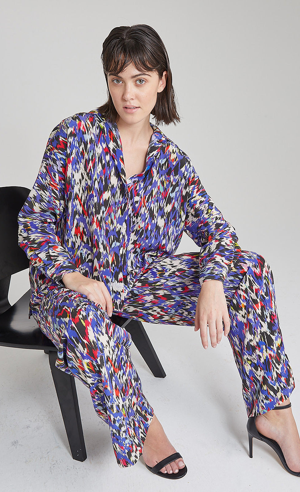 This blouse, crafted from high-quality, pure silk, features a classic shirt design and impresses with its striking all-over print. Matching trousers are available for a complete look.