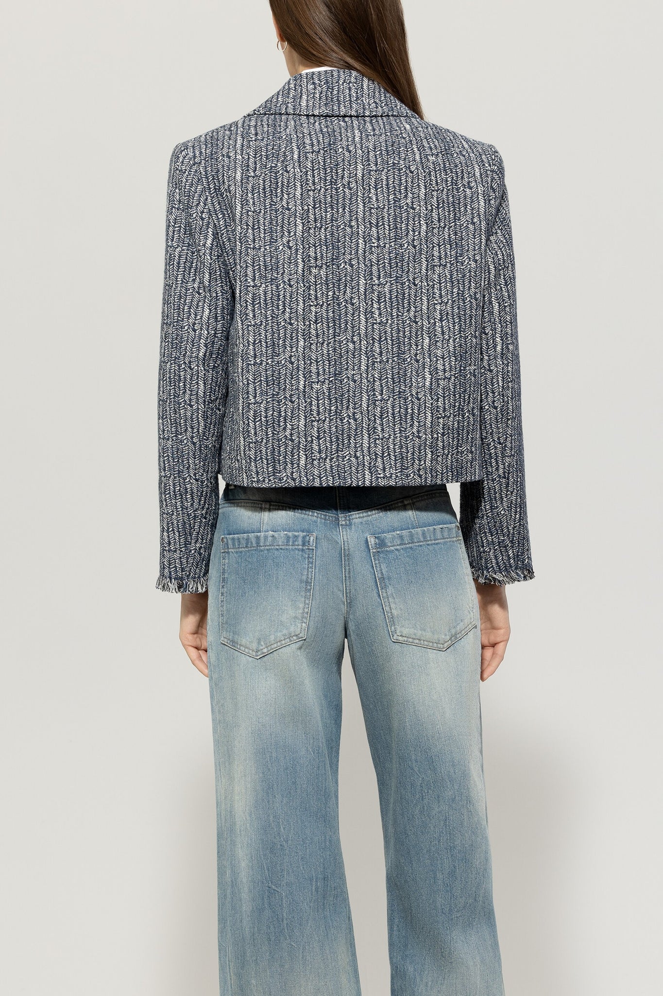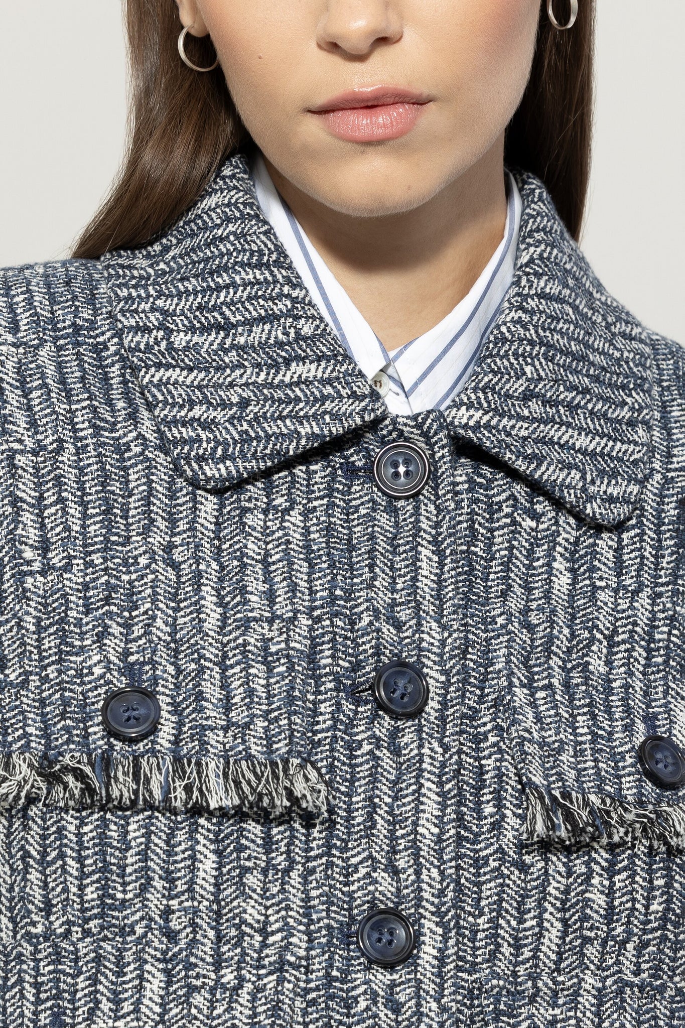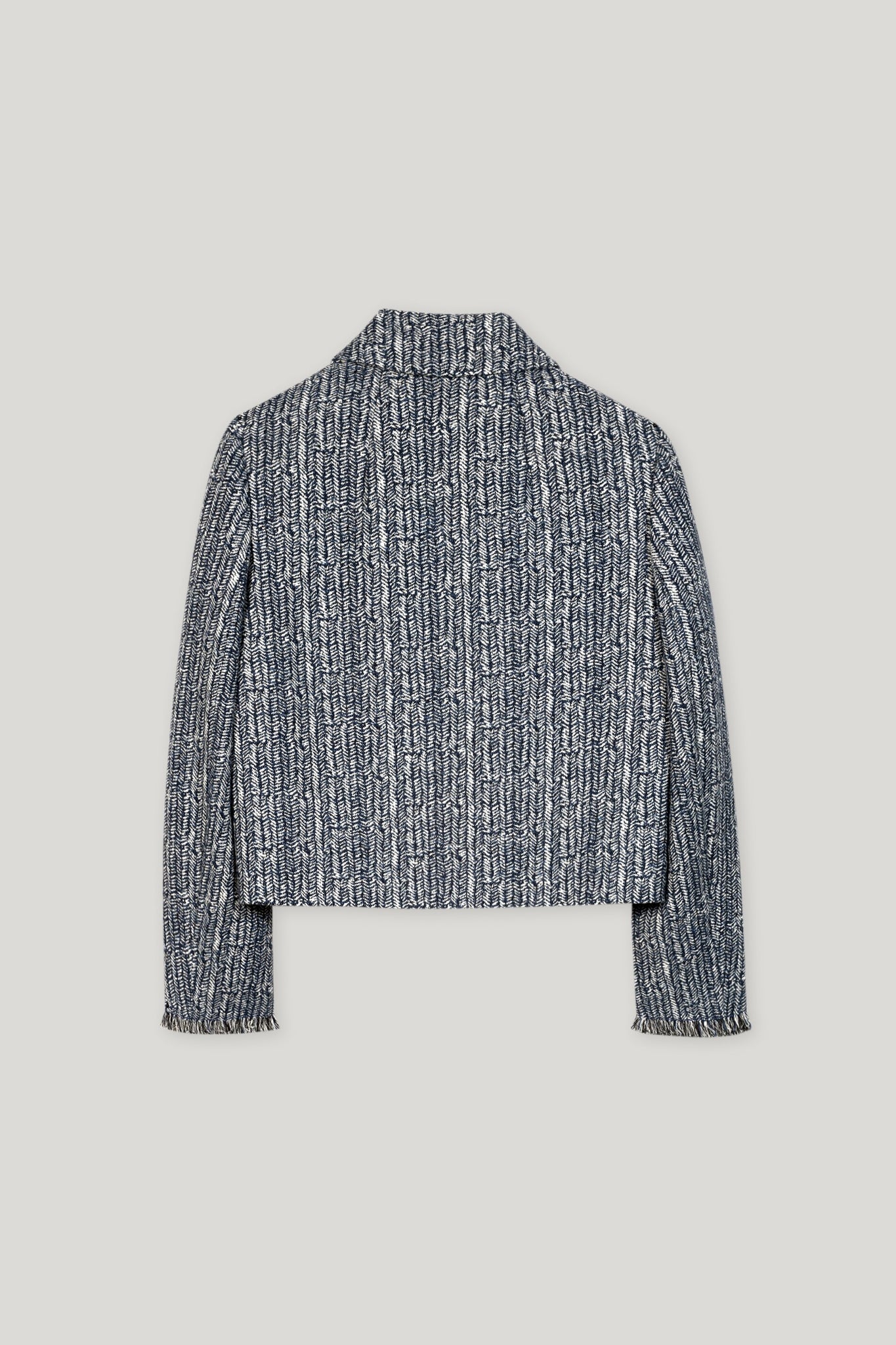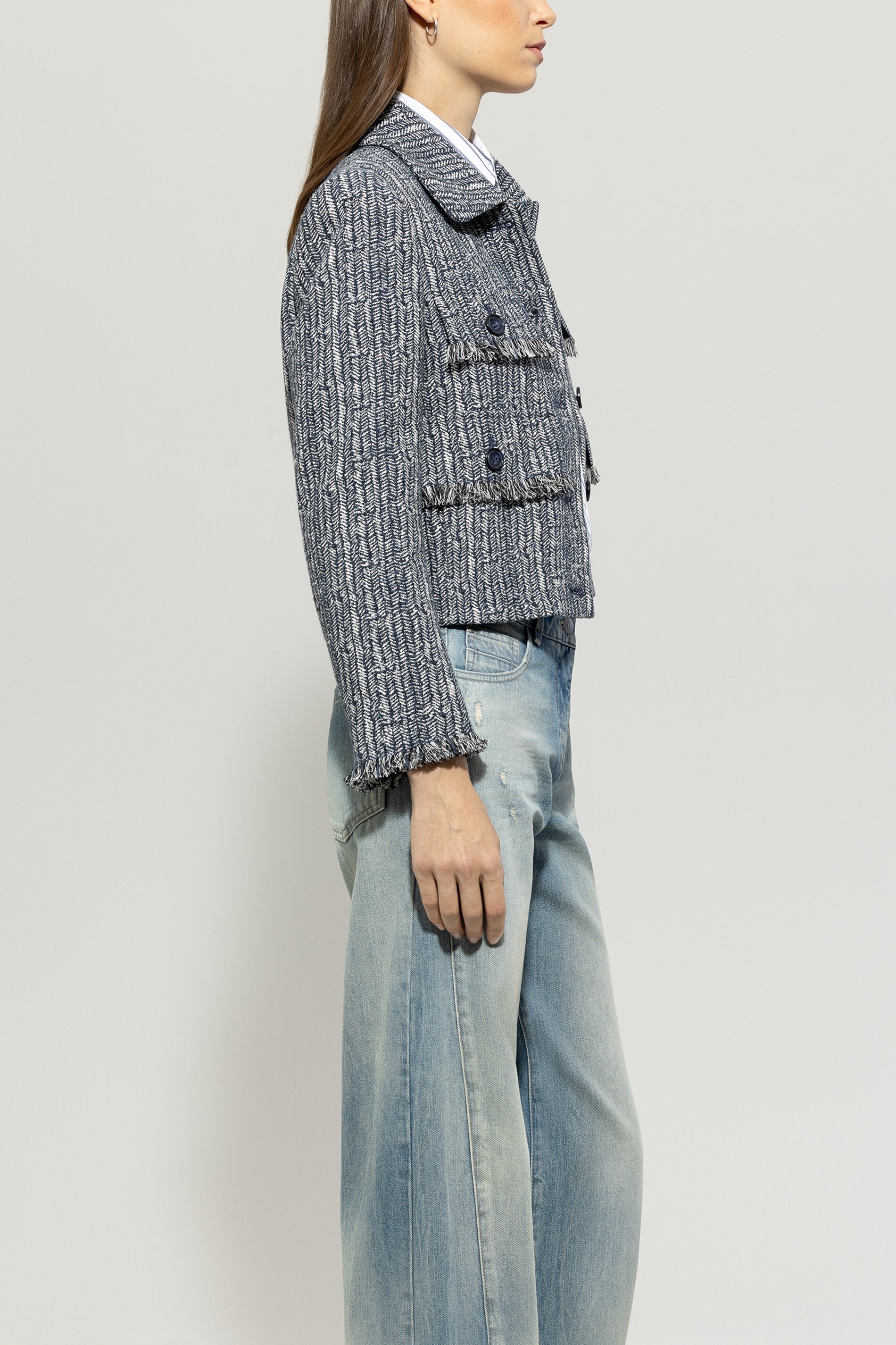 A boxy cropped jacket made from a sporty cotton blend with a coarse herringbone weave. Four faux flap pockets with buttons and fringed details complete the design.