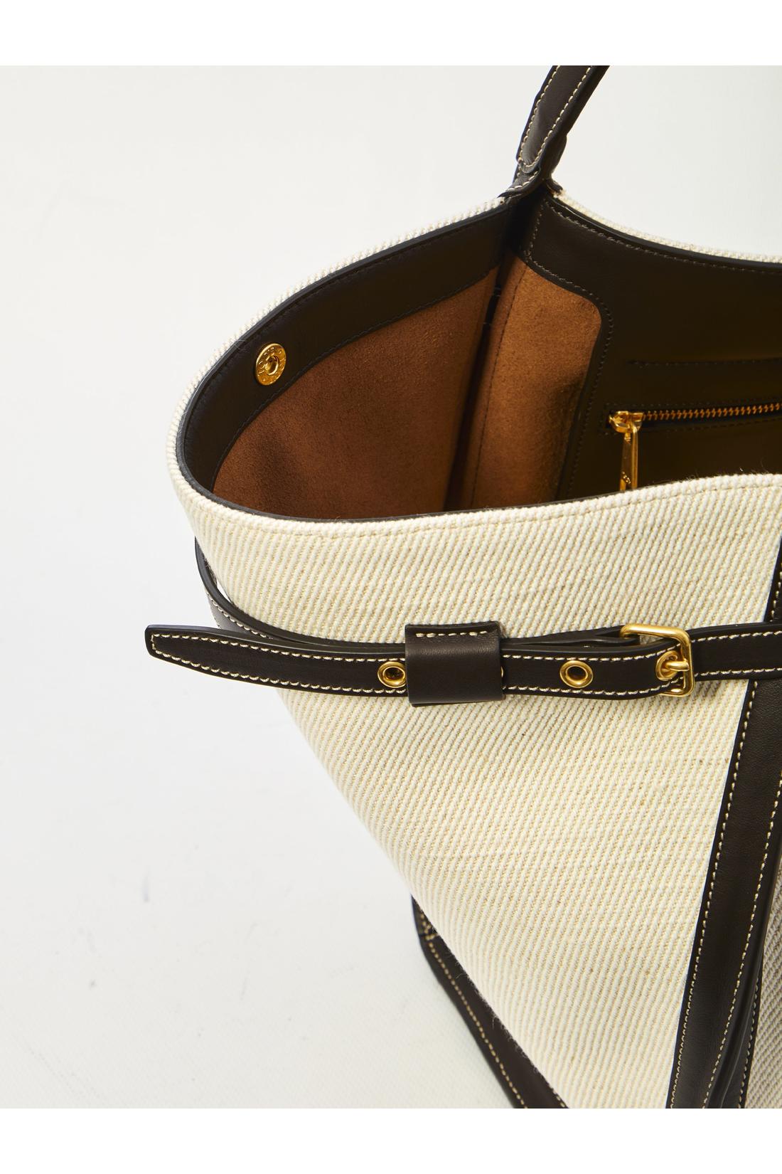 White mixed linen canvas shopping bag with smooth brown leather inserts. It features two fixed top handles, an adjustable external strap, a custom metal T Timeless accessory, metal feet, a hook closure with the Tod’s signature embossed, snap buttons to adjust the silhouette, one main compartment, an internal zip pocket, and a suede leather lining. Dustbag included. Any imperfections in the leather should not be considered manufacturing defects but rather a characteristic of the material.