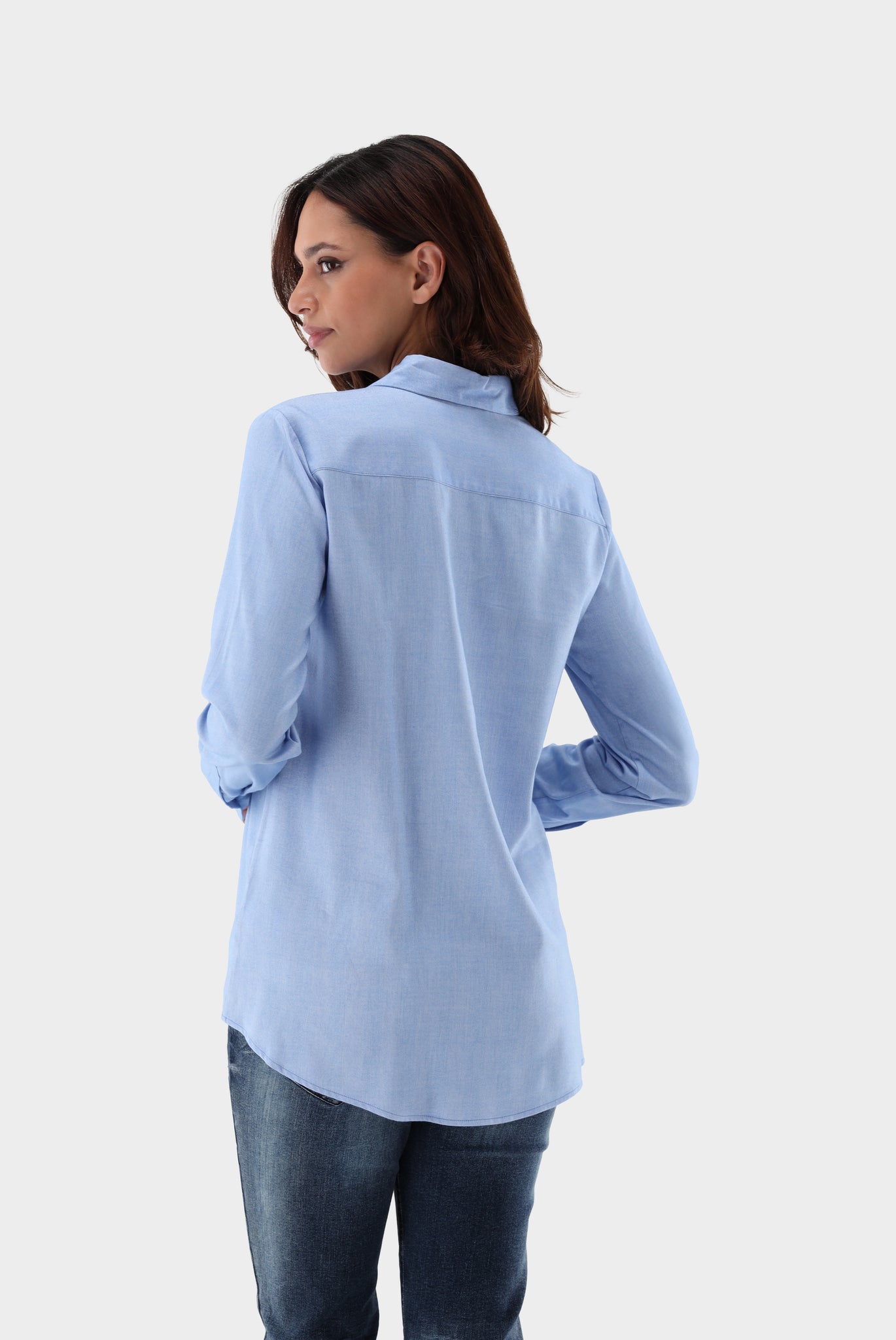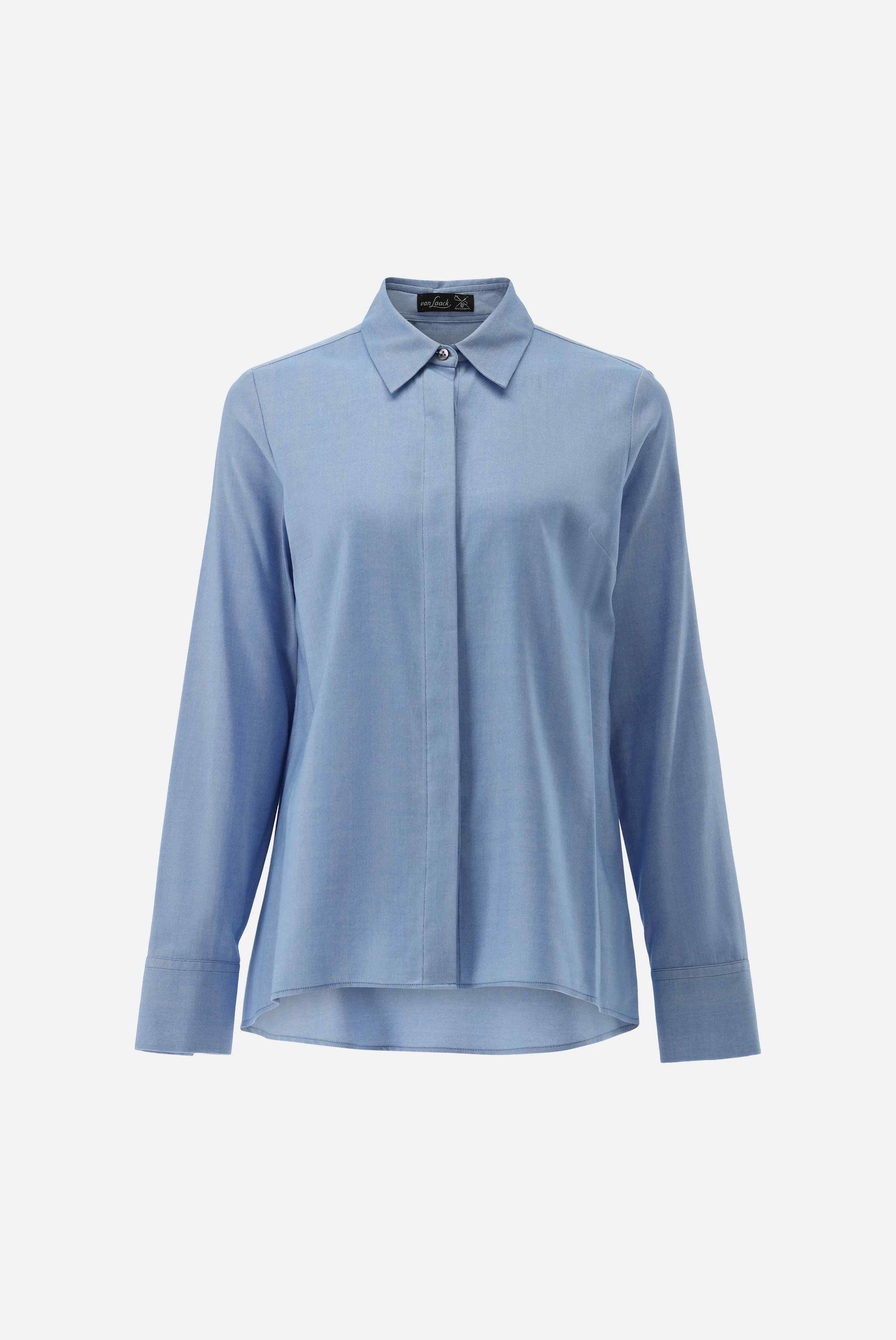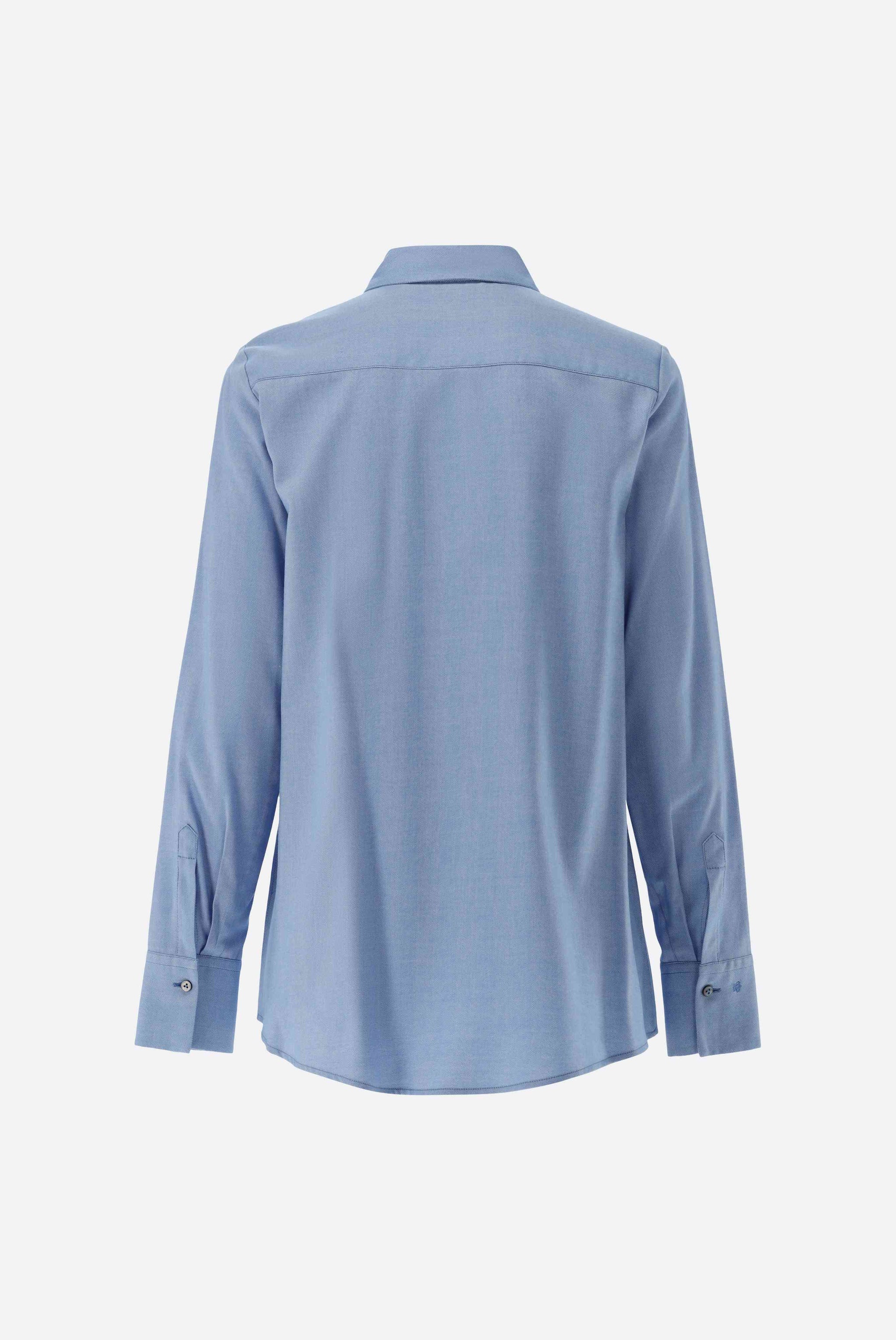 A slightly flared long-sleeved shirt blouse with a gently flared hem. Made with cotton and lyocell in a woven flannel. The blouse features a concealed button placket with mother-of-pearl buttons and a classic shirt collar.
