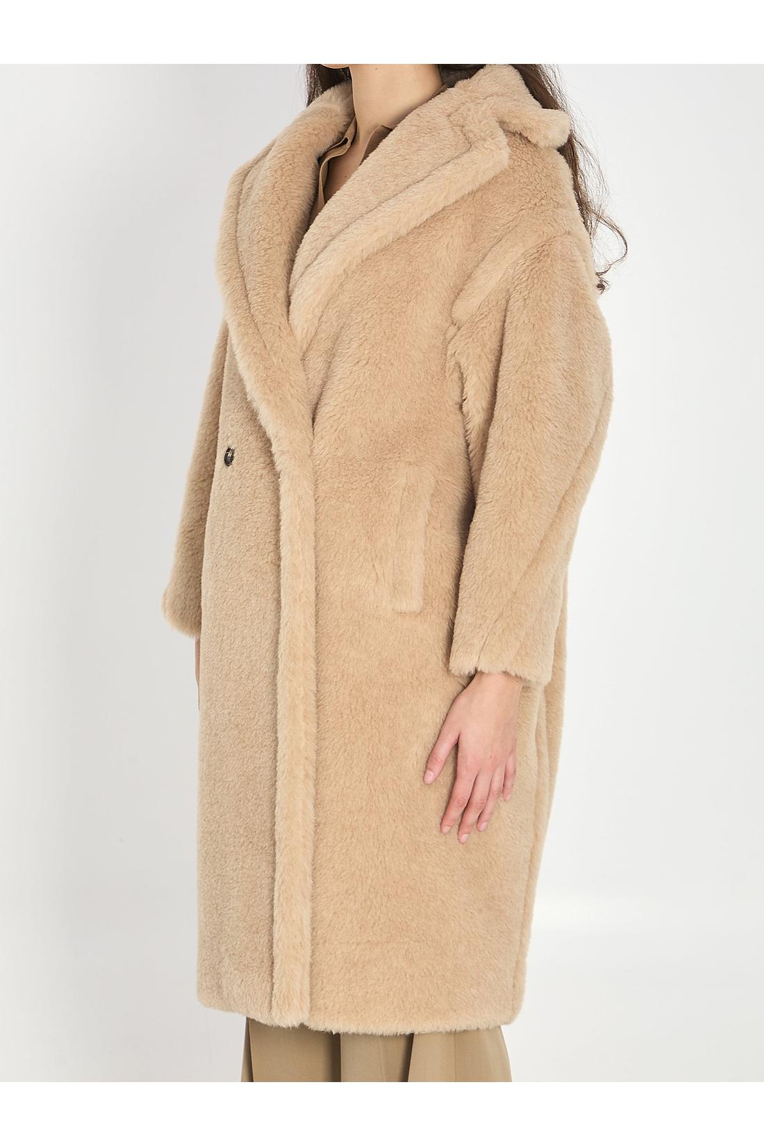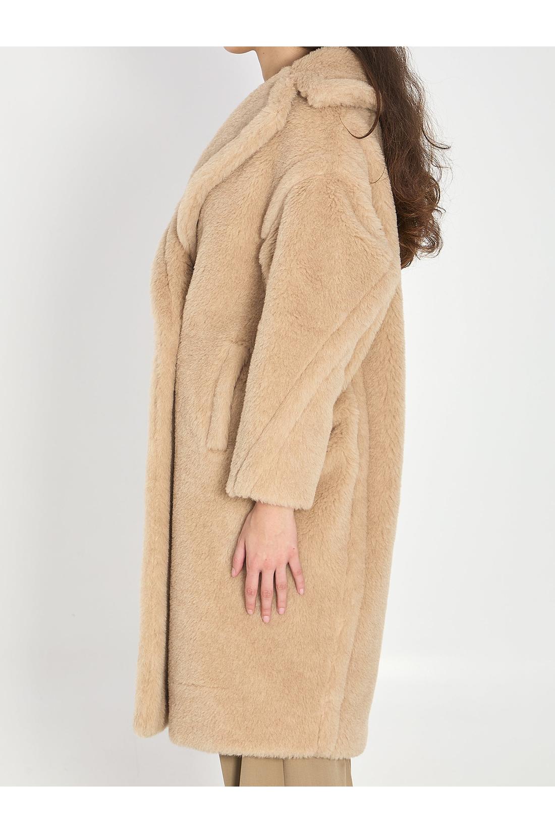 Beige Teddy Bear Icon coat in alpaca and wool. It features classic lapels, double-breasted front closure with two buttons, two welt pockets on the front, long sleeves with dropped shoulders, and a custom viscose lining. Loose fit.