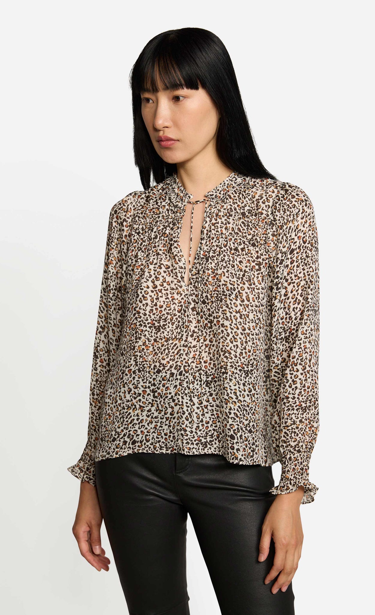 Die feinen Kräuselungen im vorderen und hinteren Schulterbereich und die voluminösen Ärmel mit gesmoktem Saumabschluss komplettieren den femininen Look.