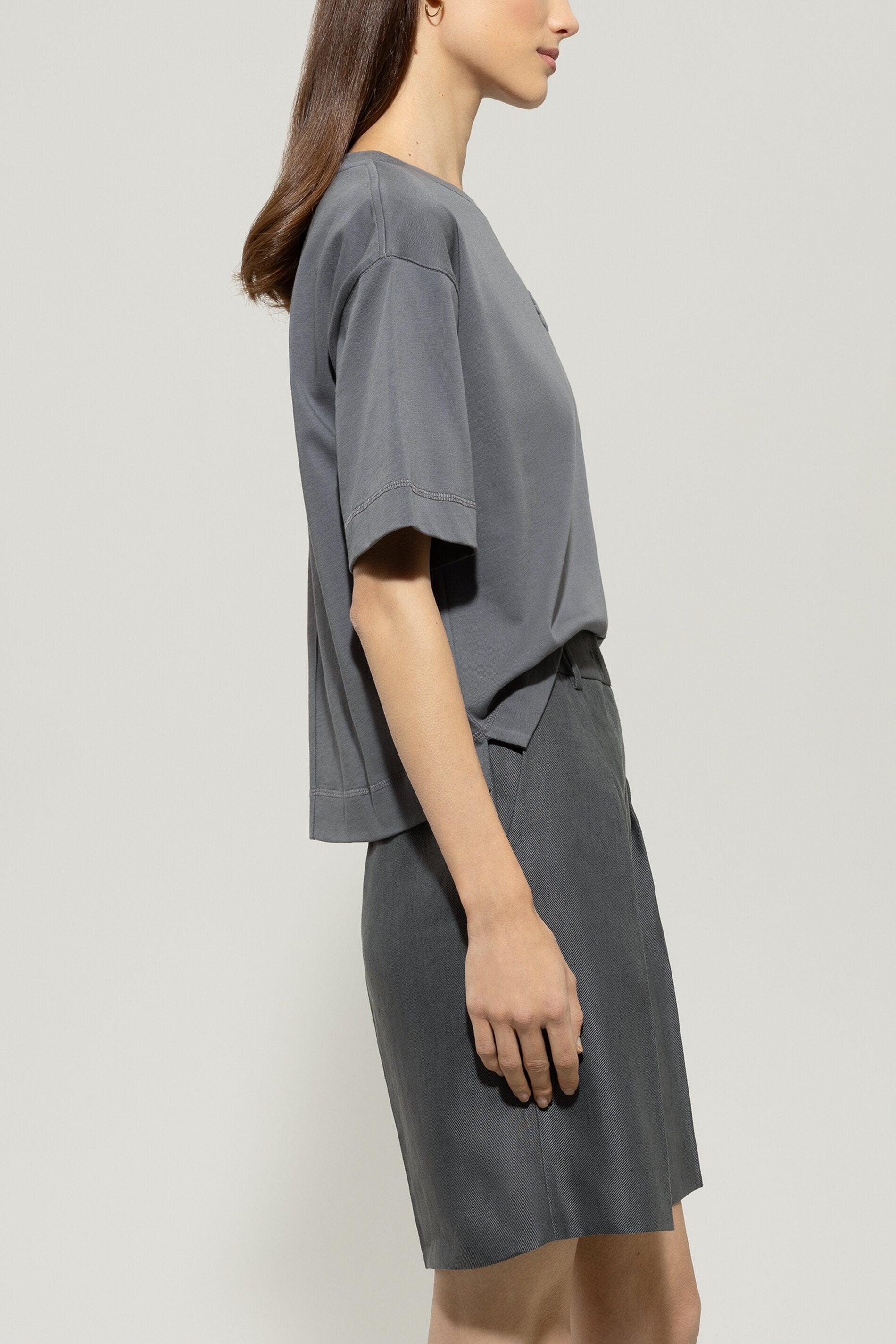 Leger geschnittenes T-Shirt aus nachhaltigem Baumwoll-Jersey mit Rundhalsausschnitt, überschnittenen Schultern und geprägtem Blumen-Detail. Der Saum ist mit kurzen Seitenschlitzen versehen.
