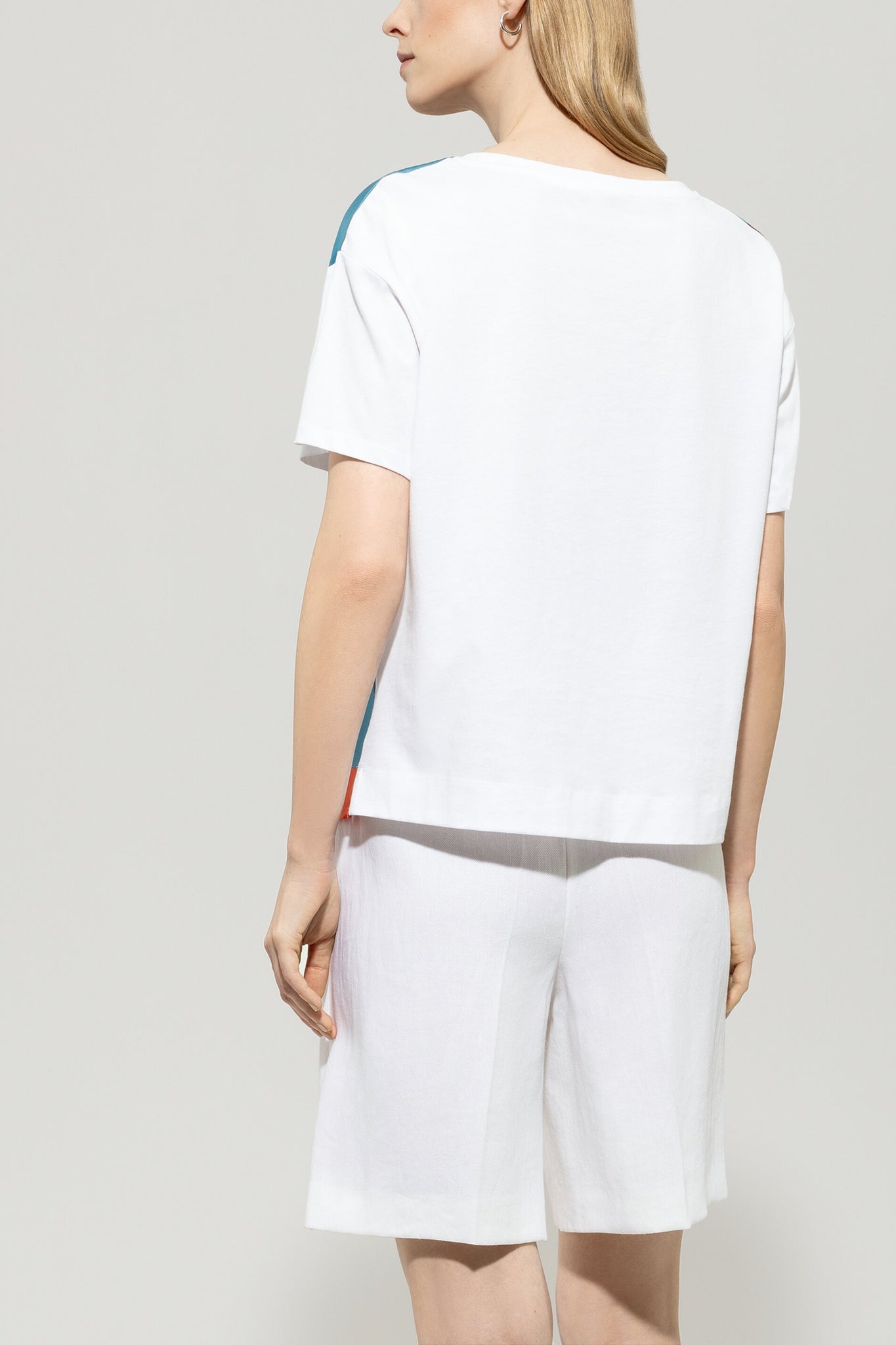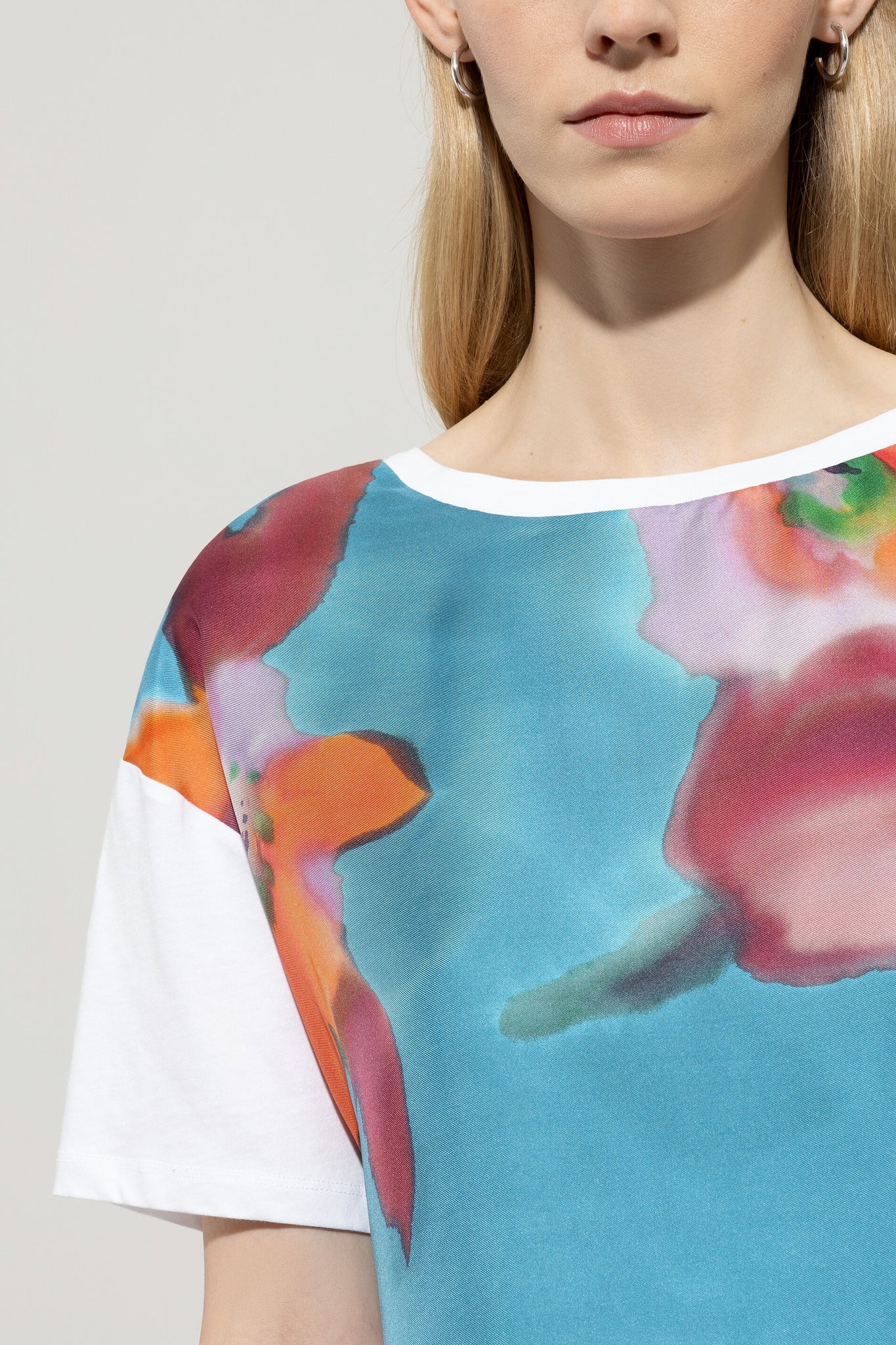 Locker geschnittenes T-Shirt aus Seide und Baumwolle mit farbenfrohem Hibiskus-Print auf der Vorderseite. Zudem verfügt das T-Shirt über einen Rundhalsausschnitt und lässig überschnittene Schultern.