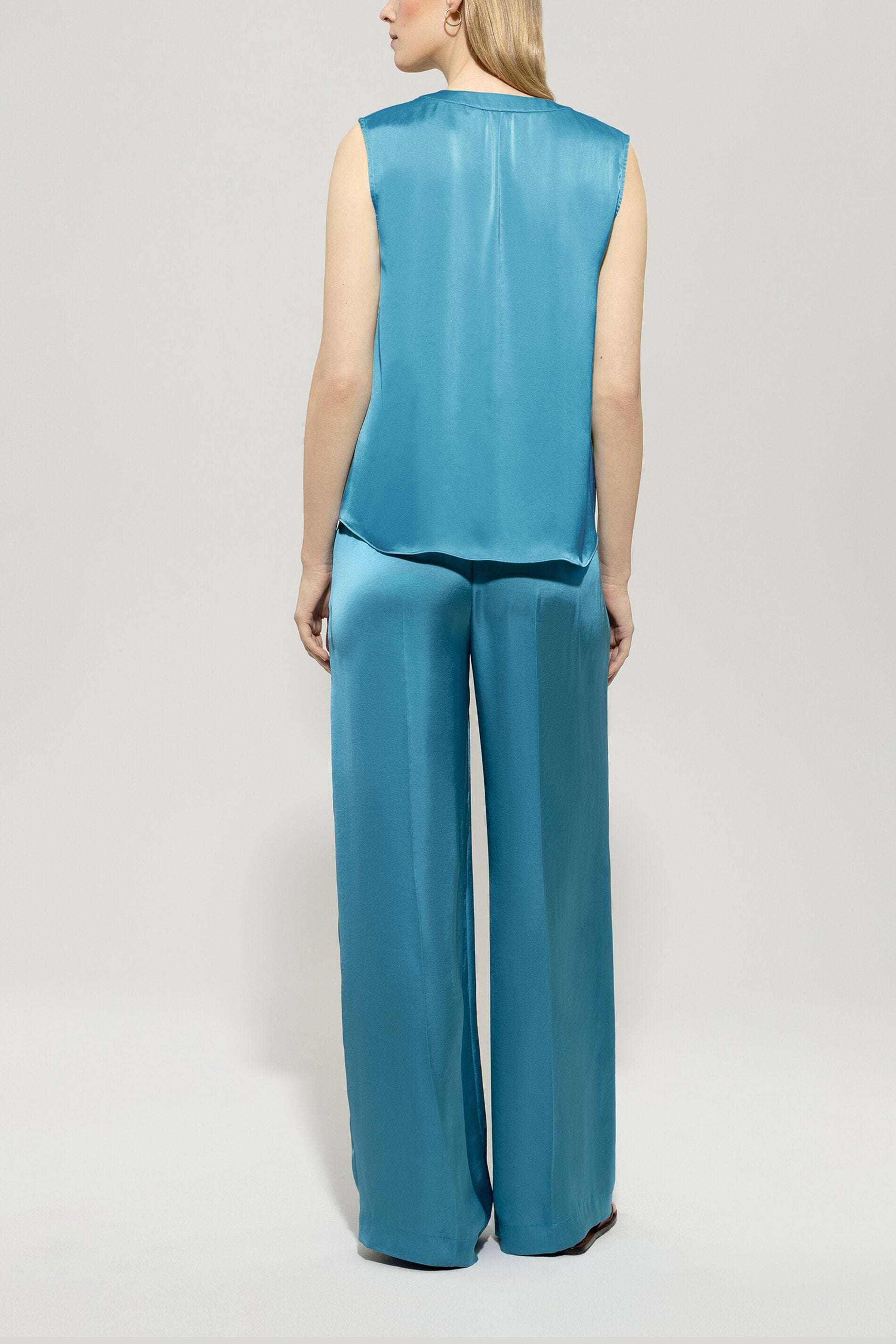Wideleg-Pants aus fließender Techno-Seide mit edlem Glanz. Bundfalten, zwei Seitentaschen und zwei angedeuteten Gesäßtaschen mit Patten vollenden den modernen Look.