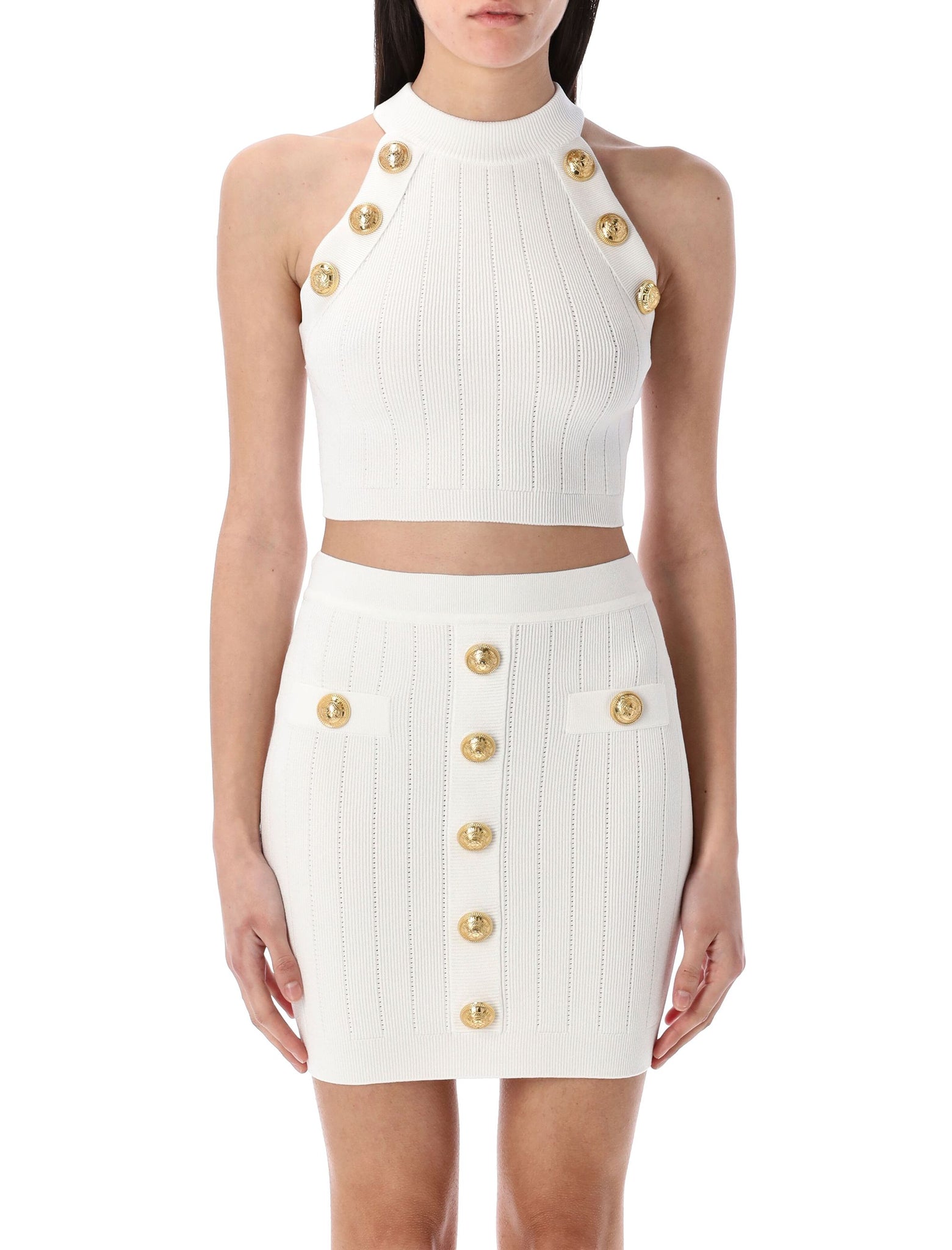 Elevate your style with the Balmain 6-button knit halterneck top. This chic piece features a halterneck collar and embossed gold-tone buttons, perfect for any occasion. Crafted from a luxurious blend, it's a must-have addition to your wardrobe!