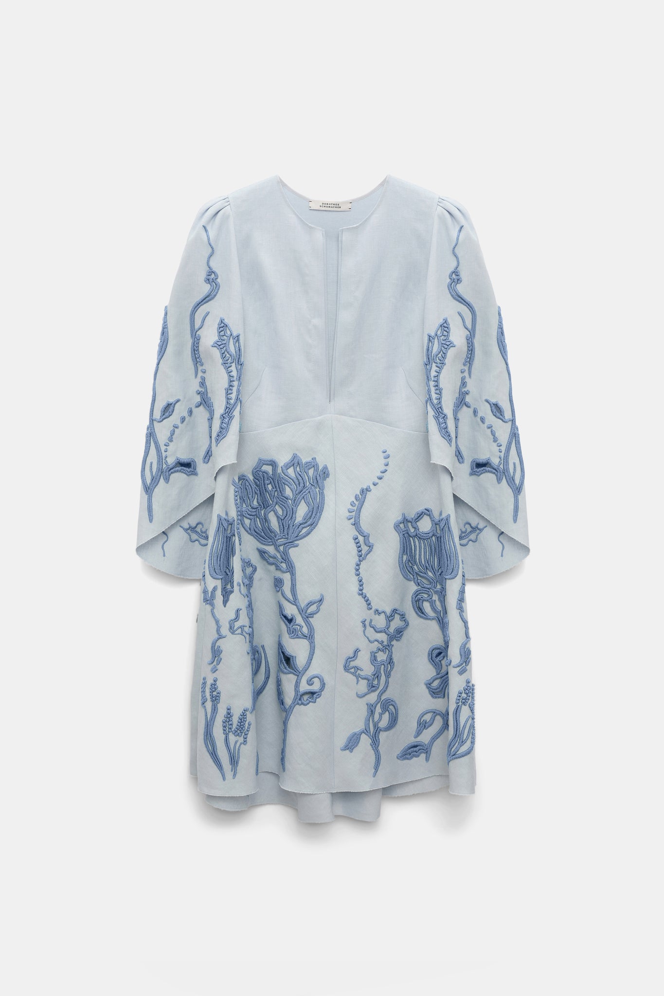 This short dress in embroidered linen impresses with its playful silhouette. The full skirt and cape-like puff sleeves accentuate the design. Placed thread embroidery showcases the collection's signature motif.