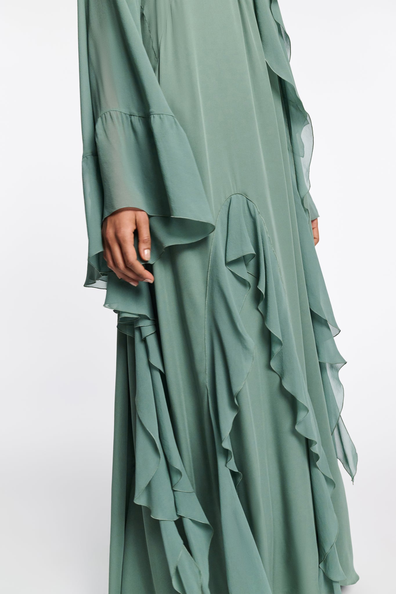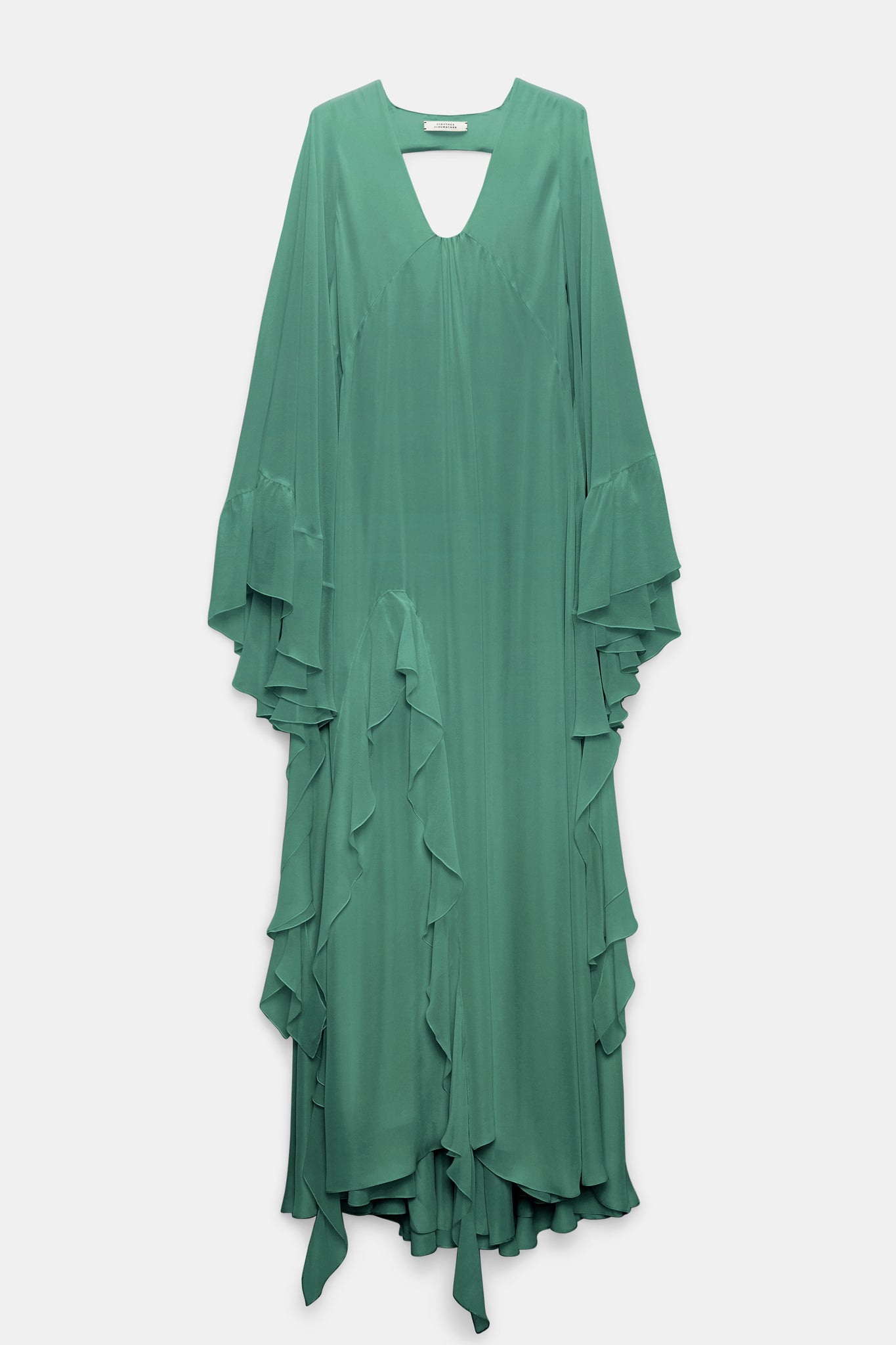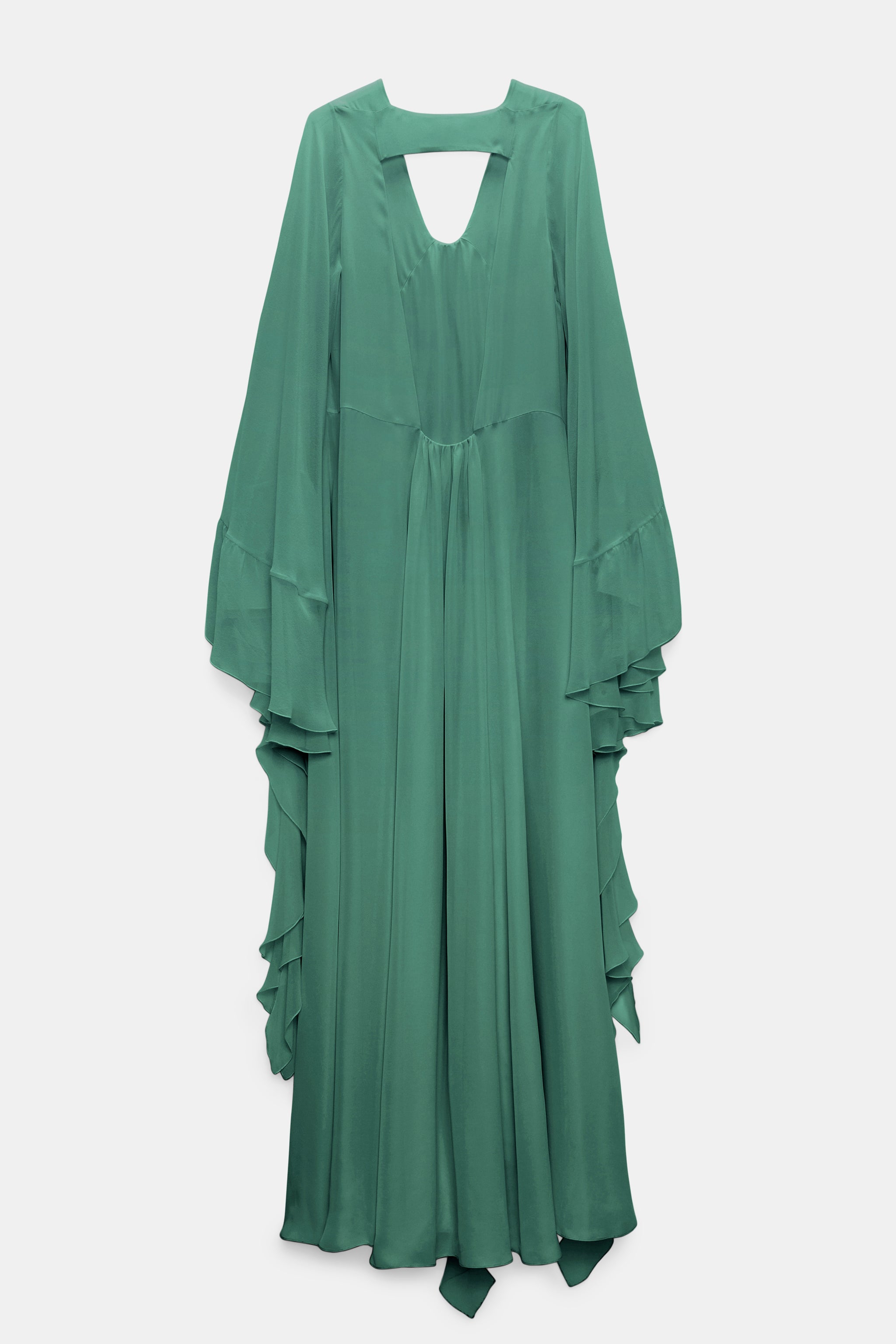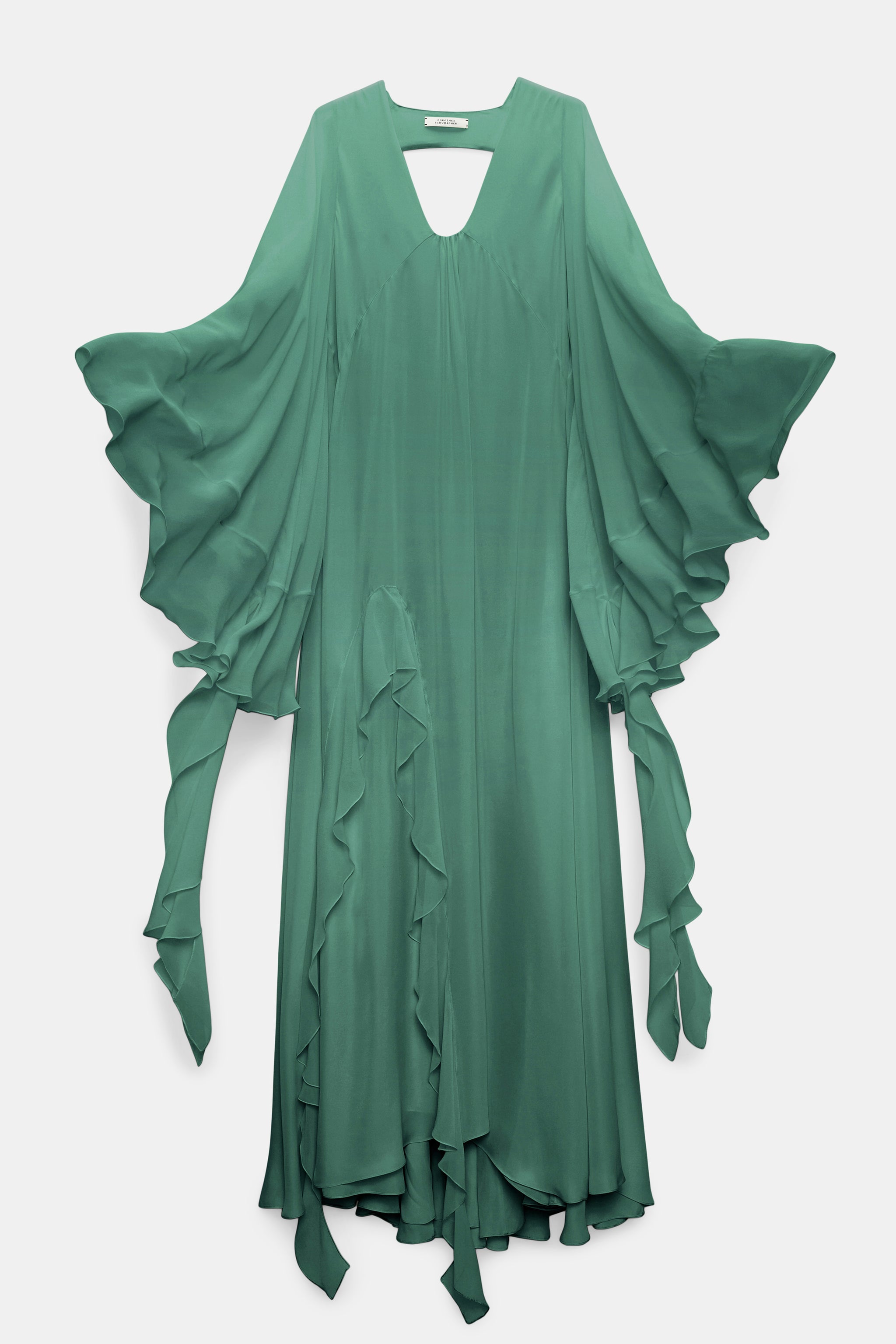 This silk maxi dress impresses with its deep back and separate flounced scarf. Voluminous kaftan sleeves with attached flounces accentuate the flowing silhouette.