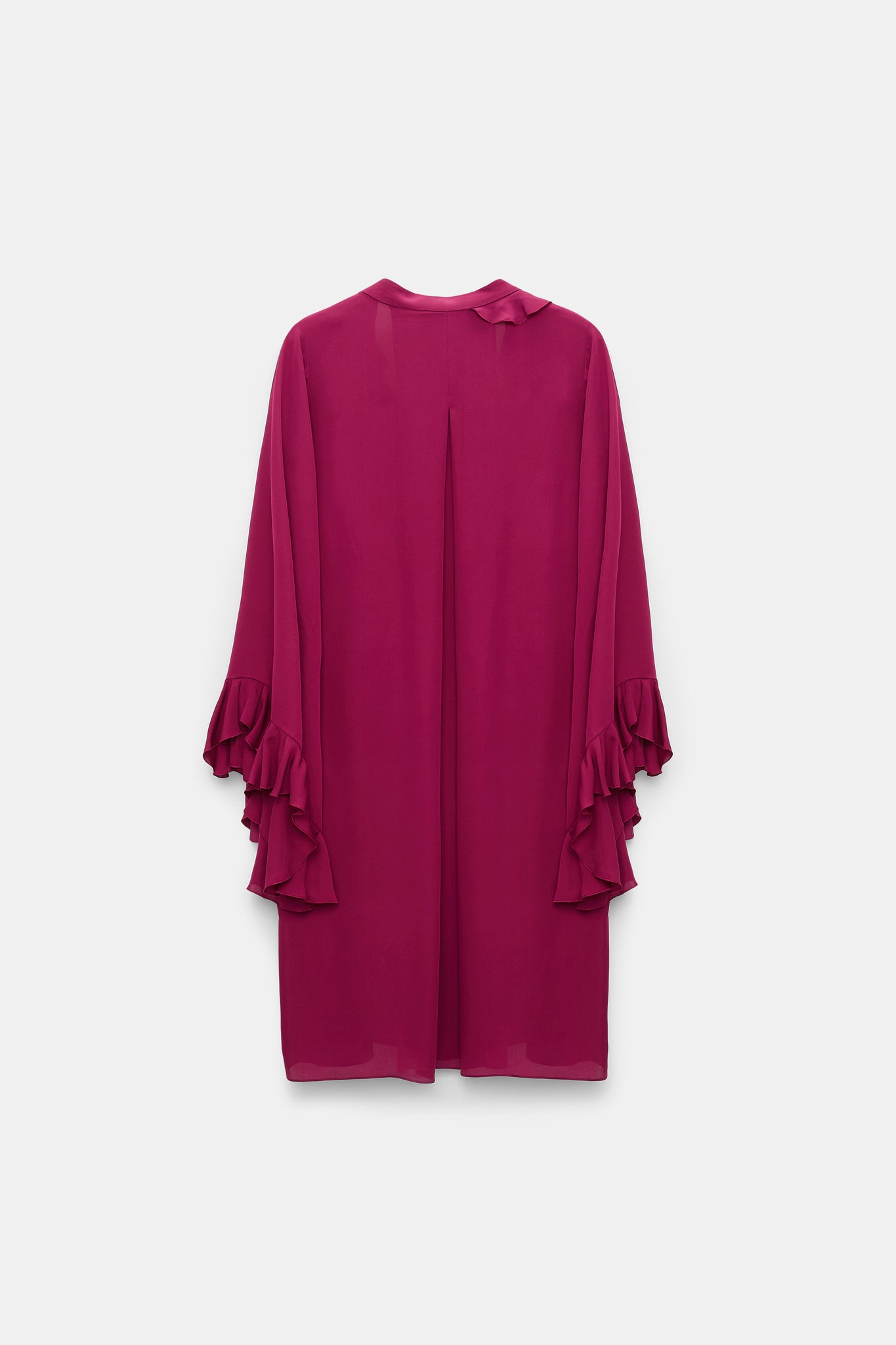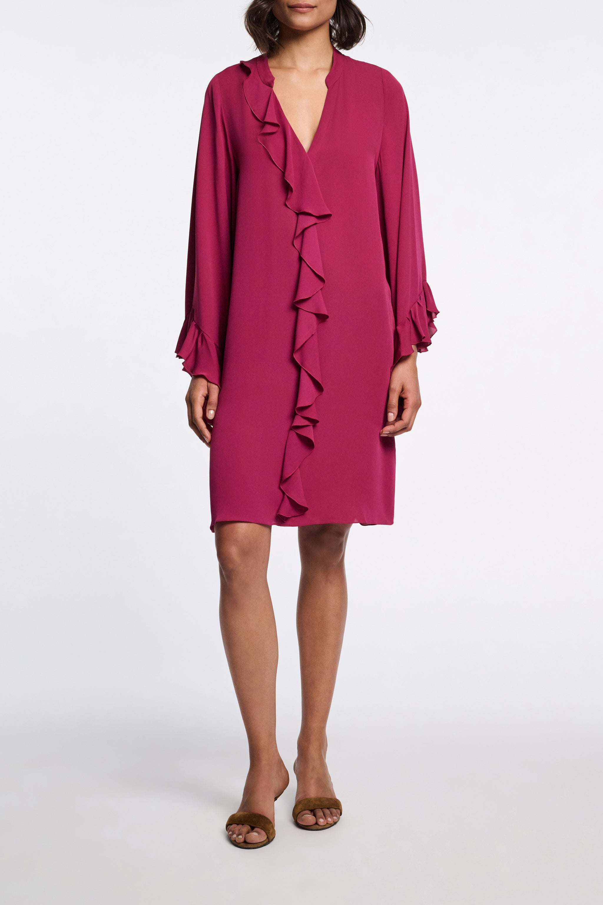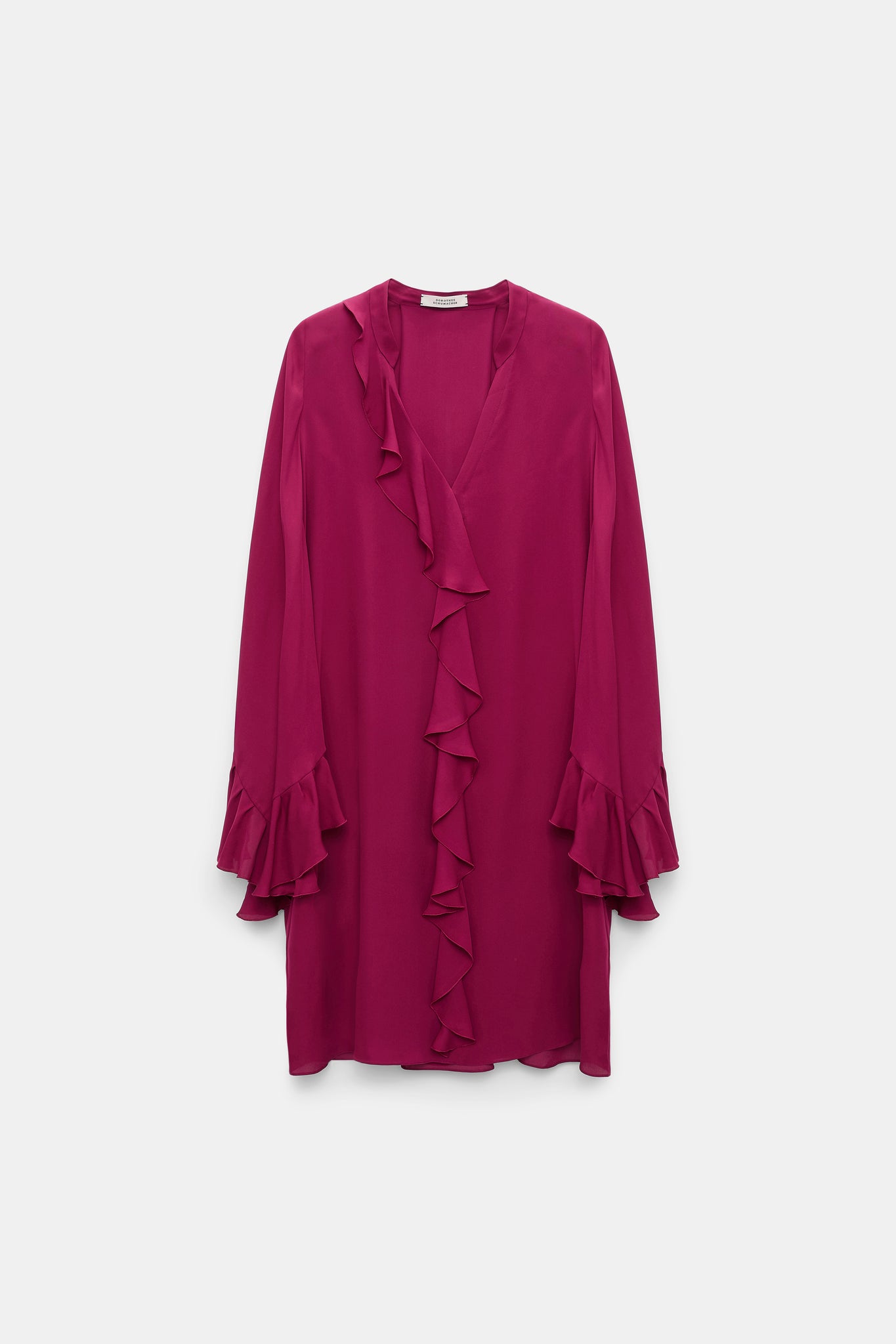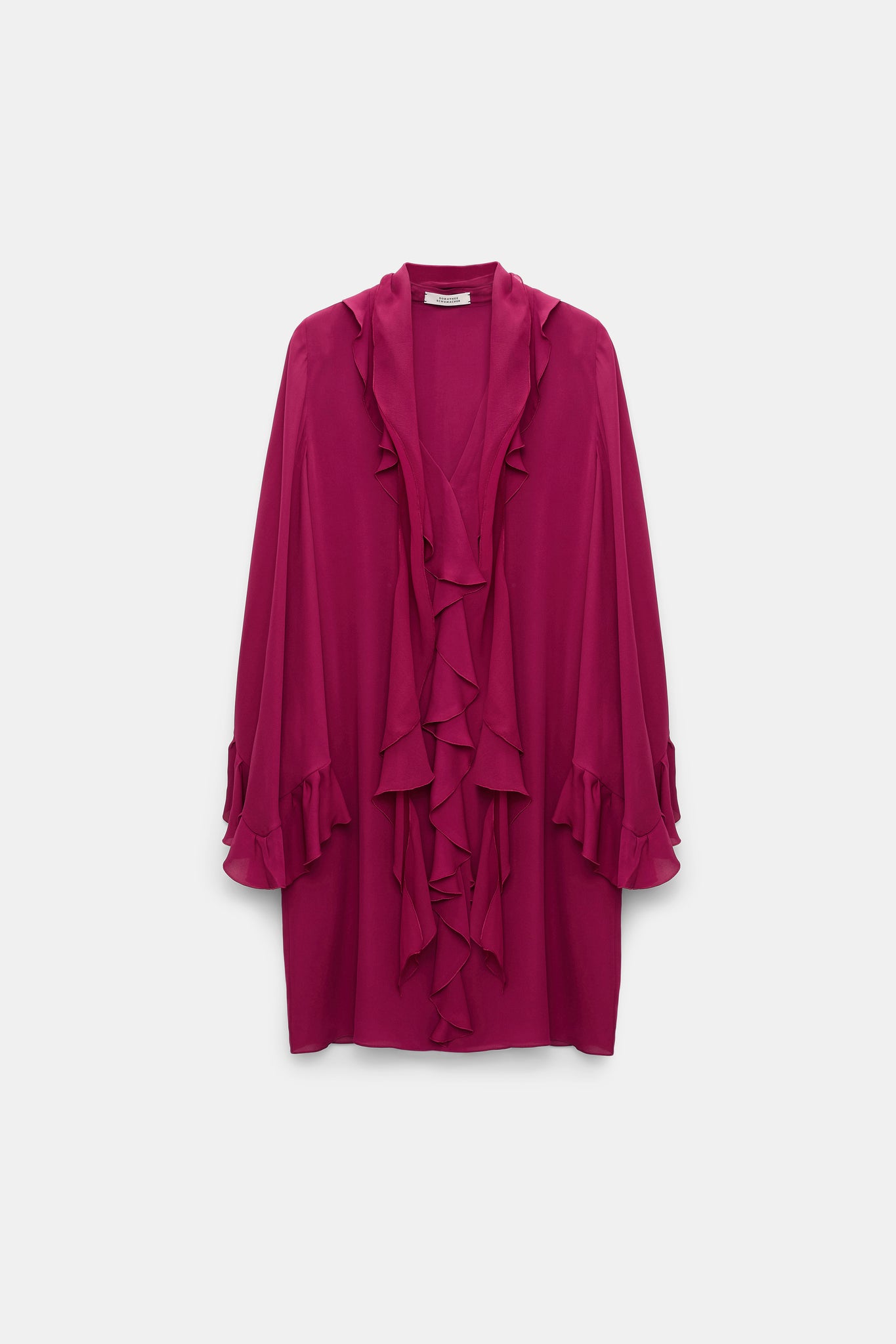 The dress is made of silk and has a flowing silhouette. Ruffle details and voluminous kaftan sleeves characterize the design. The integrated ruffled scarf allows for different styling options.