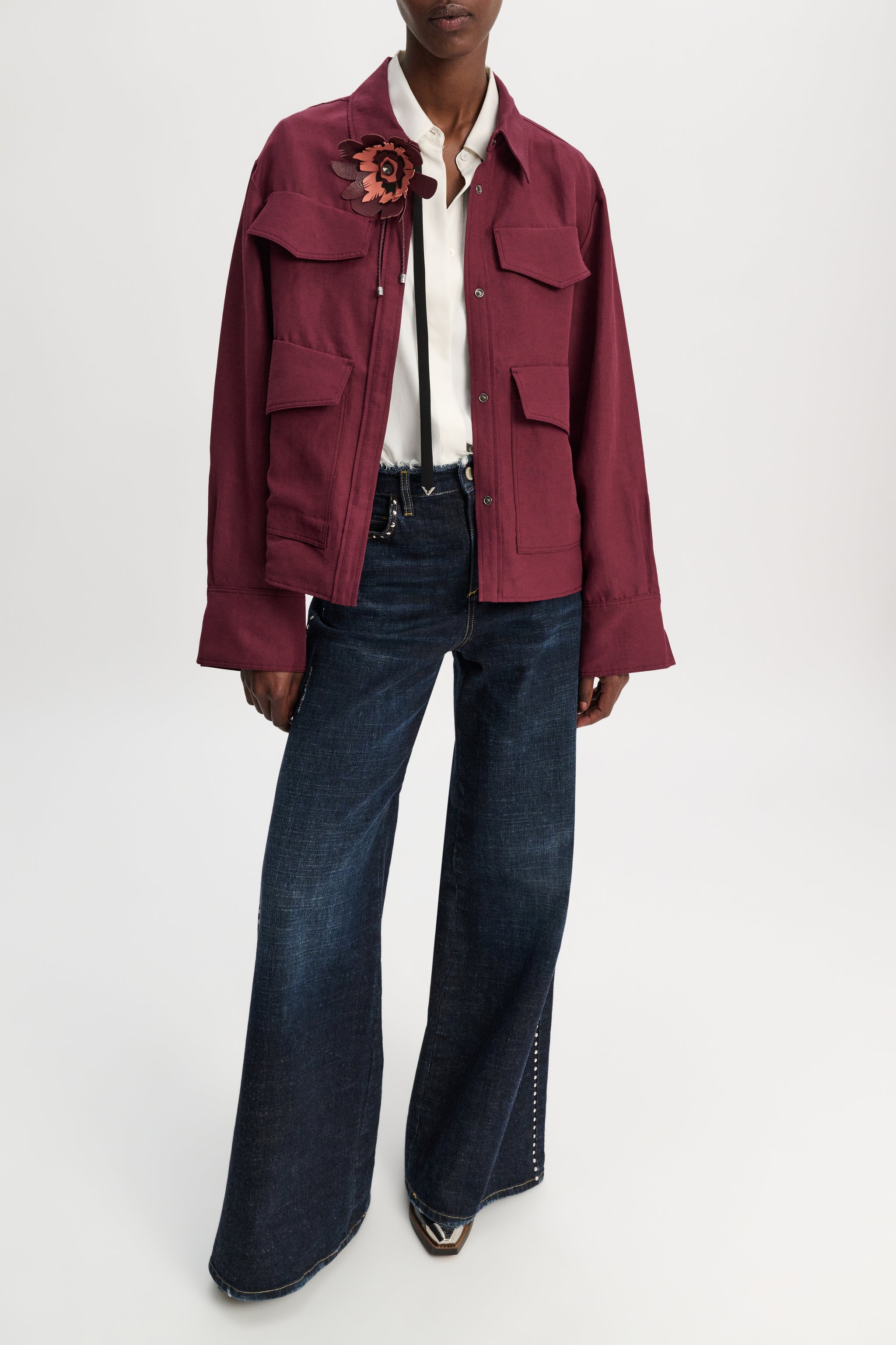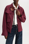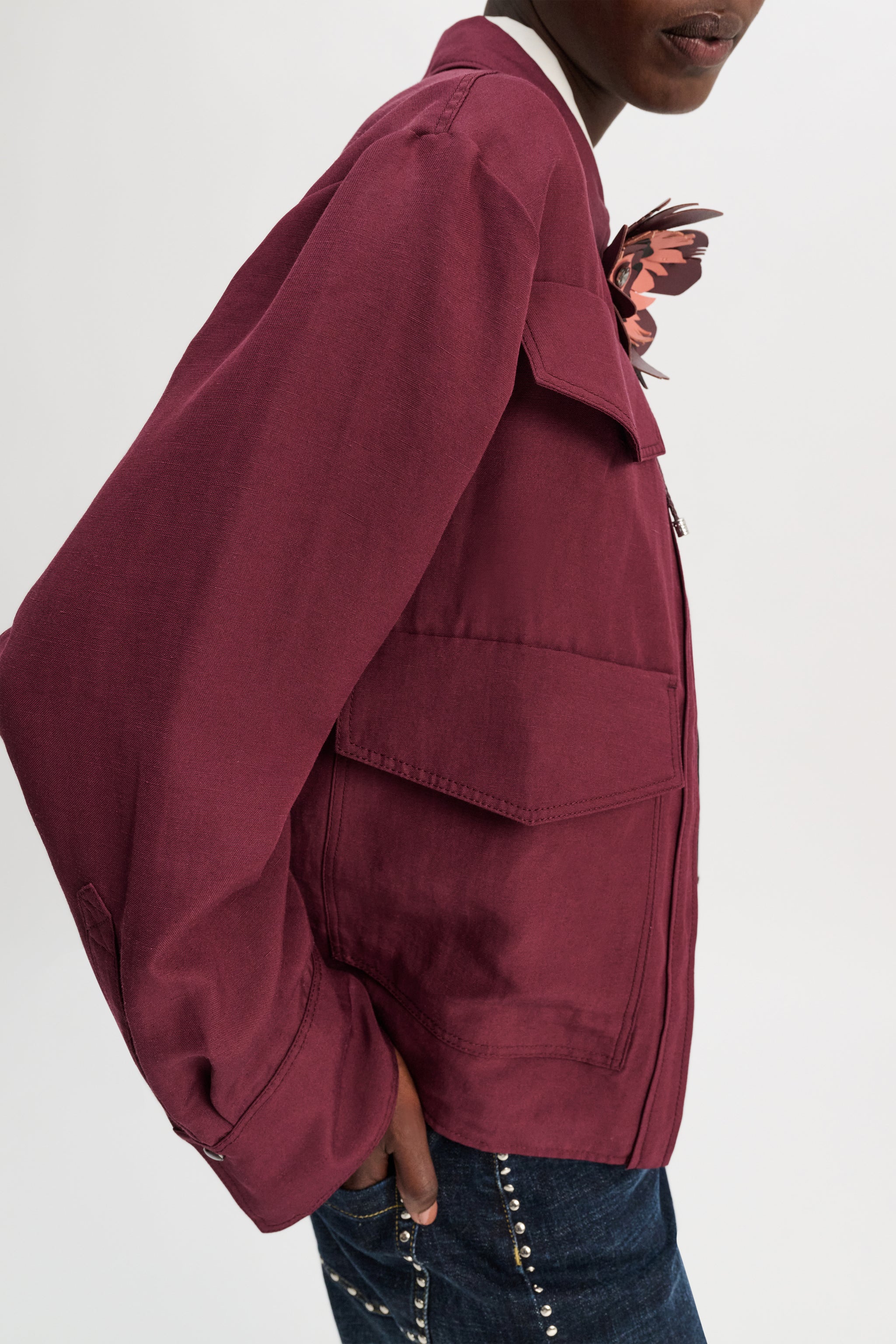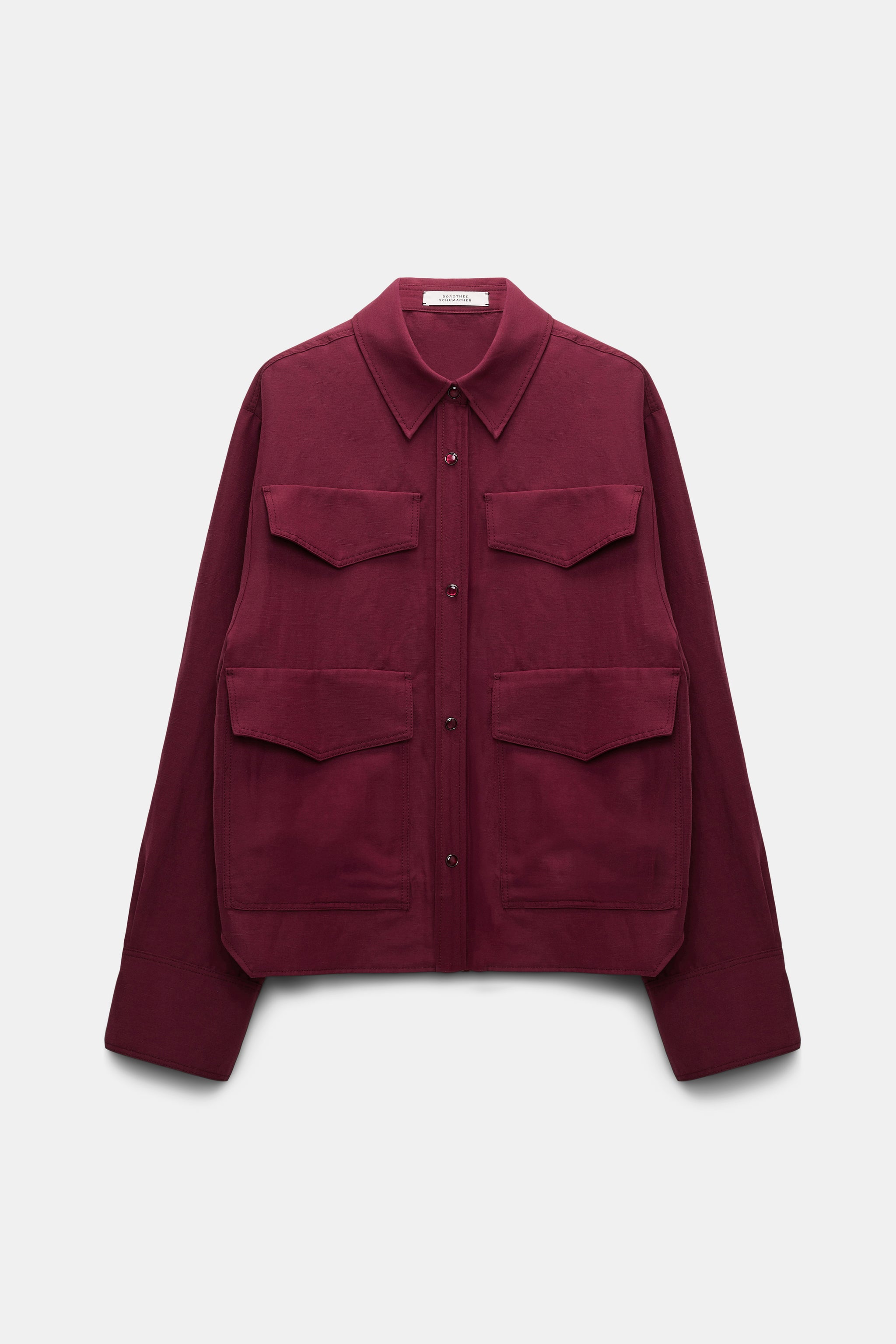 The linen blend in Bordeaux is the new suiting: The cropped shirt jacket has a slightly oversized fit. Snap buttons and patch pockets give the jacket a sporty finish.