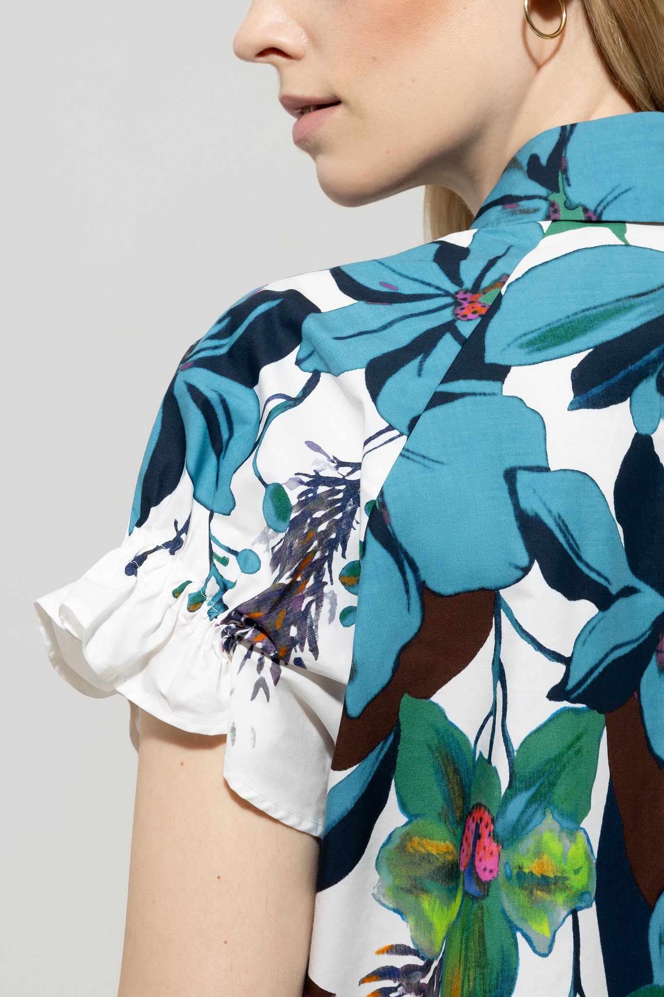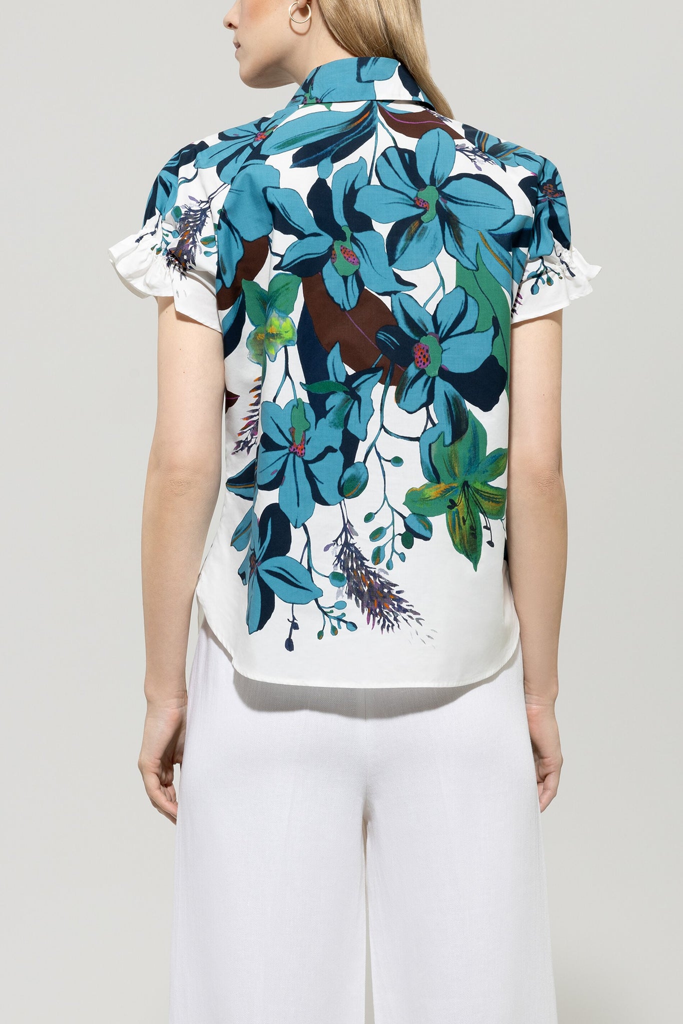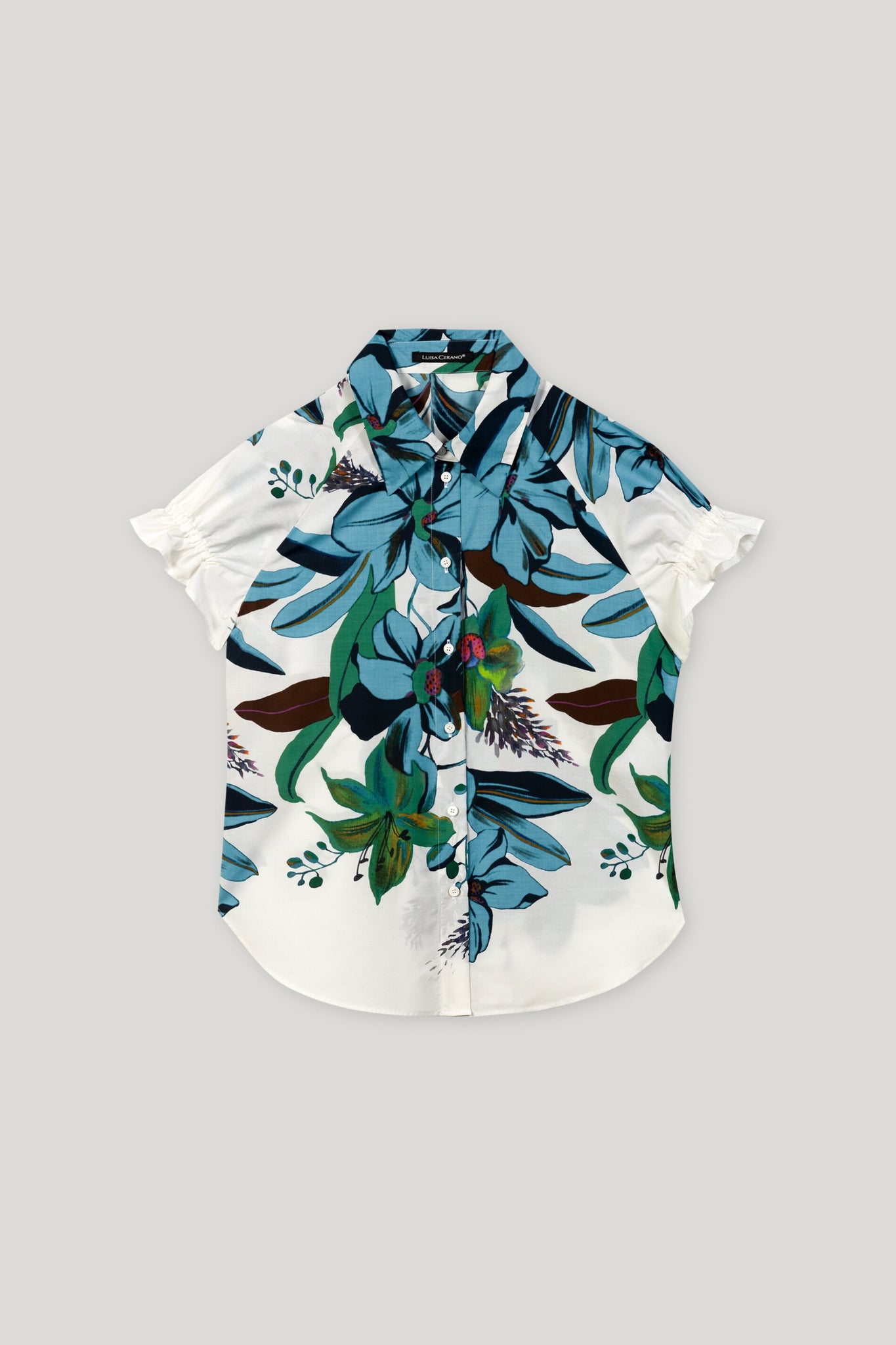 Feminine Bluse aus leichter Baumwoll-Popeline mit exklusivem Blumen-Dessin. Das Oberteil verfügt über einen klassischen Kragen, eine durchgehende Knopfleiste sowie kurze Ärmel mit verspielten Raffdetails.