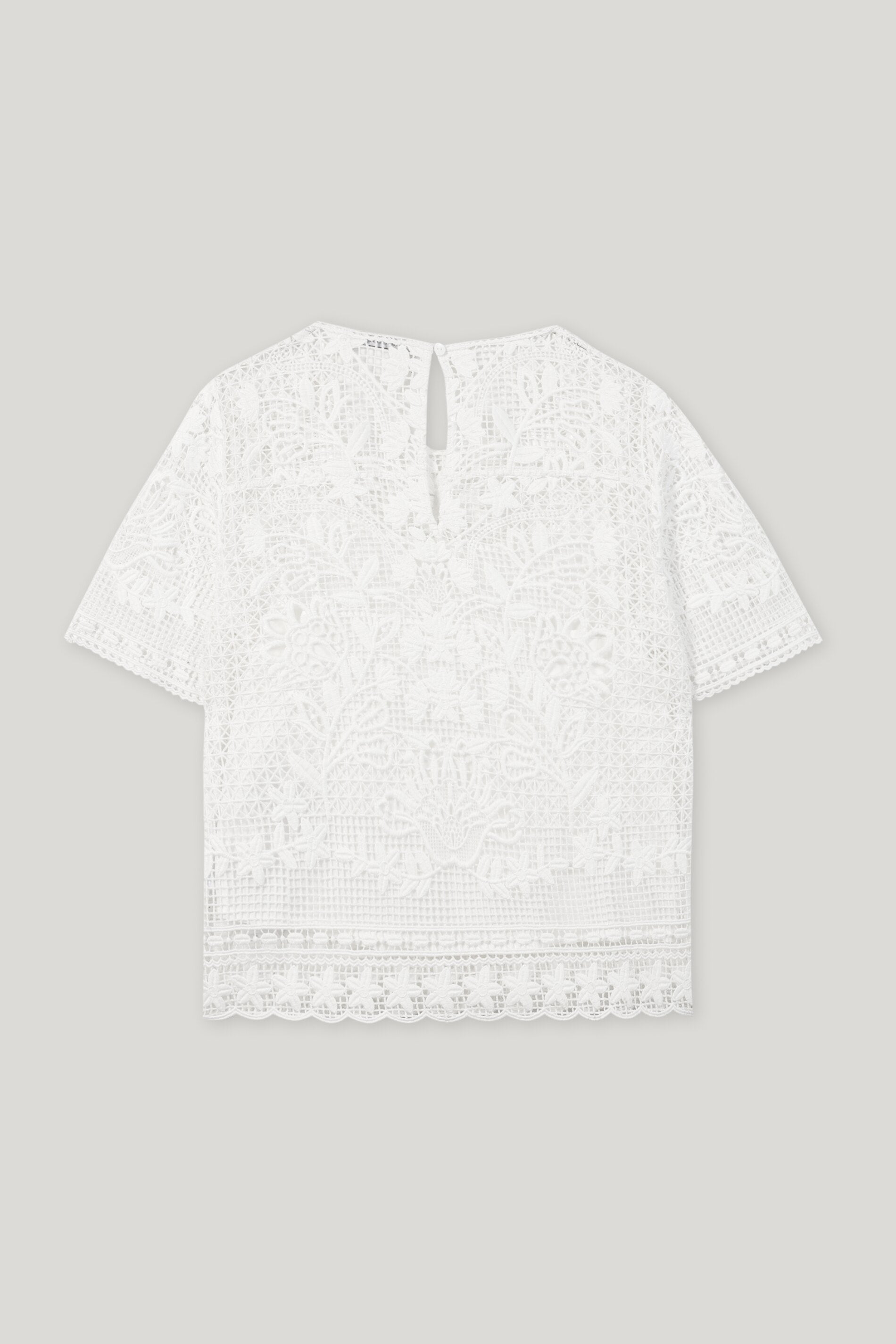 Edle Spitzen-Bluse mit floraler Stickerei und separatem Untertop. Die Bluse verfügt über einen Rundhalsausschnitt mit Knopfverschluss an der Rückseite.