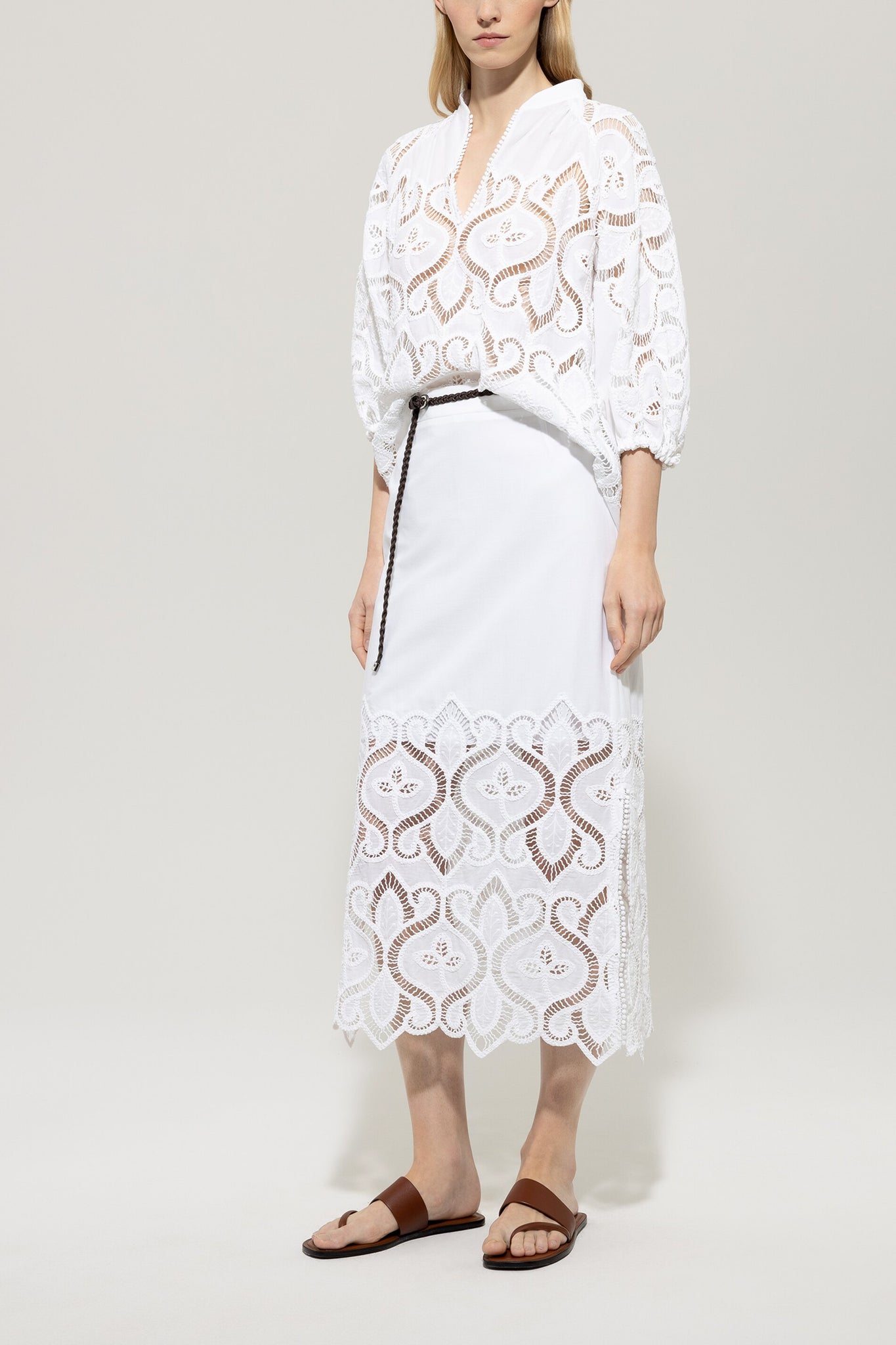 Ausgestellte Tunikabluse aus feinem Baumwoll-Voile mit aufwendiger Lochstickerei. Der V-Ausschnitt ist mit einem bestickten Saum und einem schmalen Stehkragen gestaltet. Die voluminösen Ärmel schließen mit einem Gummizug ab.