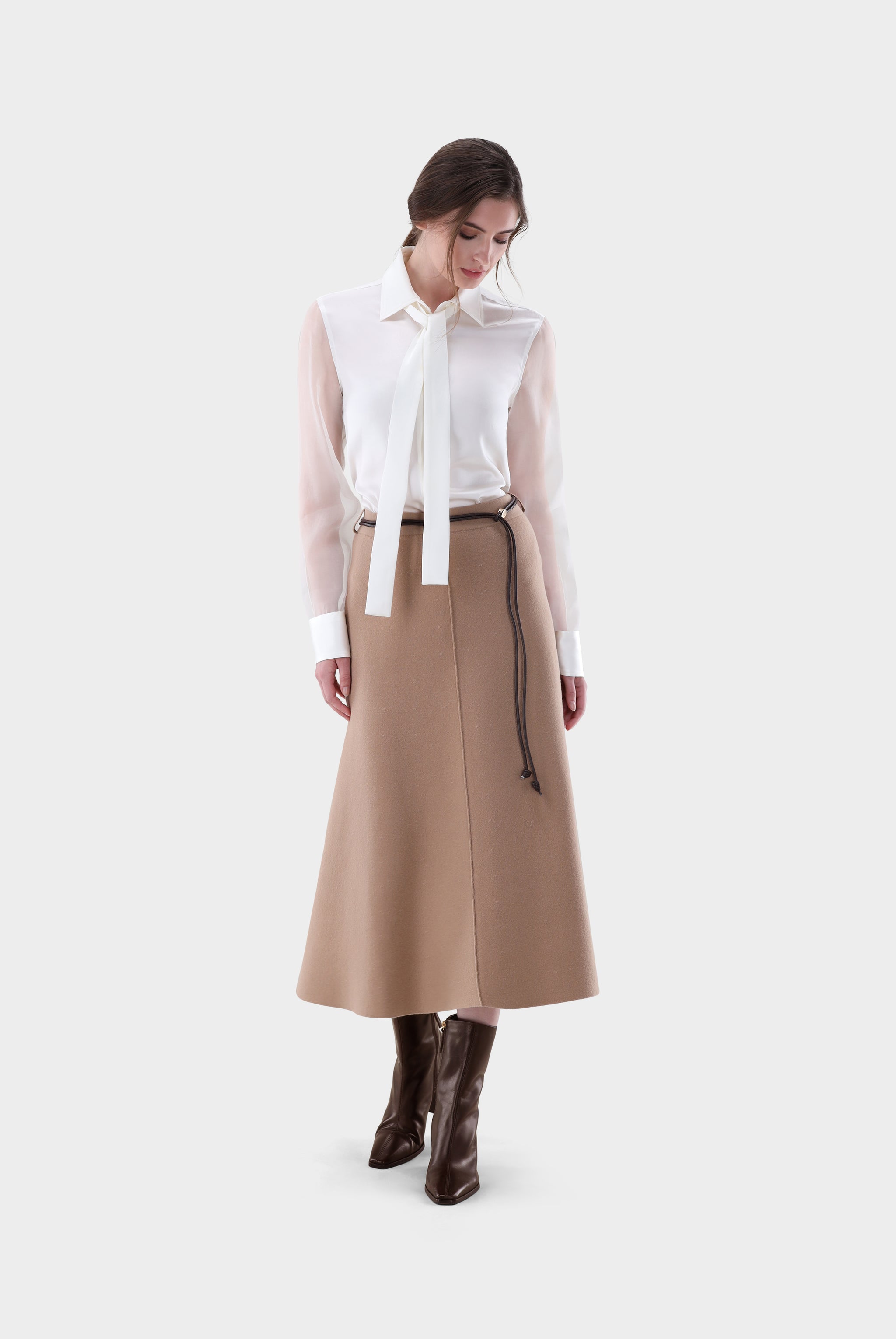 Klassische Hemdbluse mit halb tailliertem Schnitt, gefertigt aus Seide. Die transparenten Ärmel aus Organza und die abnehmbare Schluppe verleihen der Bluse einen eleganten Touch. Sie hat einen figurnahen Schnitt, lange Ärmel mit Manschette und einen leicht geschwungenen Saumverlauf.
