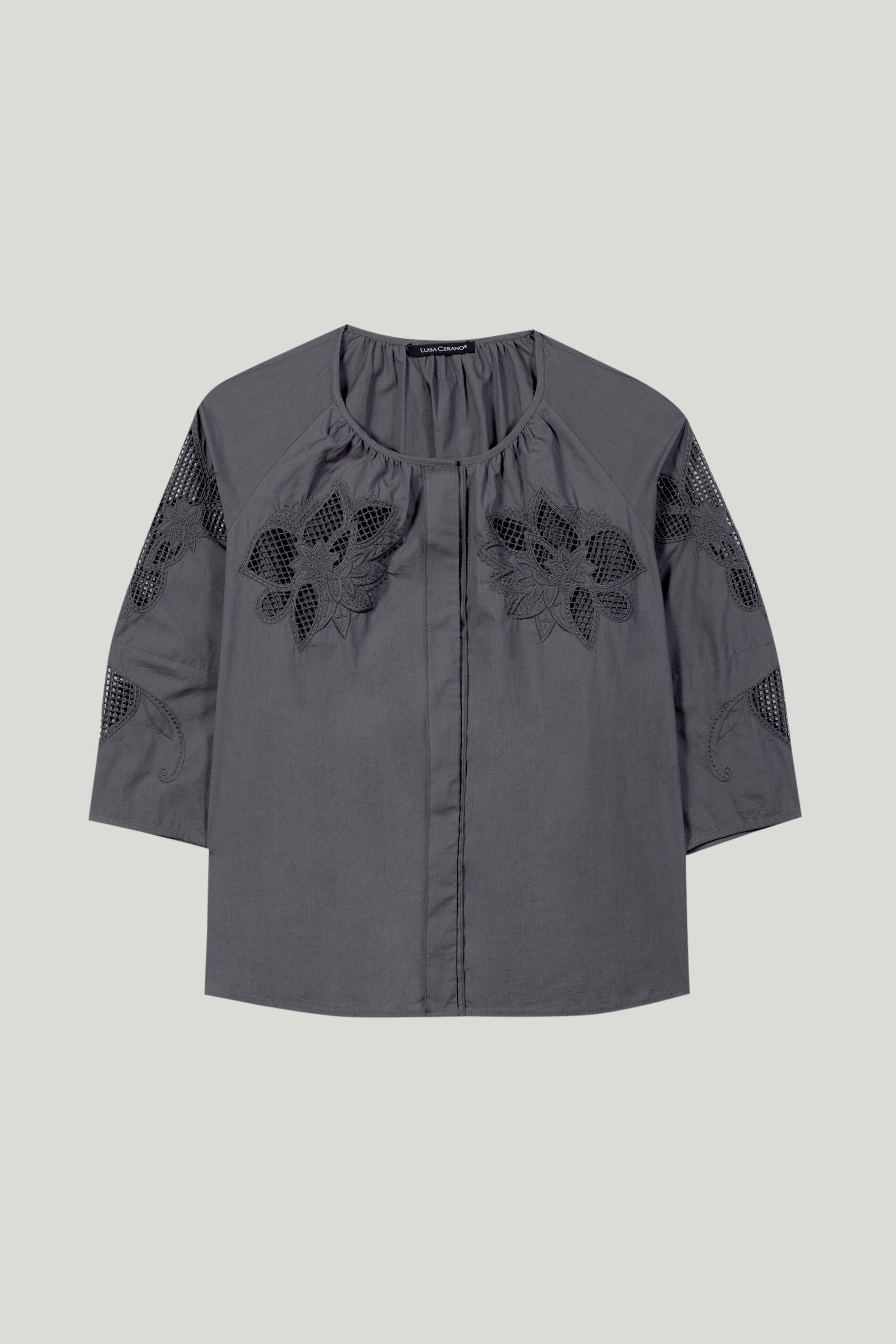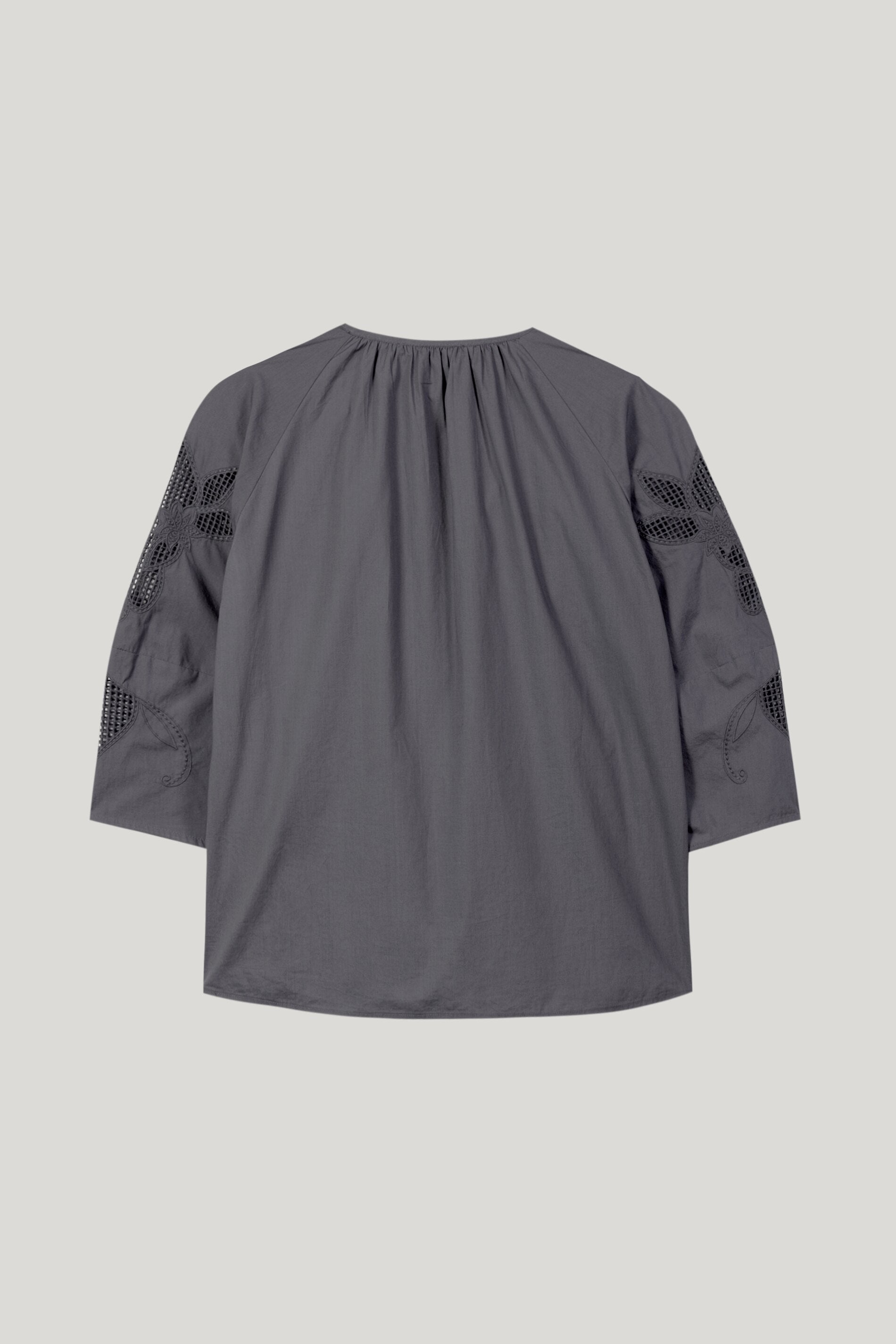 Bluse aus leichter Baumwoll-Popeline mit aufwendig platzierter Stickerei und 3/4-langen Ärmeln. Auf der Vorderseite ergänzt der V-Ausschnitt und eine doppelt gelegte Blende den Tunika-Look.